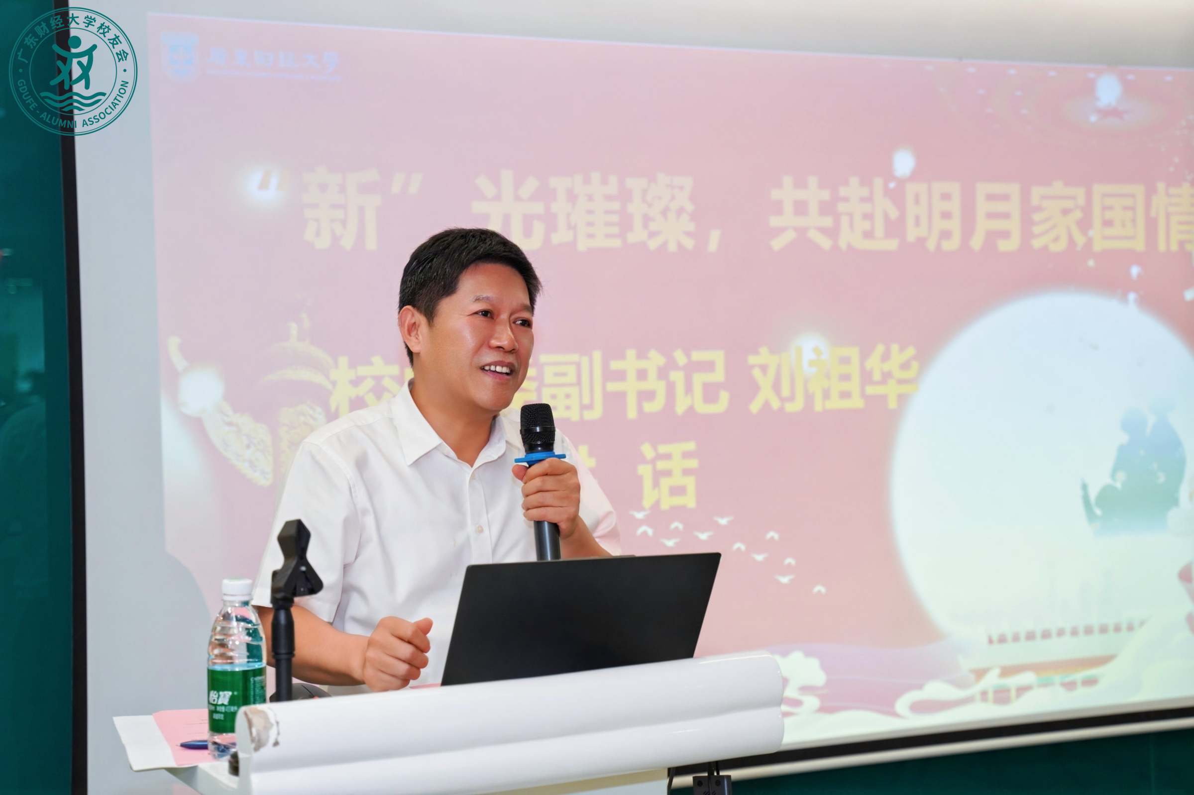 刘祖华在活动中致辞。他希望参加活动的新生,以师兄师姐为榜样,规划未来、培育情谊;鼓励大家将个人追求融入国家发展洪流,为祖国建设添砖加瓦;并强调校友会是广财人温暖的心灵家园。