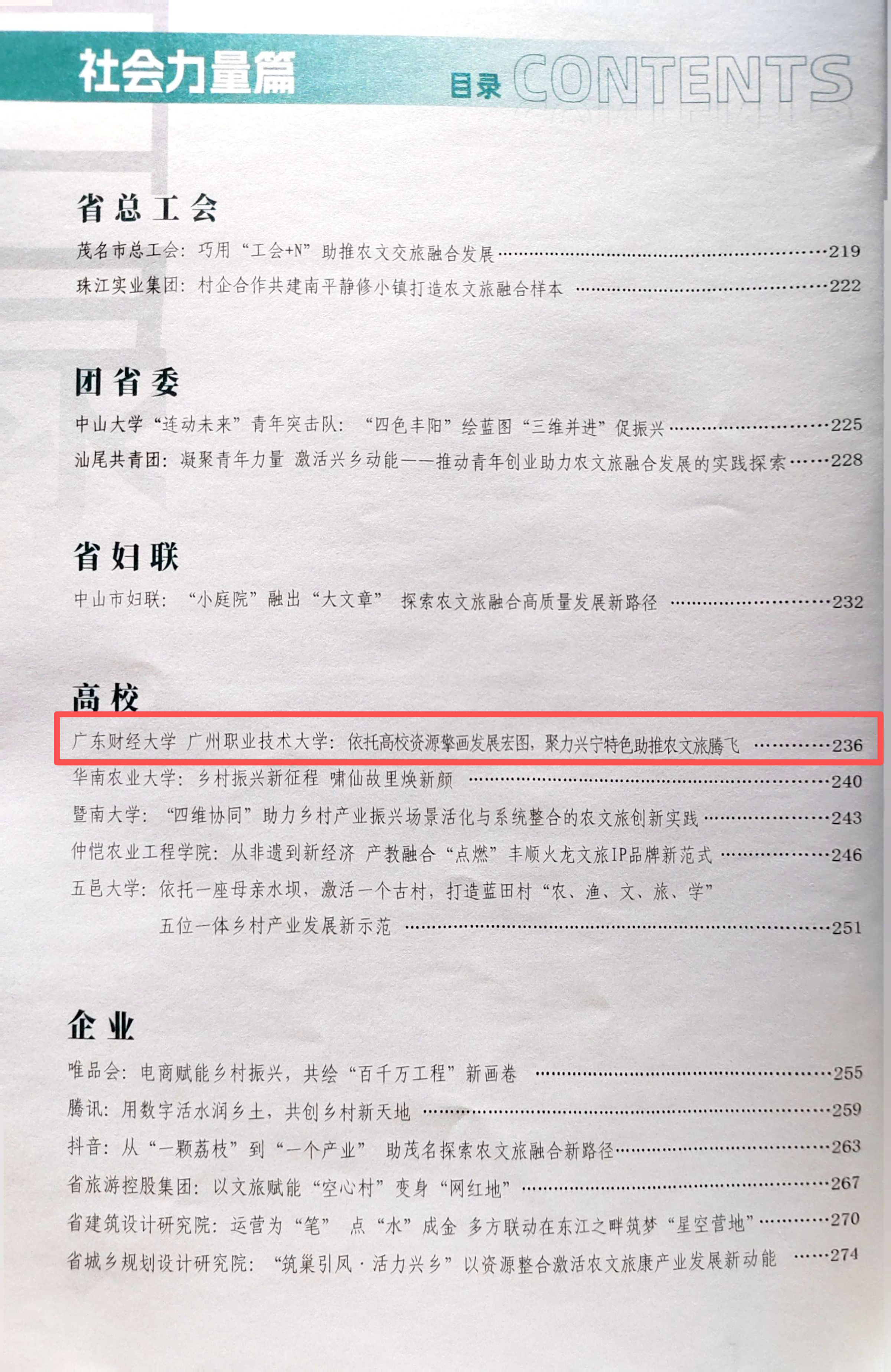 本次汇编的《广东省农文旅融合发展典型案例集》共收录58个典型案例,撷取自全省19个试点地区、21个地市,以及省工青妇、高校、企业等多个领域。我校与广州职业技术大学、兴宁市共建的成果位列高校类案例首位,这是我校“双百行动”校地协作机制在基层落地见效的生动体现。