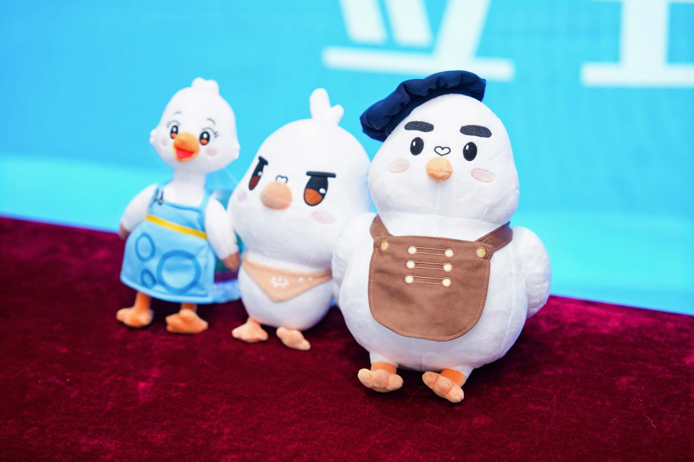 然后是鸽妈“鸽宁宁”,穿着客家蓝草颜色的围裙,是研究美食的“爱心厨神”。她的灵感来自兴宁人家的烟火日常,把一方水土的物产化作醇厚滋味,体现了“食为天,生活工作我都爱”的人生态度。