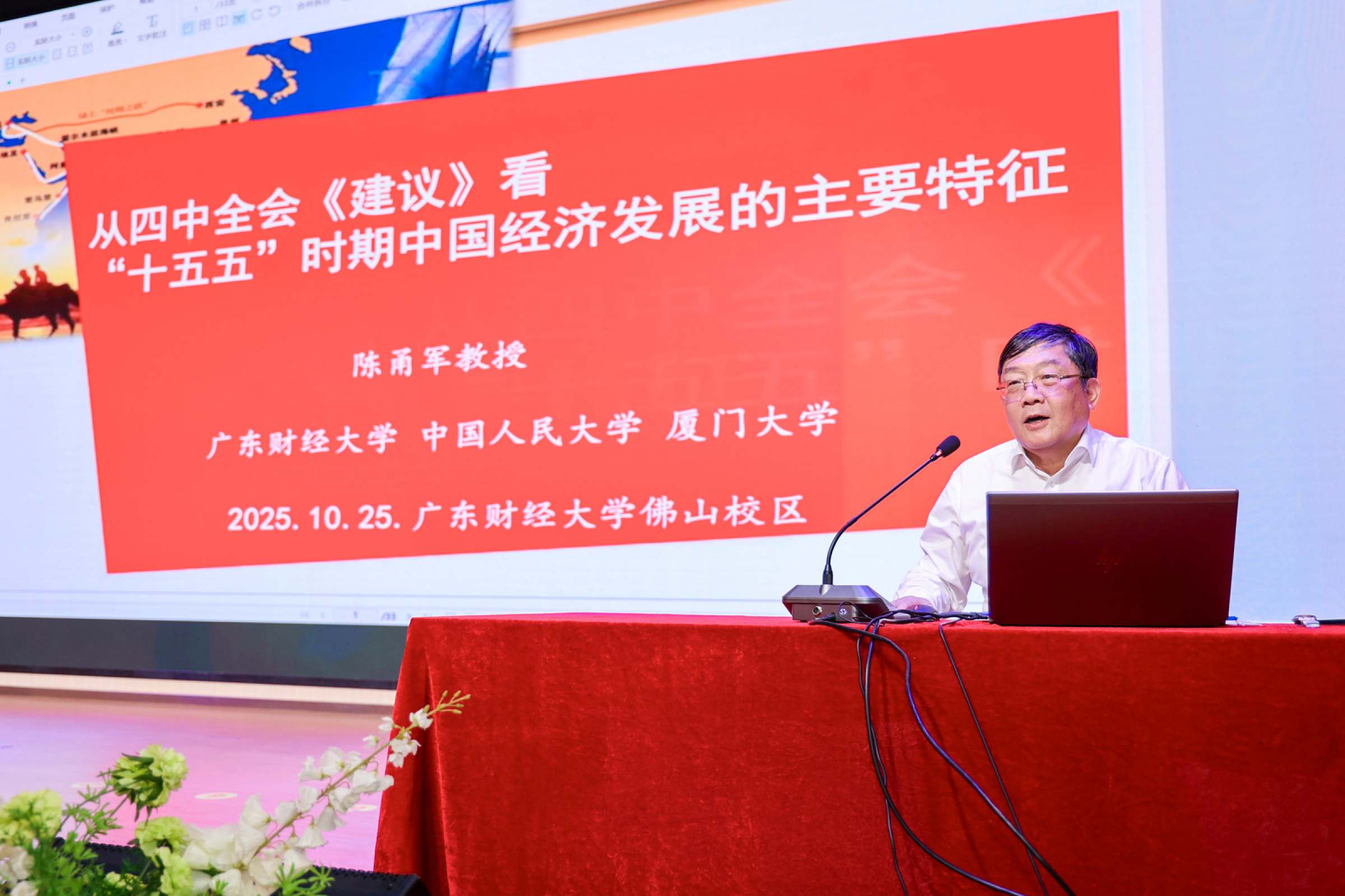 10月25日,广东财经大学发展与改革研究院特聘教授陈甬军在佛山校区为师生讲解党的二十届四中全会精神。陈甬军教授以《从四中全会〈建议〉看“十五五”中国经济的发展特征》为题,从“十五五”规划的内涵提炼的基本点出发,通过翔实数据和生动案例,阐释了未来中国经济高质量发展的特征与走向,并对青年学子的发展机遇提出了建议。