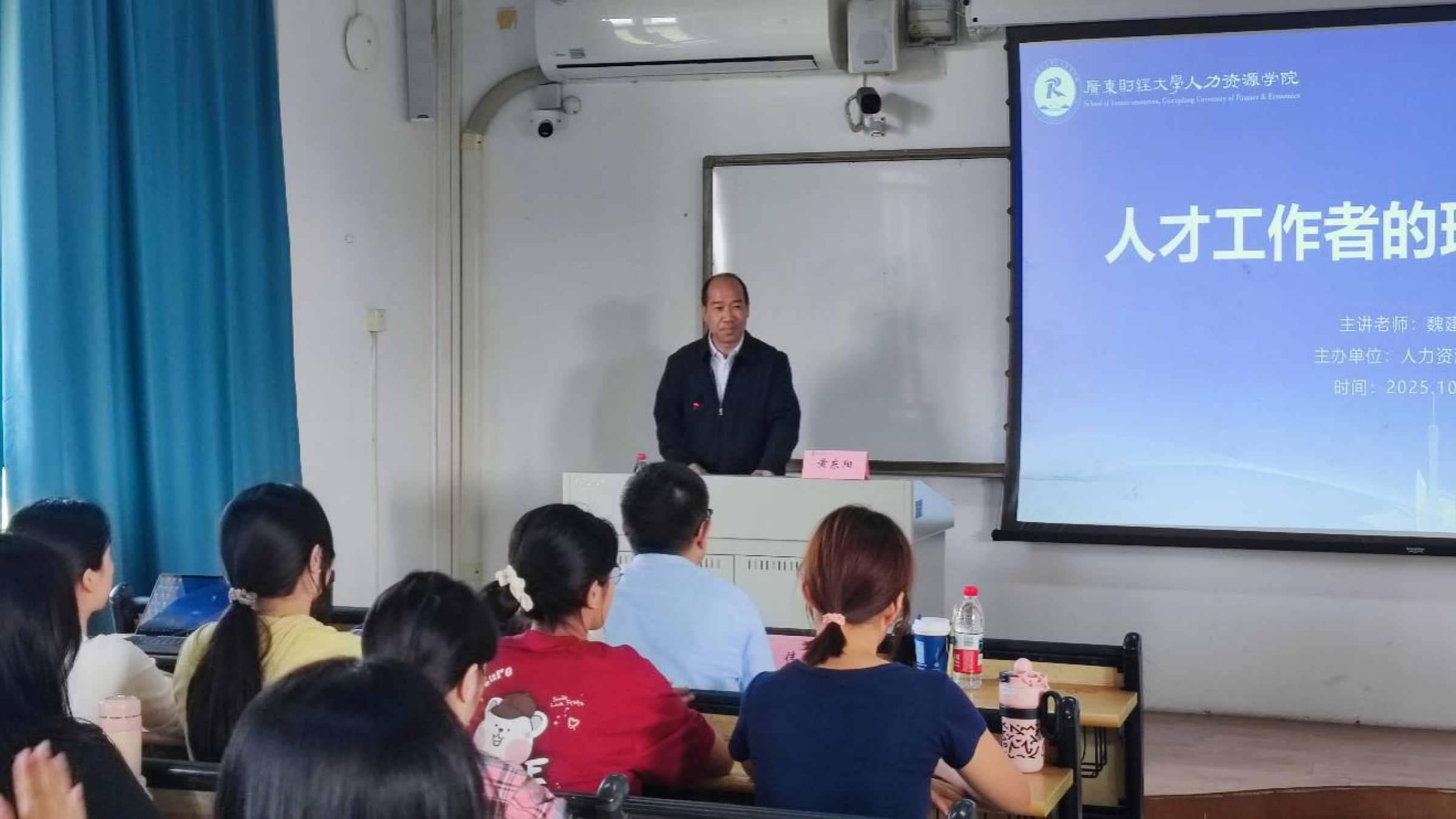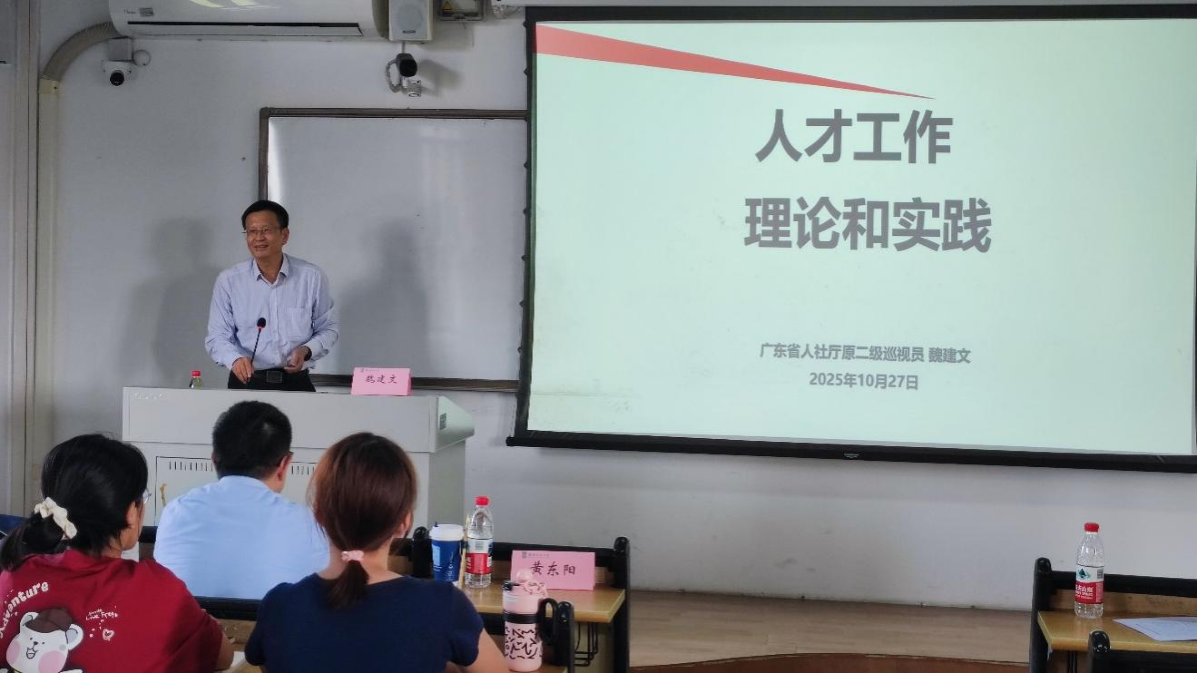 10月27日下午,人力资源学院举办2025至2026学年首期“启航大讲堂”,邀请了广东省人力资源和社会保障厅原二级巡视员魏建文作题为“人才工作者的理论和实践”专题讲座。学院党委书记黄东阳,副书记阮方明,副院长宋一晓、魏伟,人才系马银坡博士以及2024级、2025级人才发展与管理专业学生参加活动。
