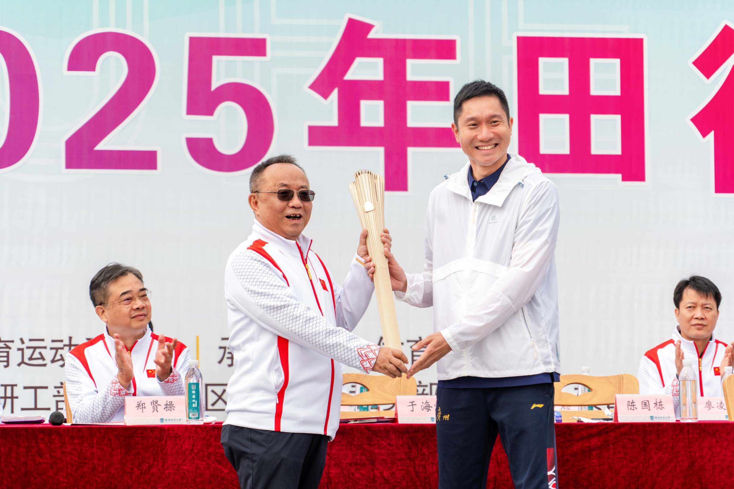 随后,伍立斌将第十五届全国运动会及残特奥会火炬“绽放”赠予我校,于海峰郑重接过。该火炬以“融”与“荣”为设计核心,不仅是体育荣光的见证,更是校企携手、共育未来,让希望与梦想之火在校园璀璨绽放的动人象征。