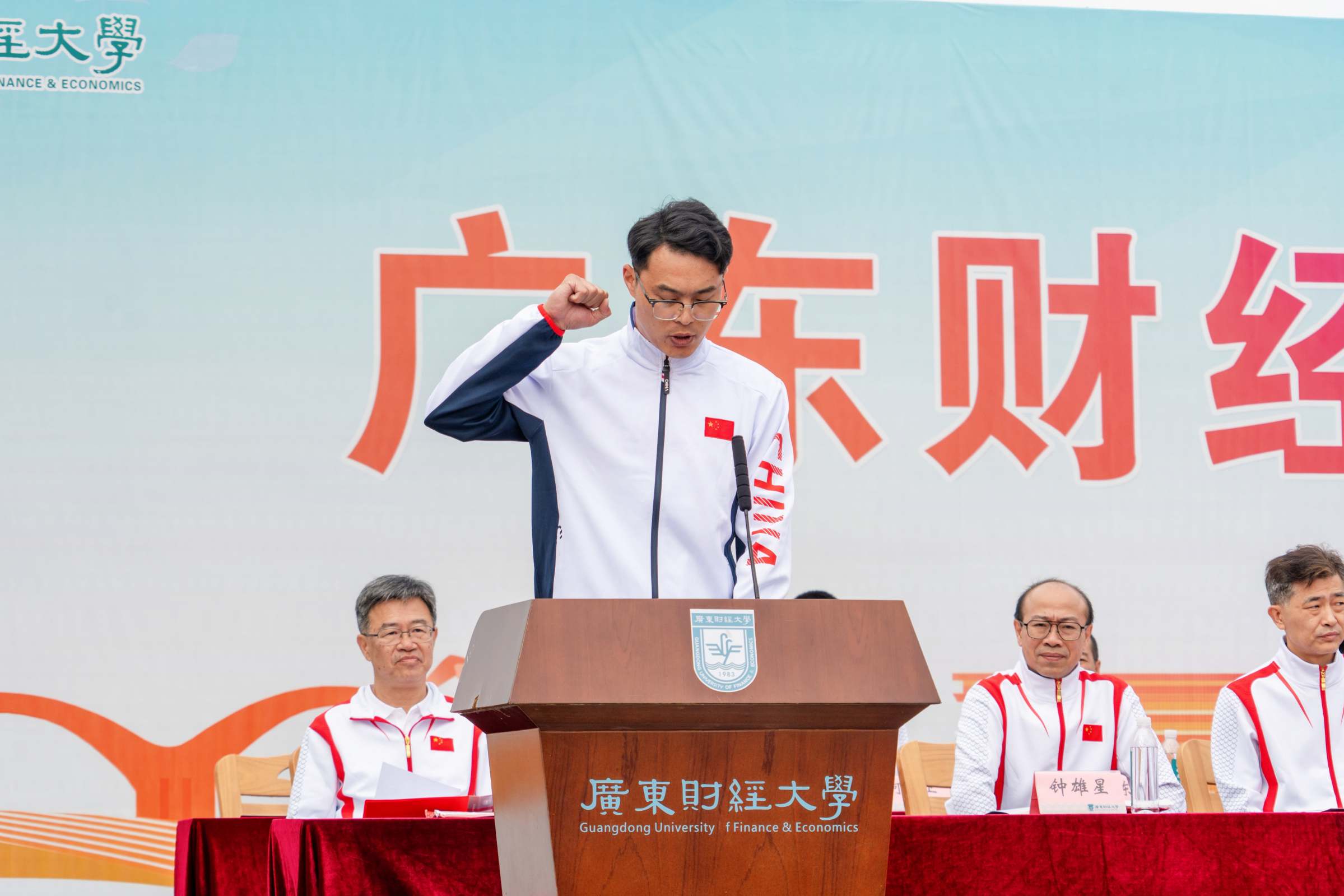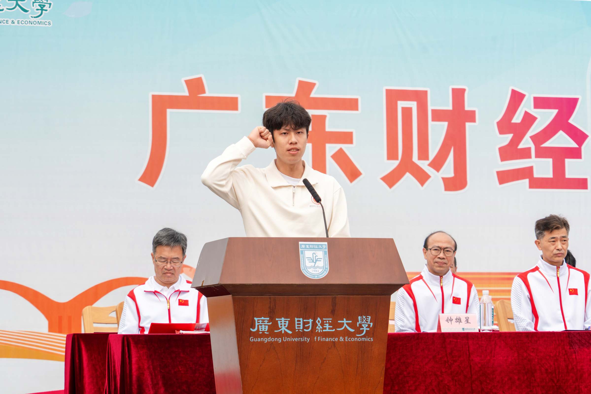 随着郑贤操宣布“广东财经大学2025年田径运动会正式开幕”,全场掌声雷动。经济学院何家乐代表运动员、体育学院袁宾峰代表裁判员庄严宣誓,承诺恪守体育精神、秉持公平公正原则。