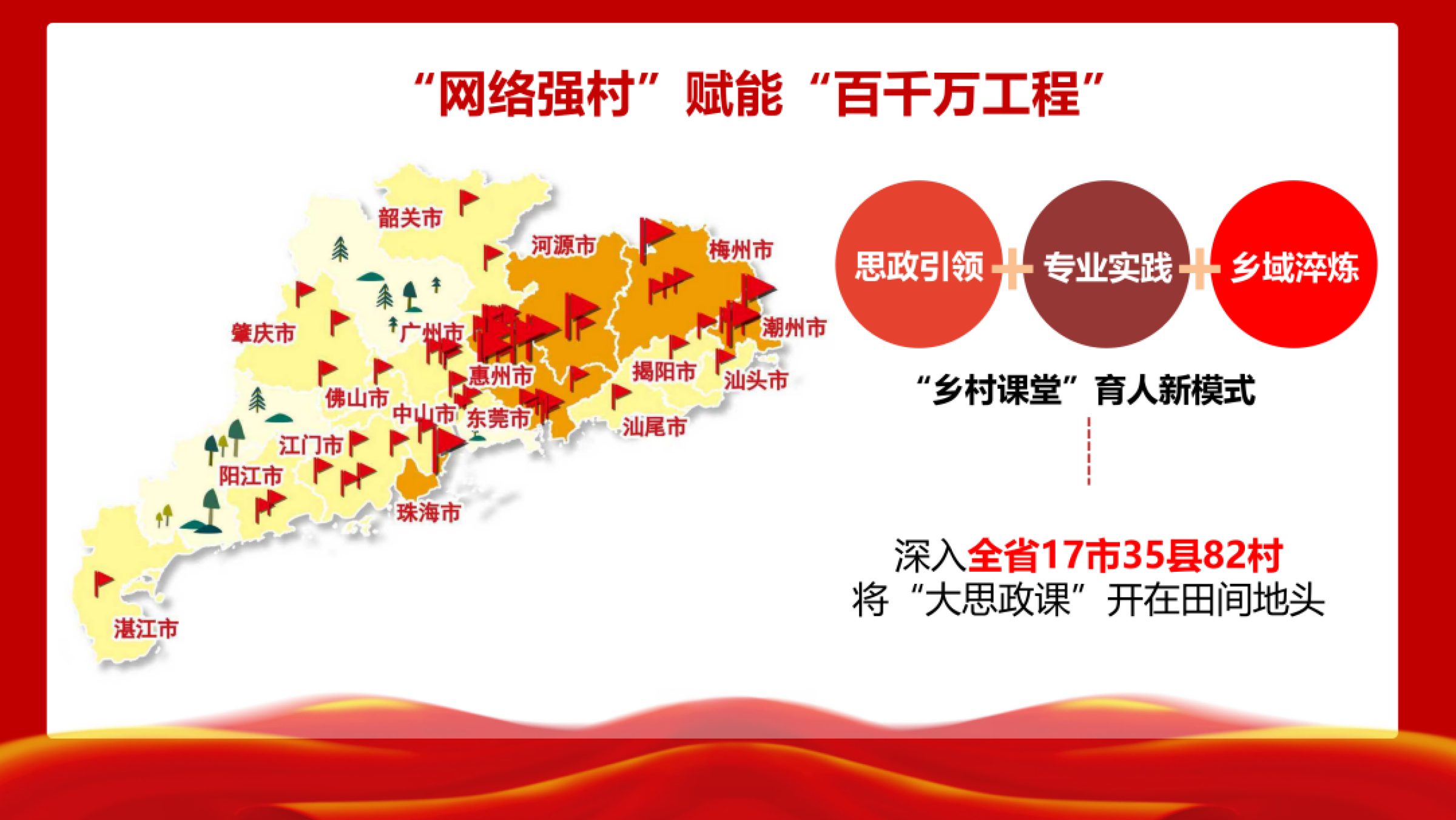 课程开篇立足“时代赋予的青年使命”,清晰阐释乡村振兴战略与“网络强村”赋能“百千万工程”品牌项目的核心要求。在“践行担当”篇章,课程集中展示了广财师生扎根广东乡村的青春实践。学校组建“百千万工程”突击队,连续三年结对数量位居全省高校前列。团队在省委网信办指导下创新推出“政府 + 高校 + 镇村 + 媒体”的“网络强村”工作模式,将现代科技与创新思维带入乡村。师生用镜头记录非遗文化,设计文创作品,编制乡村规划方案,形成了一批有温度、有影响力的实践成果。在“挺膺担当”篇章,课程聚焦青年具体行动指南,提出“学一项接地气技能、做一次走基层实践、守一份文化传承初心”的成长路径,创新“乡村课堂”育人模式,将“大思政课”开在田间地头。
