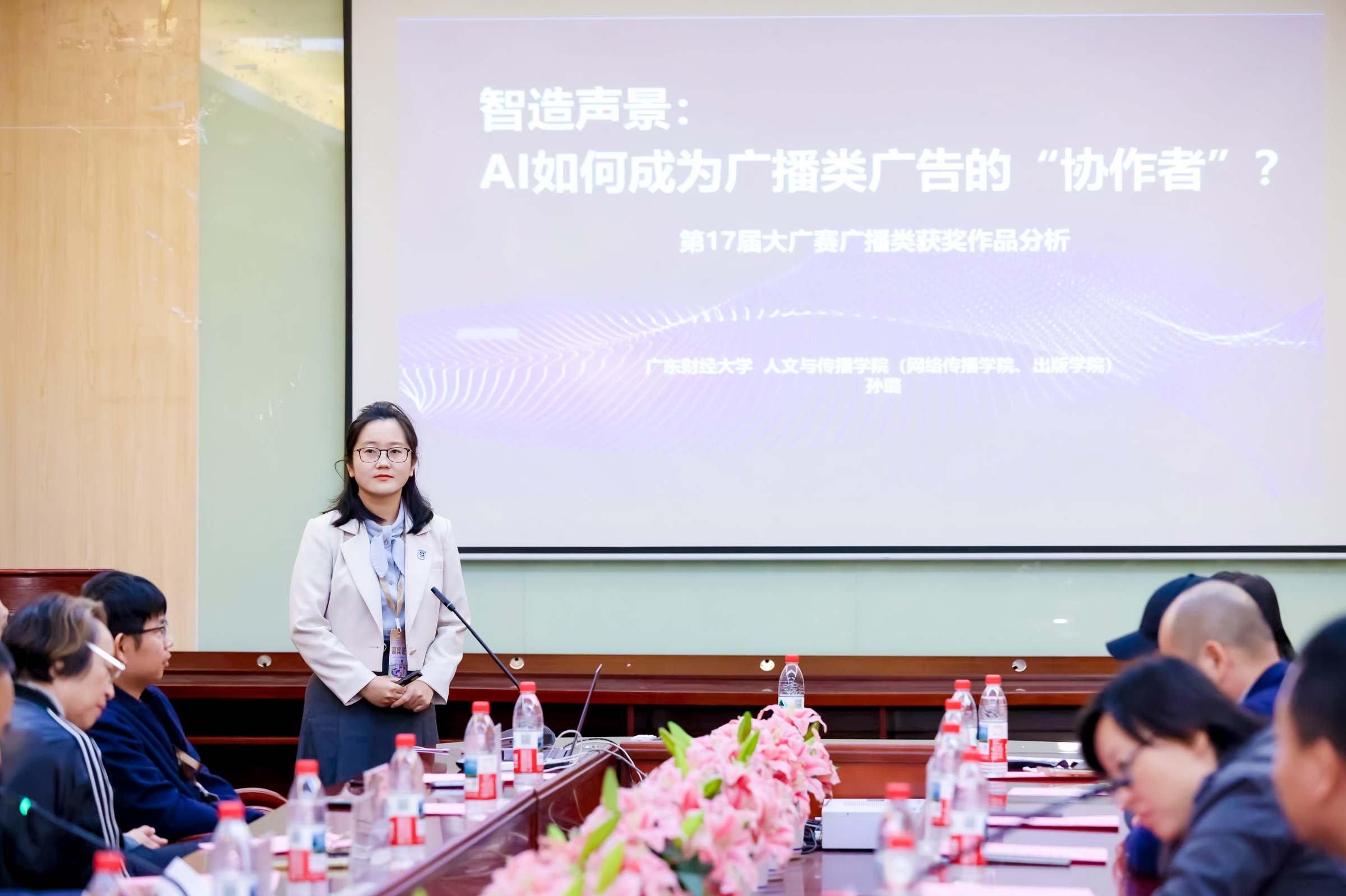 我校孙璐老师作为优秀指导教师在“大广赛”广东赛区总结交流会中发言,她围绕“智造声景:AI如何成为广播类广告的‘协作者’?”为主题,分享了技术应用路径与我校特色的参赛经验,展现了我校在实践教学中的创新探索。