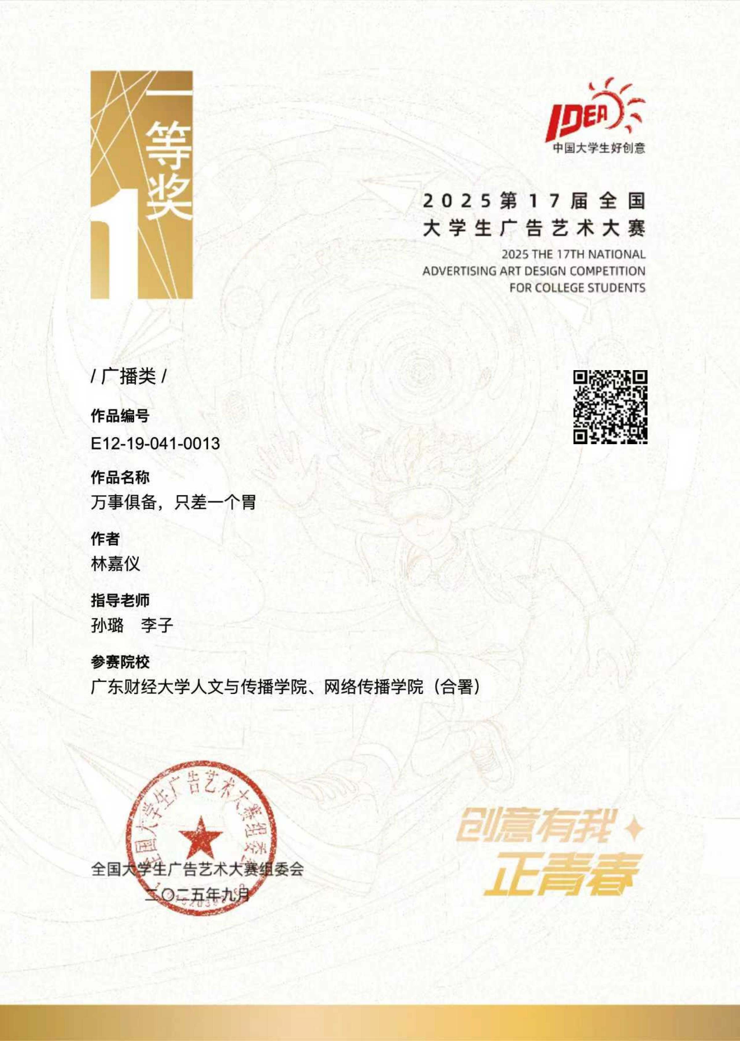 11月22日,2025第17届全国大学生广告艺术大赛(简称“大广赛”)广东赛区颁奖总结交流活动在广州商学院举行。我校人文与传播学院(网络传播学院、出版学院)2024级新闻与传播专业硕士生林嘉仪凭借出色的创意和AI语音合成技术荣获广播类广告国赛一等奖,该作品由孙璐、李子老师指导。全省仅有19个作品获得国赛一等奖。