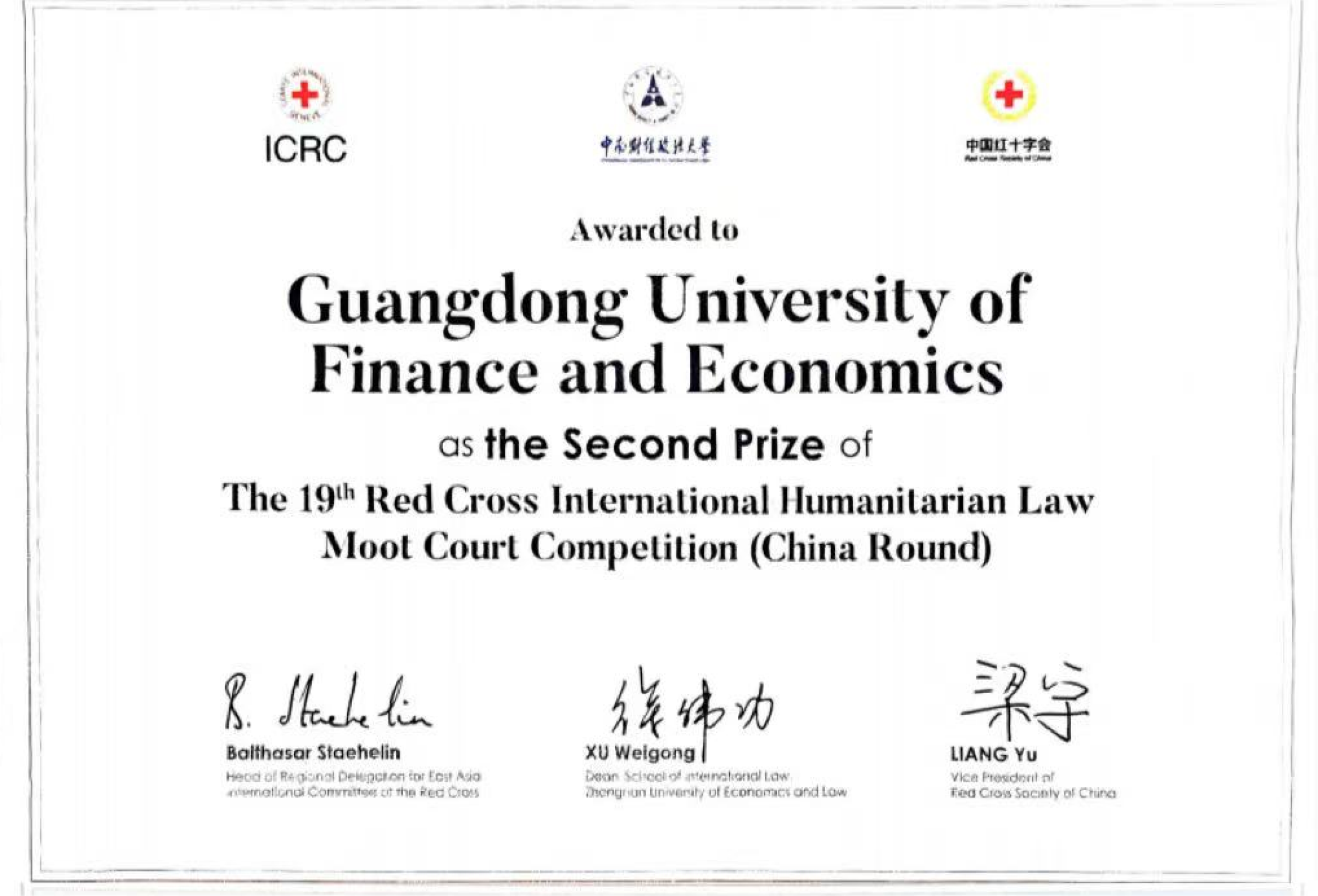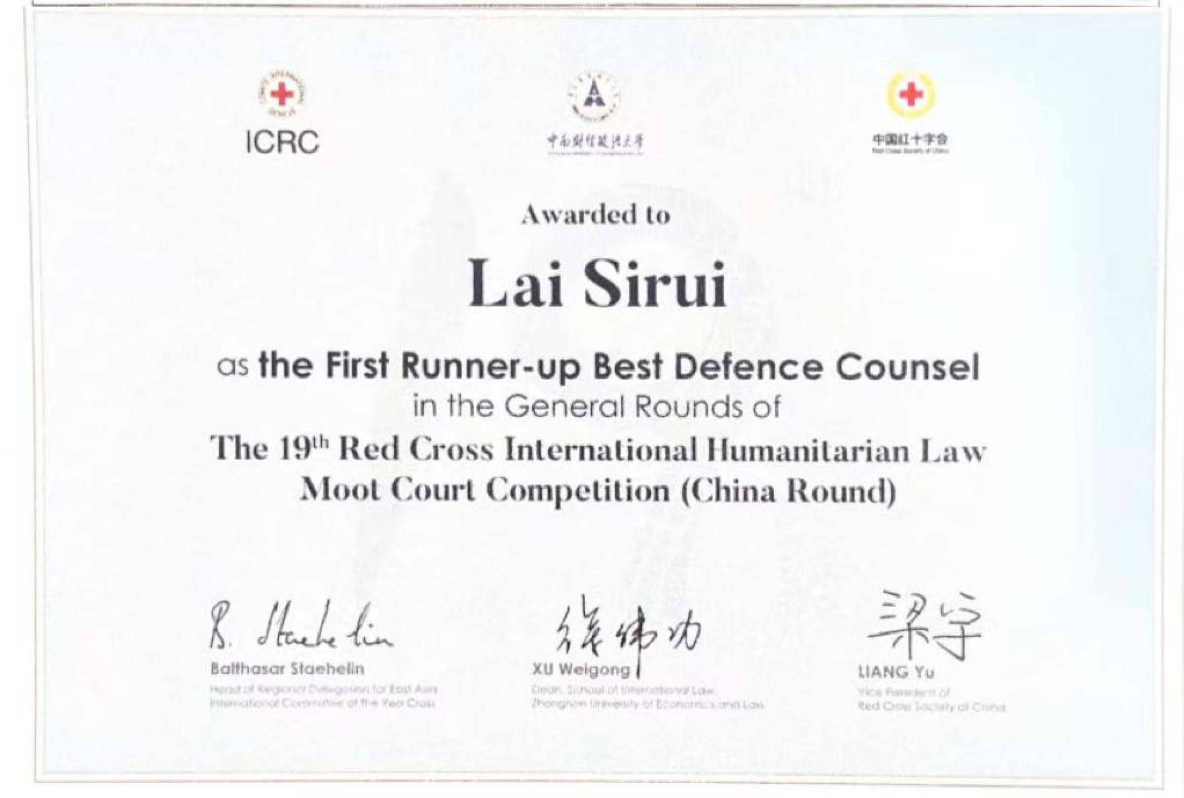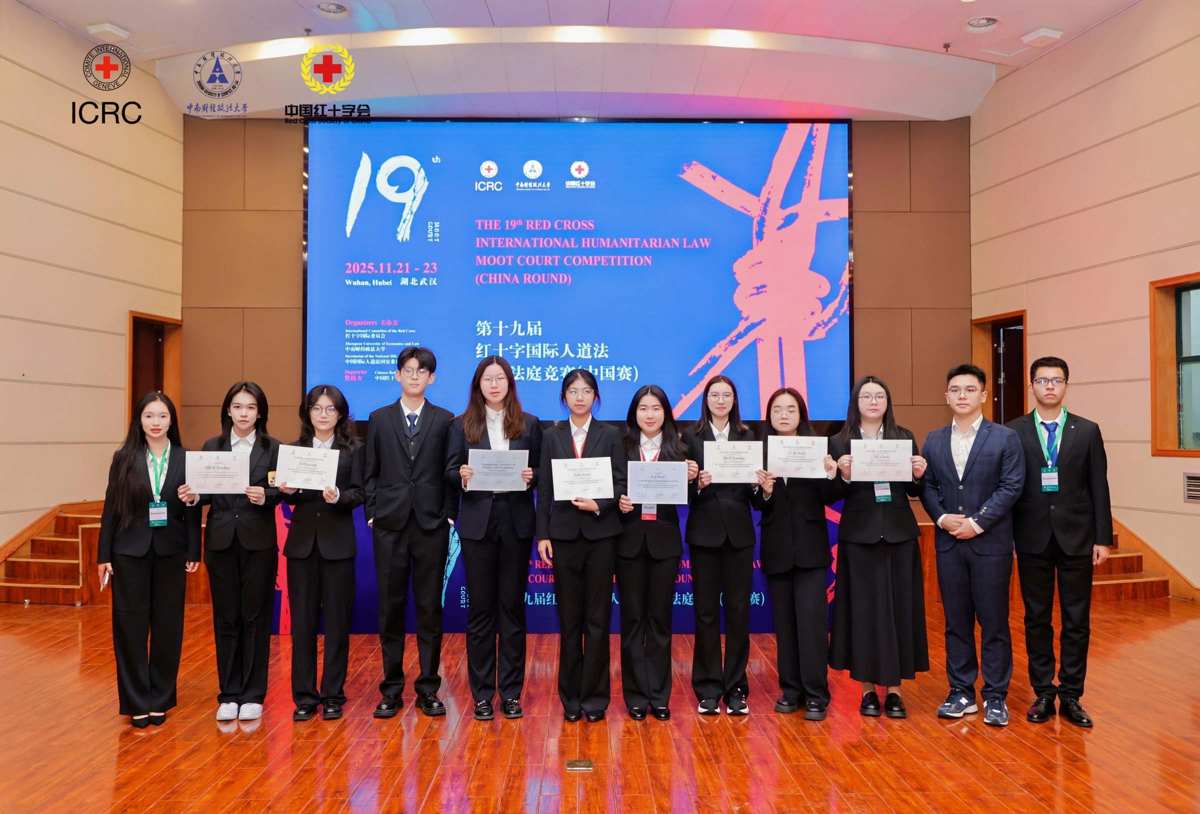 11月21日至23日,第十九届红十字国际人道法模拟法庭竞赛(中国赛区)在中南财经政法大学举行。本届竞赛由红十字国际委员会、中国国际人道法国家委员会秘书处、中南财经政法大学共同主办,吸引了包括北京大学、清华大学在内的全国74所高校参加。该项赛事全程使用英语,由外交部条法司等政府机构人员、红十字国际委员会法律顾问、学术界等专业人士担任法官。我校法学院代表队首次参赛,荣获全国二等奖;赖思睿同学荣获“初赛最佳辩护人第二名”。