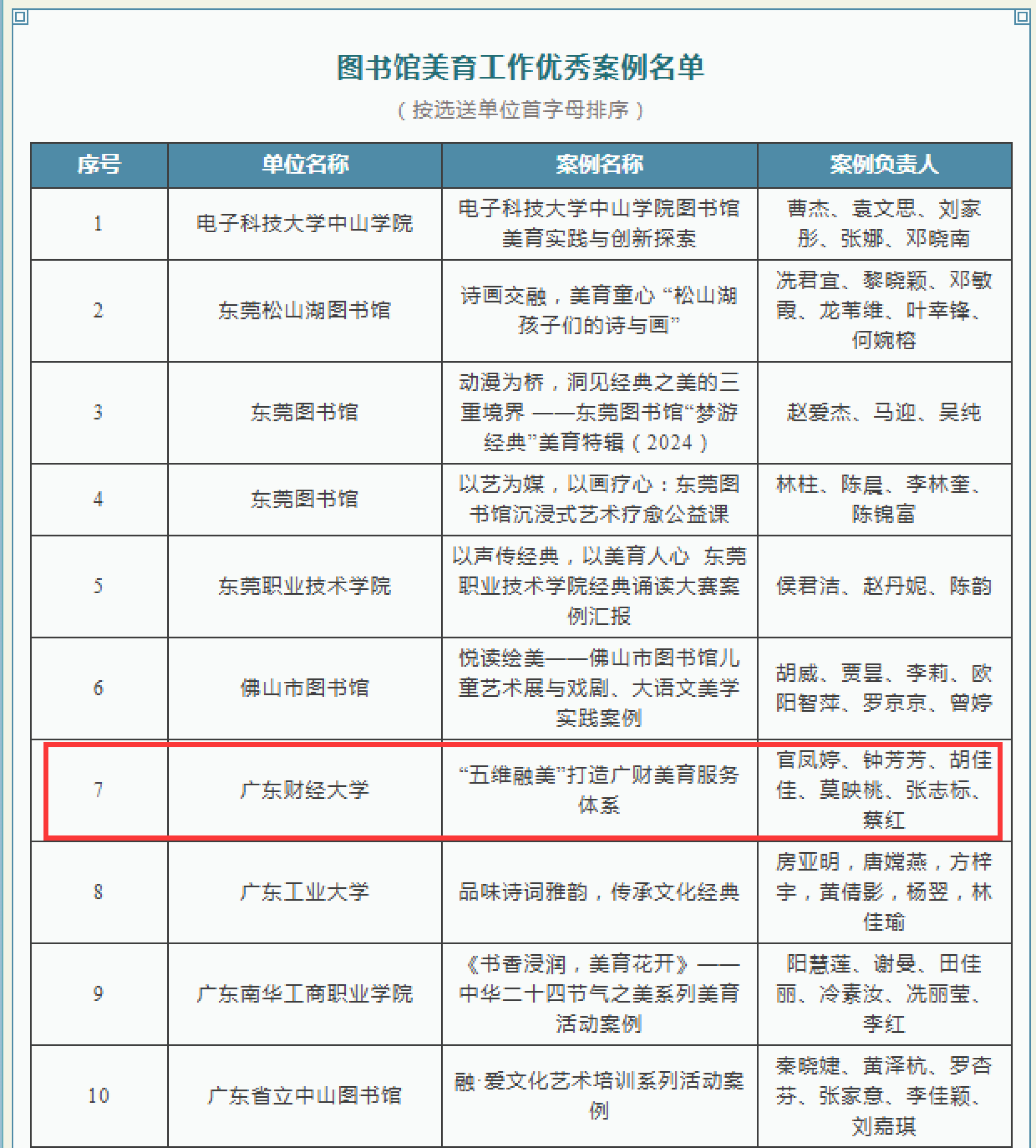 近日,首届广东省“书香浸润”图书馆美育工作案例征集活动评选结果揭晓。我校图书馆提交的案例《“五维融美”打造美育服务体系》,在全省79家图书馆报送的91份参评作品中脱颖而出,入选优秀工作案例,充分彰显了我校在图书馆美育融合实践中的创新实力与育人成效。