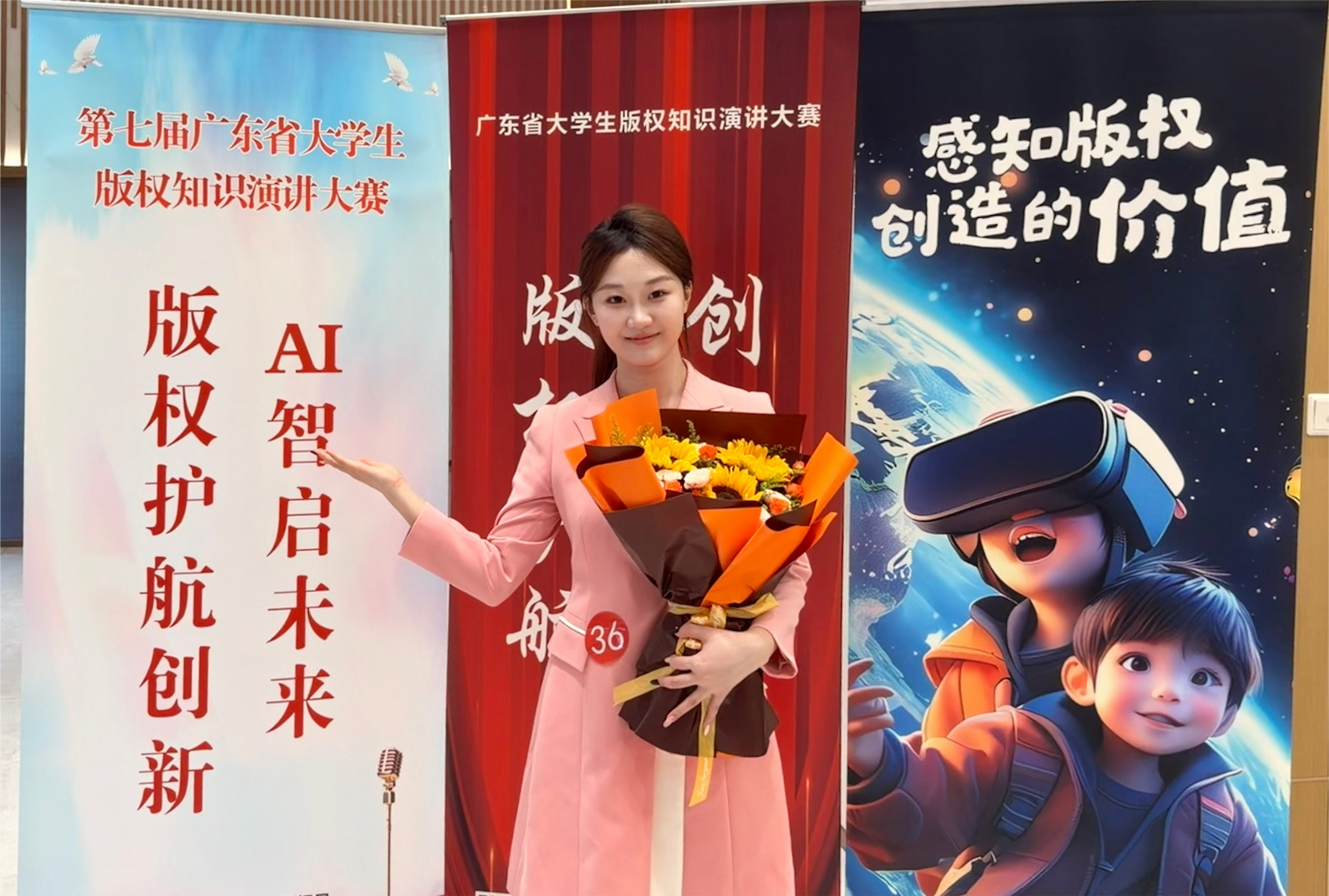 11月29日,由广东省版权局主办、广东省版权保护联合会承办的第七届广东省大学生版权知识演讲大赛决赛在广州市黄埔区华南版权服务大厅落幕。我校湾区影视产业学院2025级播音与主持艺术专业的王一乔同学凭借扎实的版权知识储备与出色的演讲表现,荣获大赛三等奖。