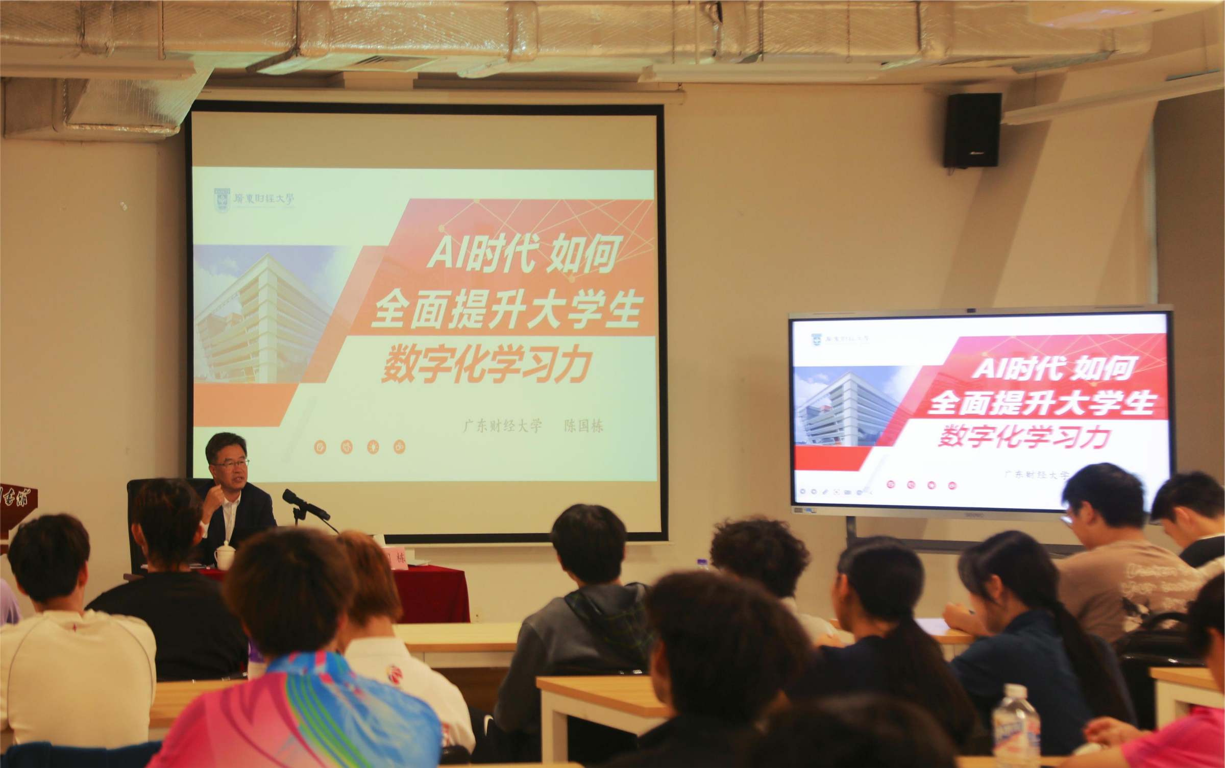 12月2日,副校长陈国栋在图书馆801室,为体育学院2025级体能训练1班与工商管理学院2024级工商管理(创业管理方向)1班讲授形势与政策课。本次课程主题为“AI时代如何全面提升大学生数字化学习力”。校团委书记朱戈,体育学院党委书记郑田、院长边宇,体育学院体竞教工党支部教师与同学们一同参与学习。