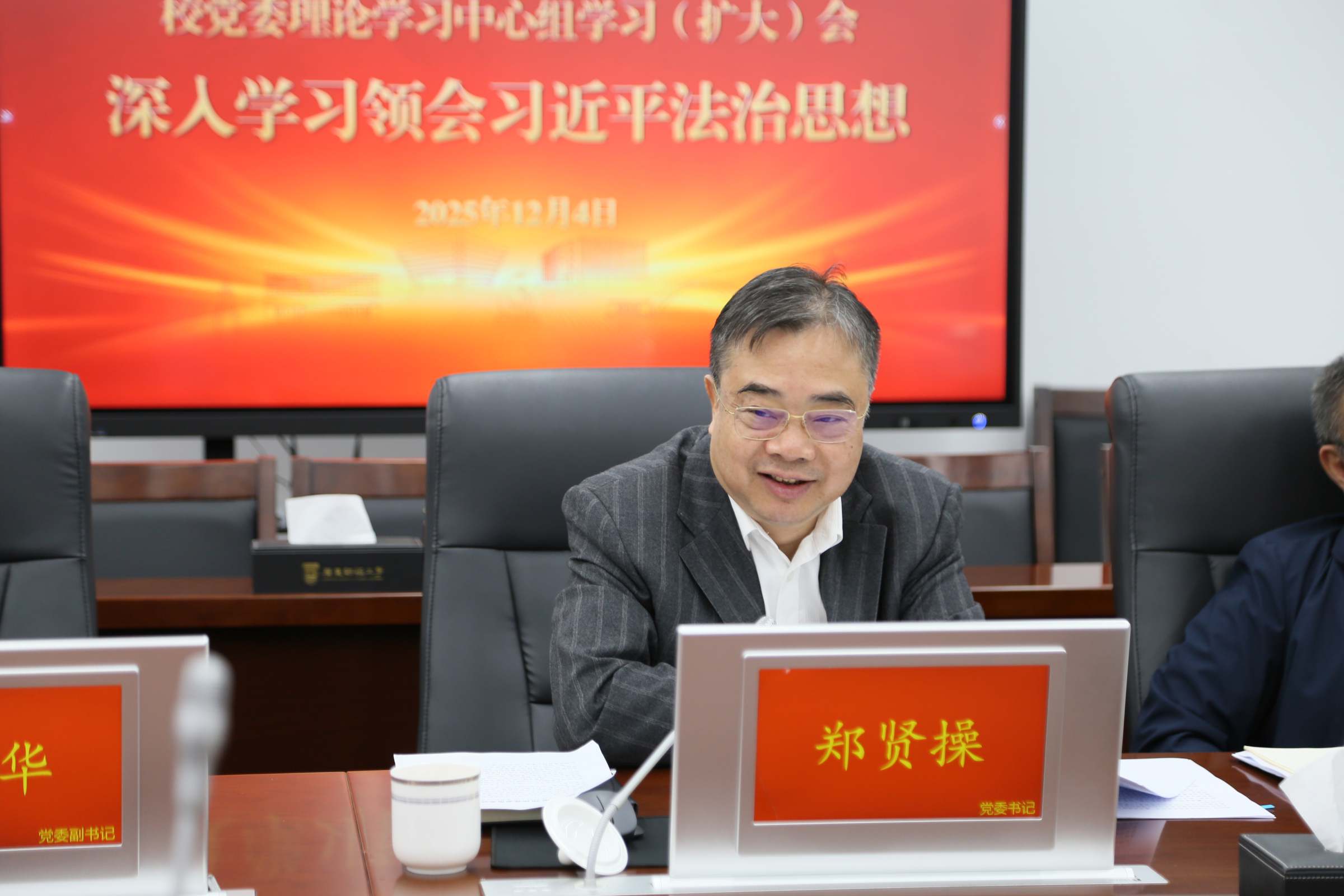 12月4日上午,学校召开校党委理论学习中心组(扩大)会议,深入学习领会习近平总书记重要指示精神和中央全面依法治国工作会议精神,认真学习《习近平法治文选》第一卷和《习近平法治思想学习纲要(2025年版)》。校领导、校法治工作领导小组成员单位负责人参加会议,校党委书记郑贤操主持会议,副校长鲁晓明、党政办主任张鹏程、法学院党委书记陈静作重点交流发言。