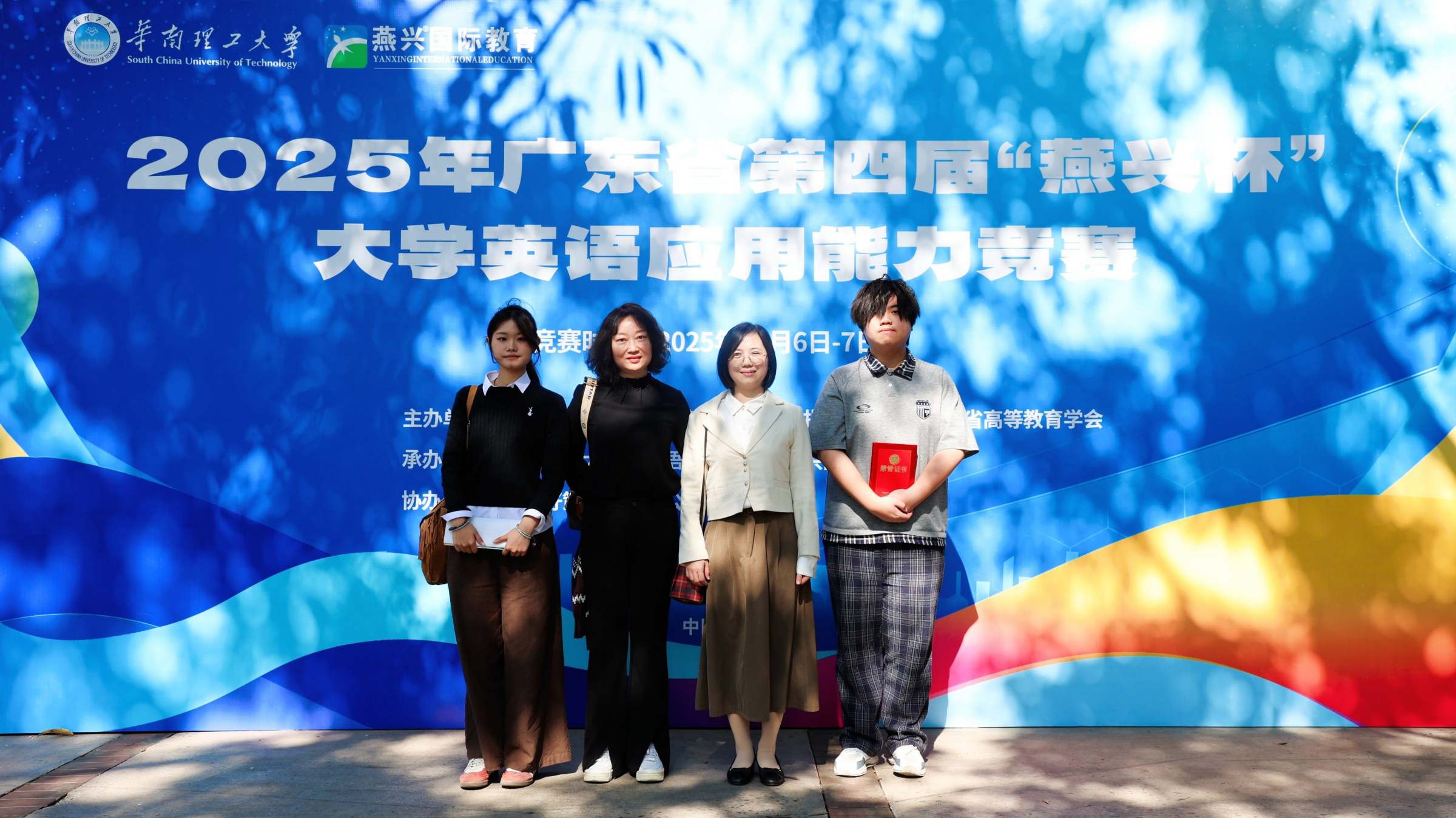 12月7日,广东省第四届“燕兴杯 ”大学英语应用能力竞赛决赛在华南理工大学落下帷幕。我校外国语学院马玉梅老师指导的2025级法学2班李舞凤同学、蔡歆老师指导的2025级法学(中外联合培养项目班)1班章子墨同学双双荣获综合能力一等奖,章子墨同学还同时荣获阅读单项一等奖。