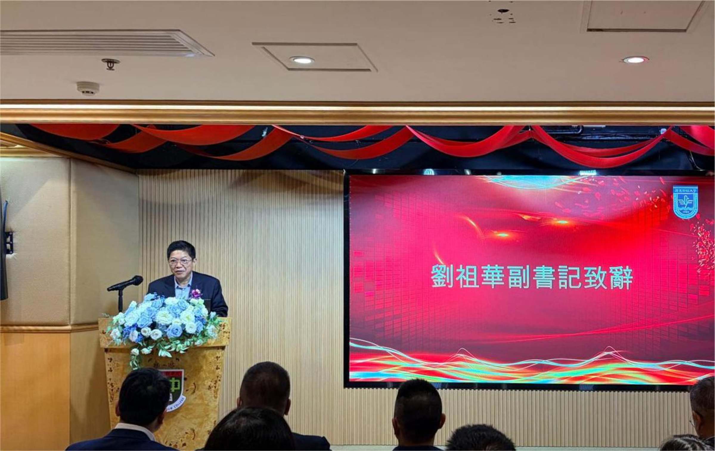 在庄严的国歌声中,大会正式拉开帷幕。刘祖华代表学校致辞,对澳门校友会的成立致以热烈祝贺,并向在澳校友们转达了母校的亲切问候。他指出,澳门校友会的成立,填补了学校全球校友网络在粤港澳大湾区这一关键区域的重要空白,标志着校友事业开启崭新篇章。他对澳门校友会提出四点寄语:一要广泛团结校友,共建“温馨家园”;二要着力搭建资源平台,打造“赋能引擎”;三要积极传递母校精神,担当“文化使者”;四要主动服务湾区建设,贡献“广财智慧”。