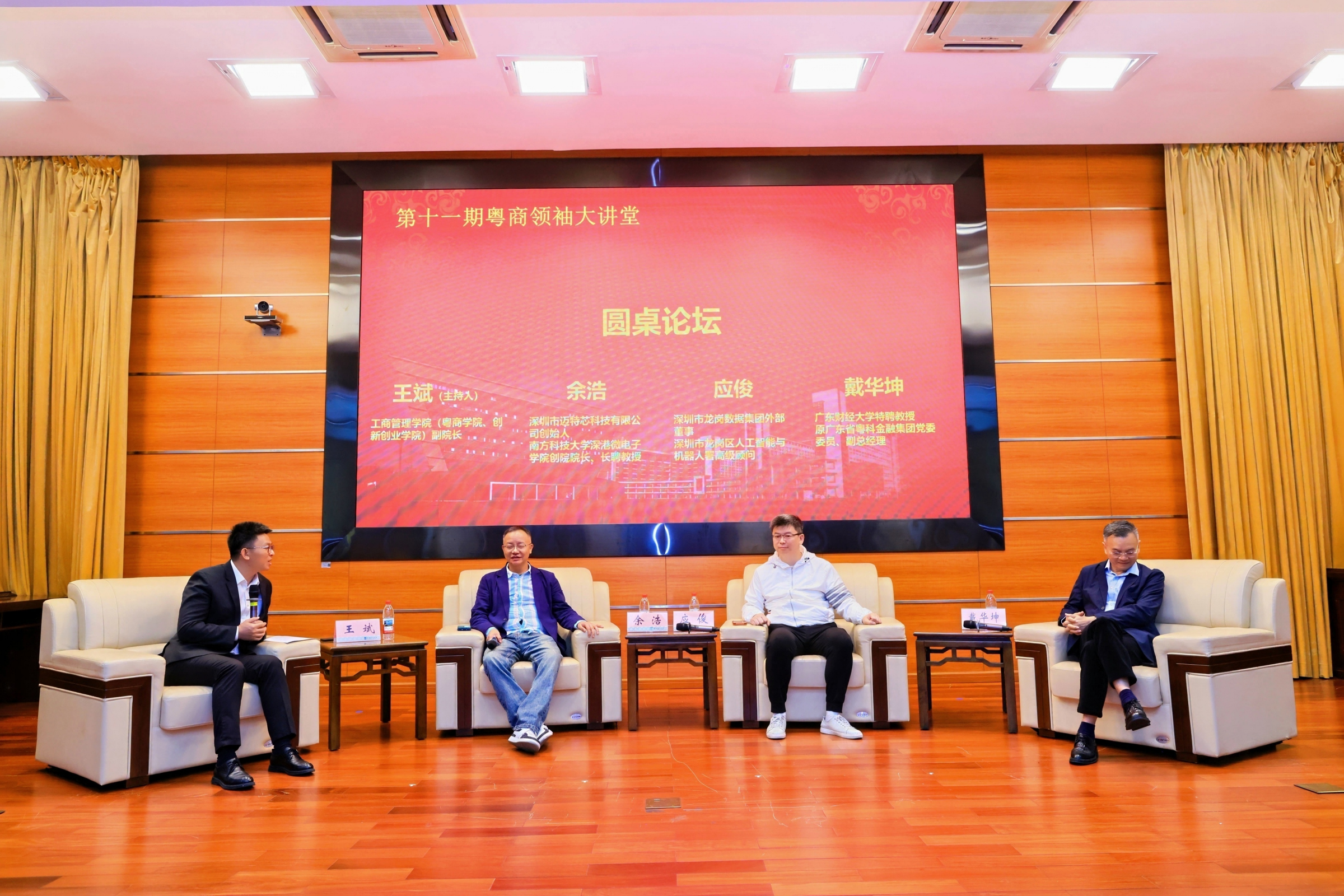 在圆桌论坛环节,余浩、应俊、工商管理学院(粤商学院、创新创业学院)戴华坤老师围绕“AI赋能粤商高质量发展的新赛道与新场景”,与现场师生、企业家展开了交流与讨论。