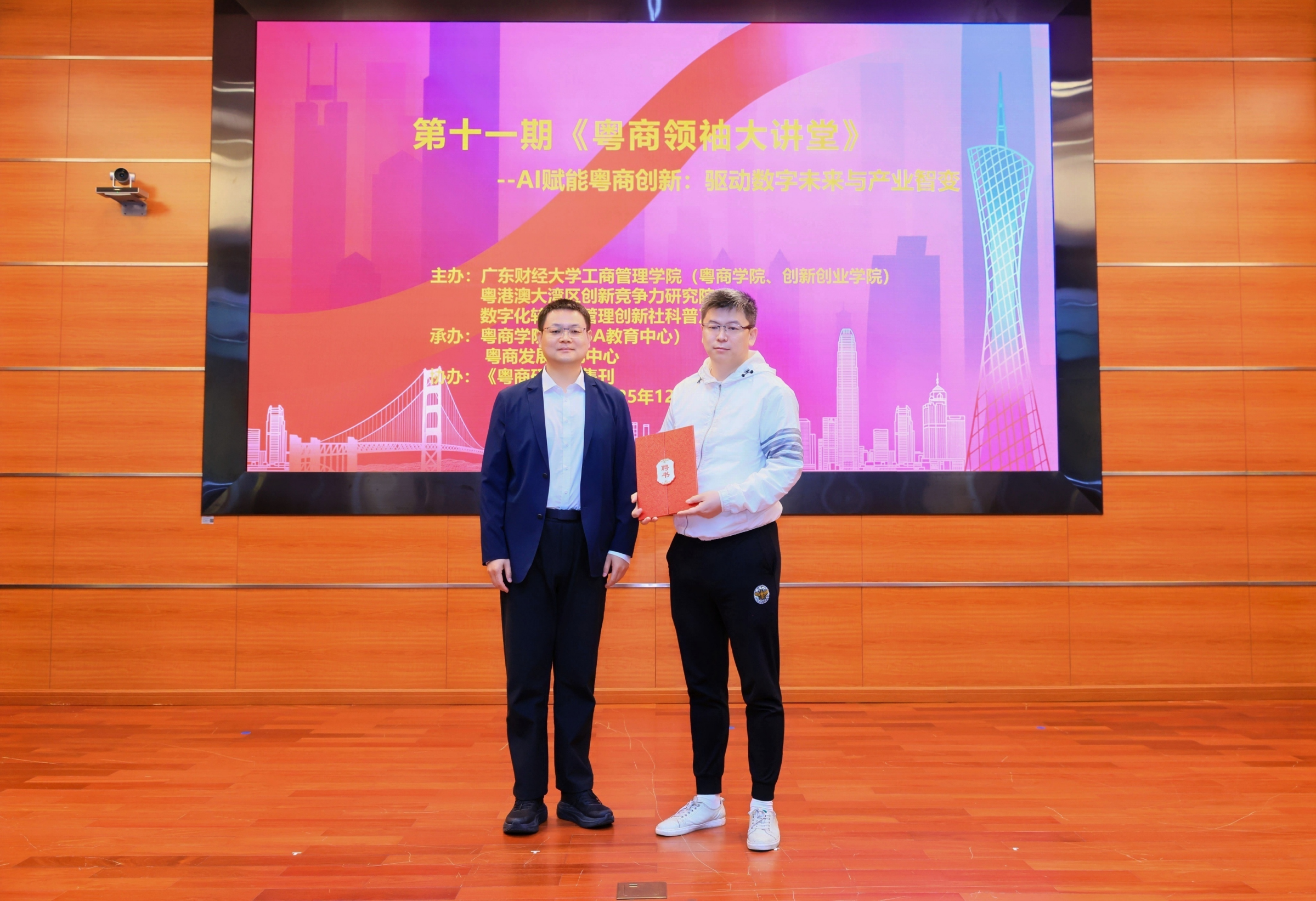 近日,我校第十一期粤商领袖大讲堂在勤学楼408室举行。本次大讲堂以“AI赋能粤商创新:驱动数字未来与产业智变”为主题,邀请人工智能领域的学者专家共同探讨粤商在人工智能时代的发展路径。学校党委常委、副校长雷宇出席活动并致辞。工商管理学院(粤商学院、创新创业学院)院长马宗国、副院长王斌,以及粤商企业家代表、师生代表等近200人参加活动。马宗国主持活动。