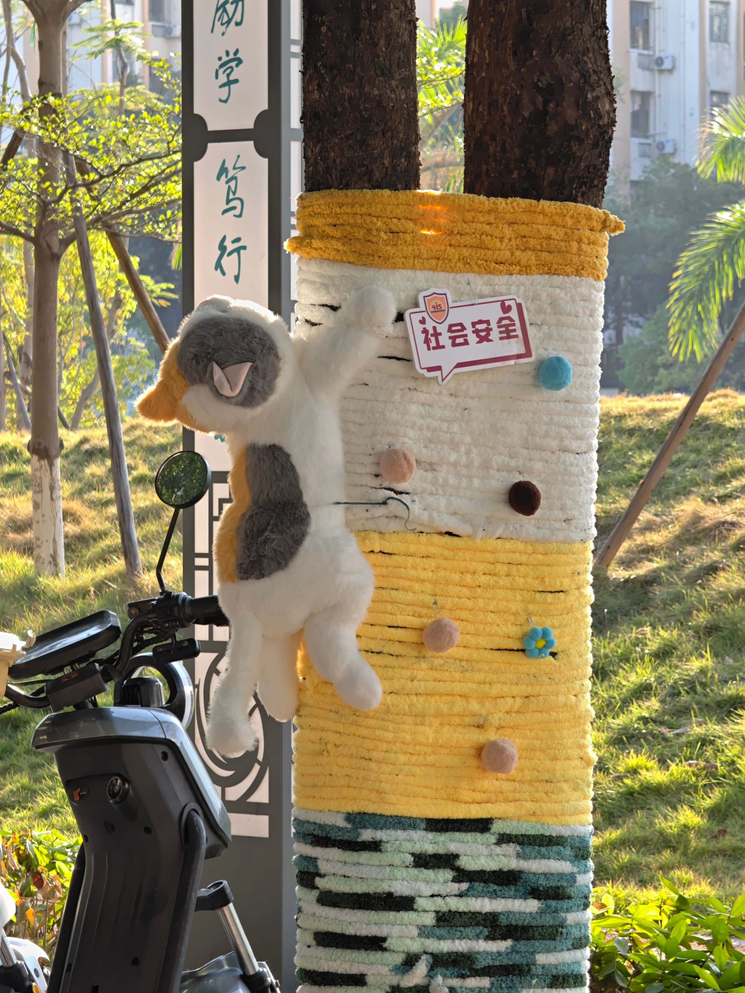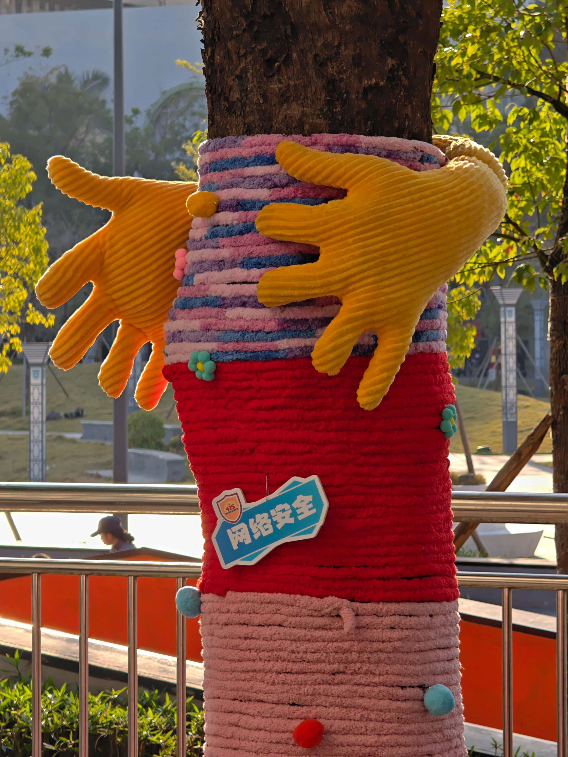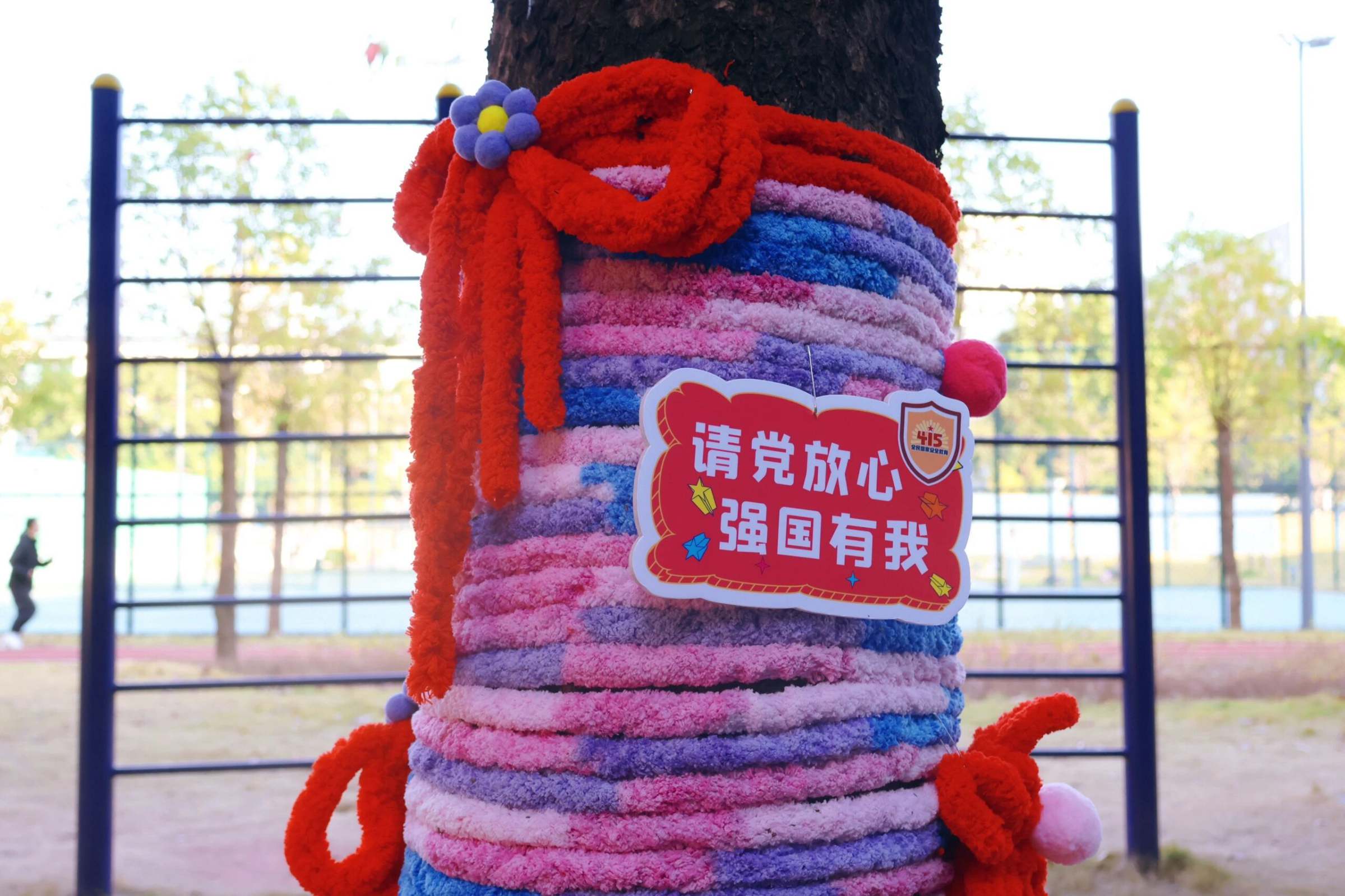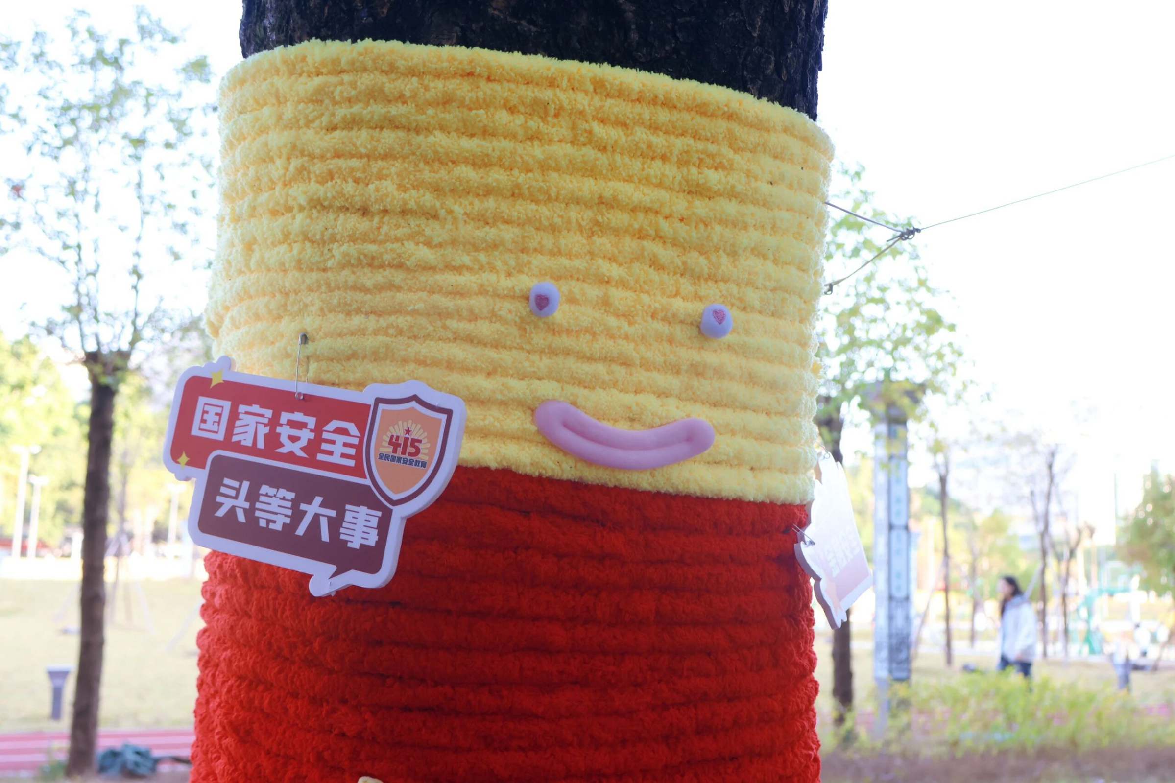值得一提的是,大湾体育公园两旁主干道上的树木还换上了“温暖新装”,柔软的彩色毛衣裹住树干,成为本次活动的创意亮点。每棵“毛衣树”上都搭配着主题展板,涵盖政治安全、军事安全、国土安全、经济安全等内容。过往师生纷纷驻足打卡。这种贴近生活的创新形式,让抽象的“总体国家安全观”变得可触摸、可阅读,在温暖浪漫的氛围中让国家安全知识深入人心。