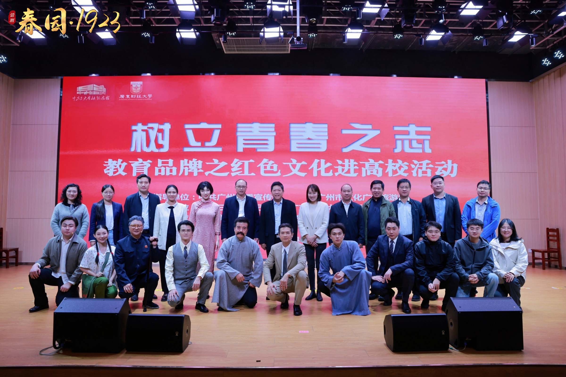 12月16日晚,以“树立青春之志”为主题的“红色文化进高校”活动在佛山校区同心楼举行。本次活动由中共广州市委宣传部、广州市文化广电旅游局指导,中共三大会址纪念馆与我校宣传统战部联合主办。活动现场上演了红色戏剧《春园·1923》,吸引了众多在校师生到场观看。学校党委副书记刘祖华、中共三大会址纪念馆副馆长邹杰杰出席活动并致辞。学校宣传统战部部长李恩华以及相关单位领导出席活动。