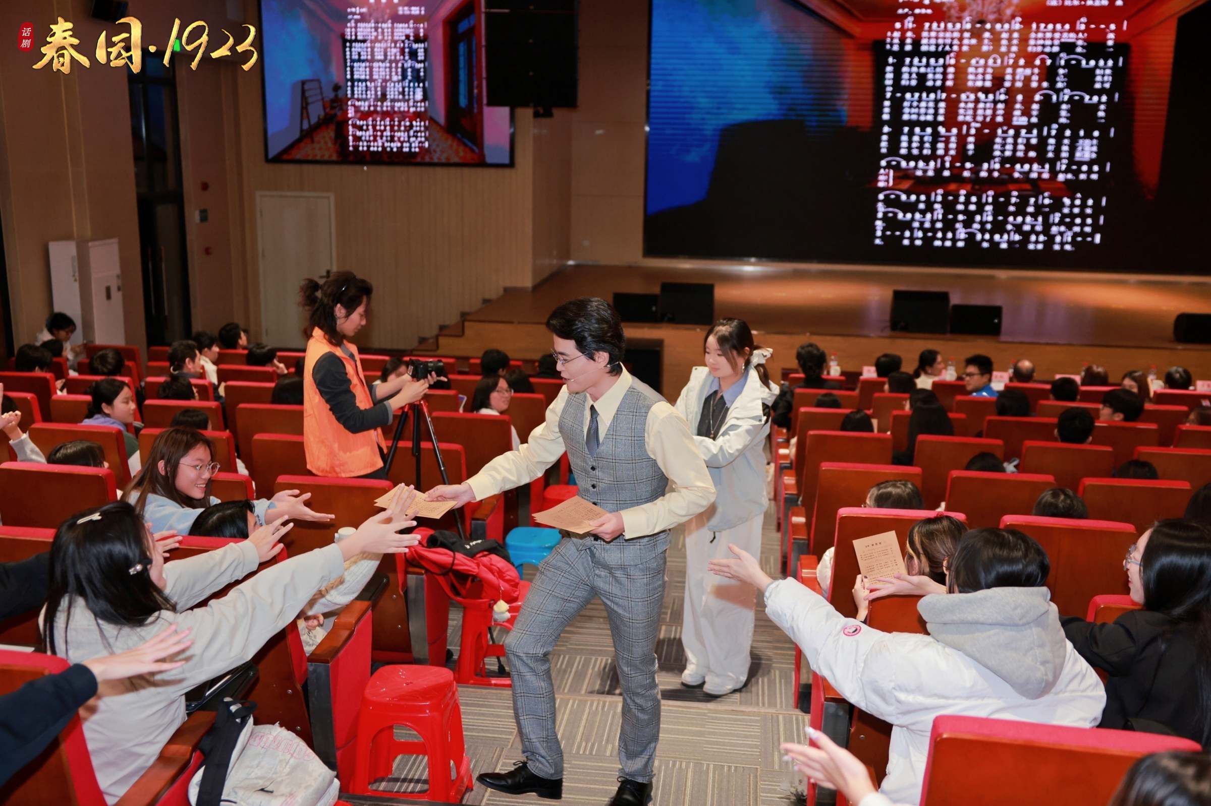 演员们身着长衫,以沉浸式表演带领大家完成了一次“时光回溯”。在1923年的广州春园里,在煤油灯的暖光下,平均年龄只有29岁的青年共产党人,正探索着中国革命的前进方向。当饰演瞿秋白的演员走下舞台,把一张张印有《国际歌》中文歌词的纸递到同学们的手里时,现场掌声雷动,欢呼如潮。信仰的力量从书本走进现实,从抽象化为具体。演出在全场齐唱《国际歌》的热烈氛围中落下帷幕。