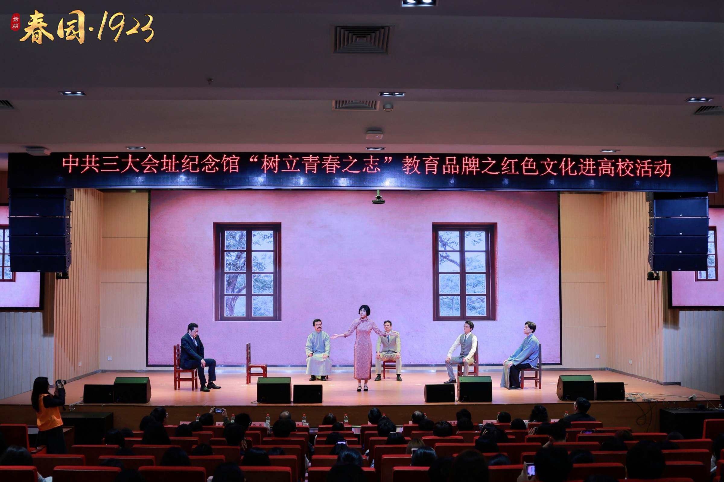 红色主题戏剧《春园·1923》重排后以短剧形态走进高校,成为当晚全场的焦点。该剧是中共三大百年纪念红色短剧,由中共三大会址纪念馆等单位联合创排,以1923年广州春园为背景,用严谨的史实还原、细腻的戏剧表达,生动再现了中共三大召开前夕的历史场景。