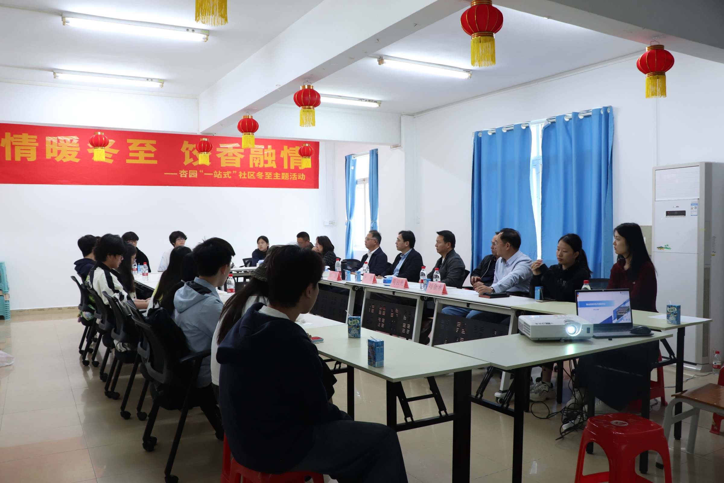 当日中午,张凯,学工部部长钟智,刘金水、莫云光、袁东卫、陈丽清等一行在杏园“一站式”学生社区与16名学生代表开展午餐会。午餐会以“情暖冬至 饺香融情”为主题。钟智介绍了本次会议的背景和主题。学生代表依次介绍了个人学习生活情况,并就课程设置、实习实践、后勤服务等方面提出建议。关工委同志结合自身经历予以回应,并勉励同学们珍惜大学时光,扎实学好专业知识,积极参与社会实践,全面提升综合素养。