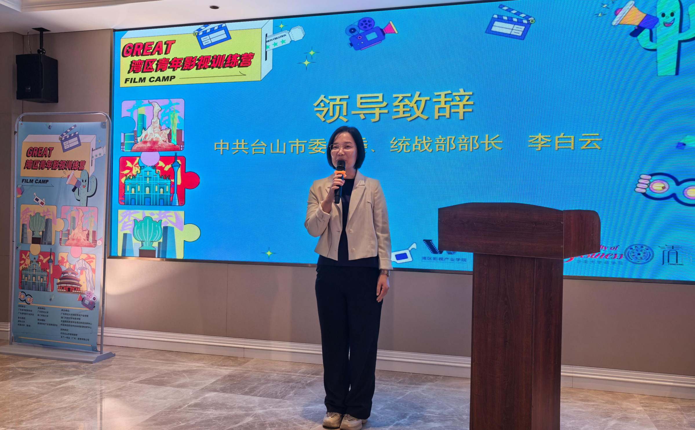 中共江门市委统战部二级调研员邝丽萍,中共台山市委常委、统战部长李白云,湾区影视产业学院党委书记陈蓉、院长贾毅等领导嘉宾出席结营仪式。李白云表示,台山是著名侨乡与影视“天然摄影棚”,为影视创作提供多元场景与精神内核。青年学子把镜头对准台山,将助力台山文化、湾区文化联通世界。陈蓉表示,湾区青年影视训练营用年轻人的新视角、新语态,讲述台山发展的新故事,是一次校地合作的新探索。
