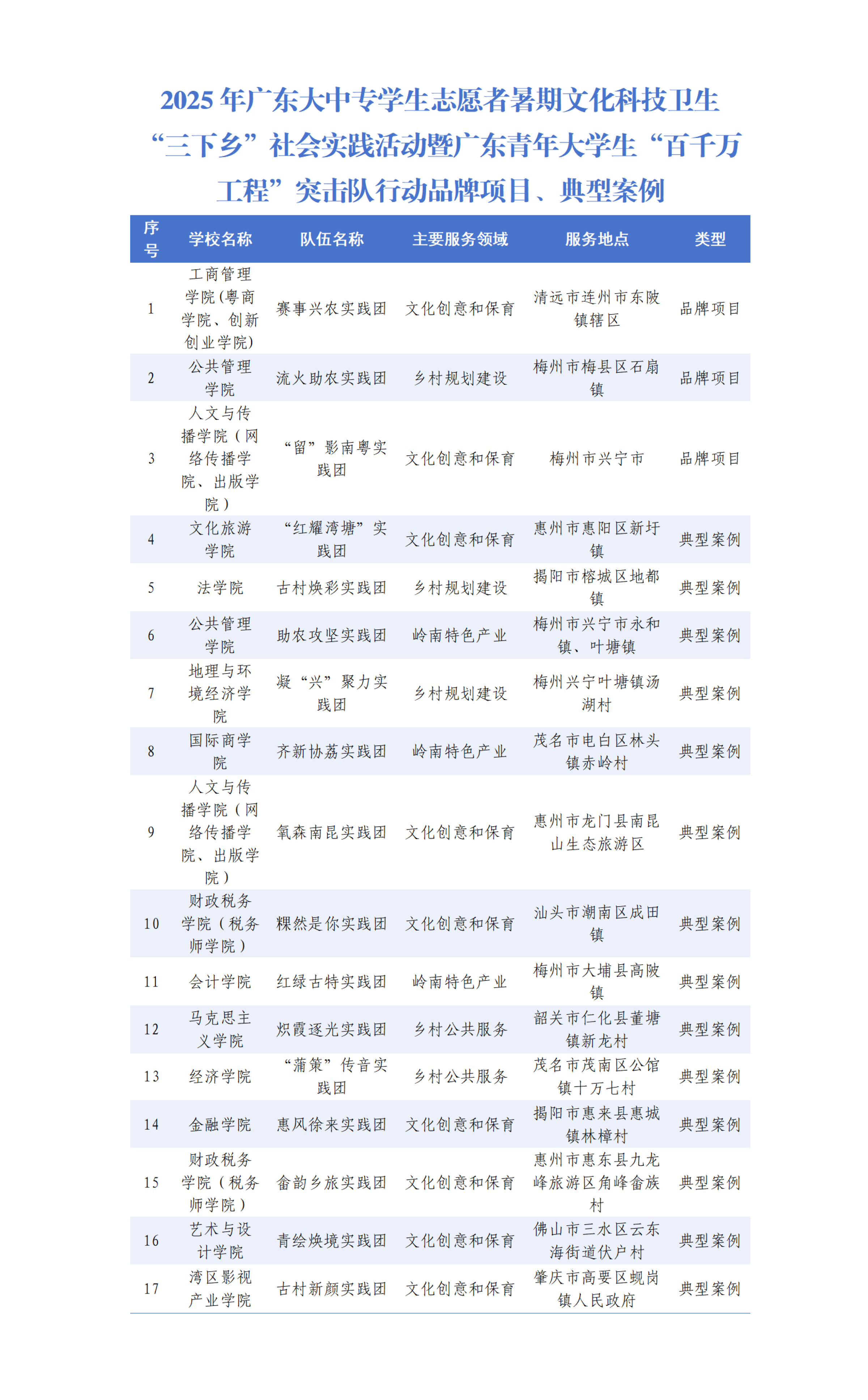 近日,共青团广东省委员会、中共广东省委宣传部、广东省精神文明建设办公室、广东省教育厅、广东省学生联合会发布《关于公布2025年广东大中专学生志愿者暑期文化科技卫生“三下乡”社会实践活动暨广东青年大学生“百千万工程”突击队行动品牌项目及典型案例的通知》,共评选出110个省级品牌项目与446个省级典型案例。我校3支队伍成功入选“百千万工程”突击队品牌项目,14支队伍成功入选“百千万工程”突击队典型案例。