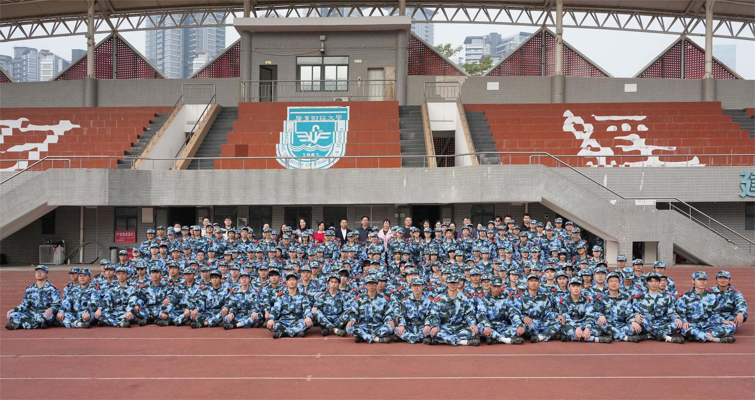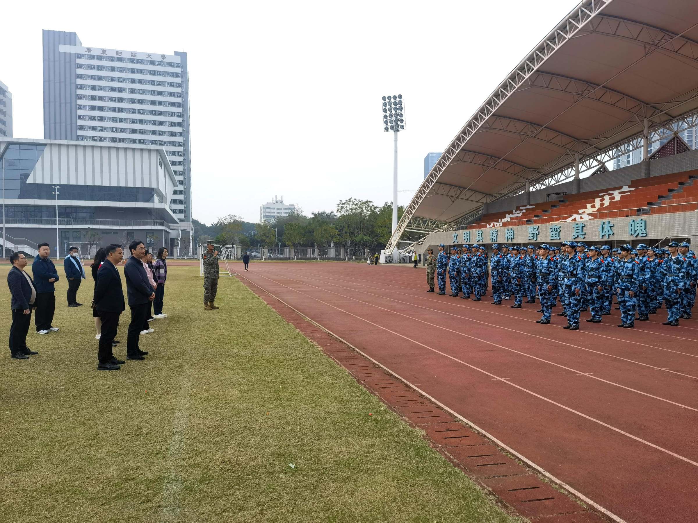 近日,广州校区北校园田径场上响起整齐有力的口号声。副校长张凯带领学工部相关负责人和工作人员、各学院学生工作书记、新生辅导员,前往2025级新生军训现场,为参加训练的同学送上冬日问候。学校为同学们准备了温暖的姜茶和罗汉果茶,这份冬日里的关怀让训练场洋溢着温暖氛围。