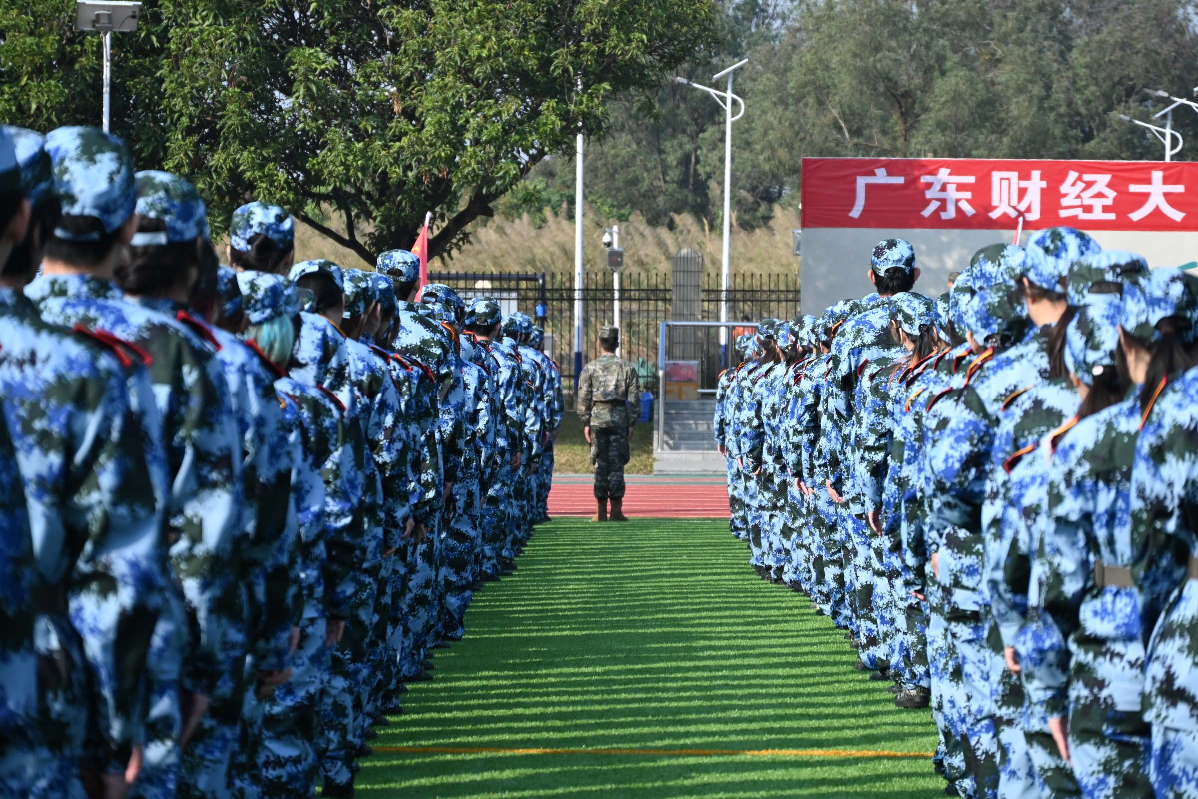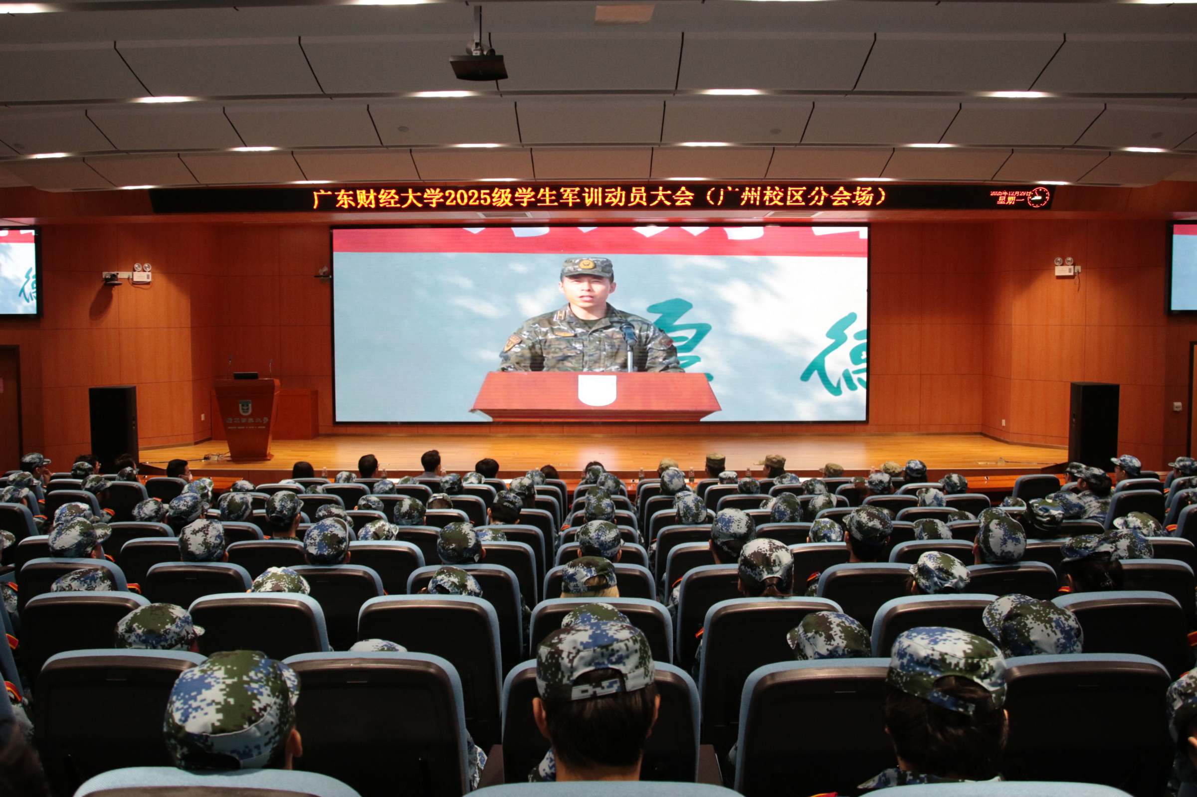 12月29日上午,我校2025级学生军训动员大会在佛山校区田径场开幕。6000余名学子身着戎装、意气风发,以饱满状态迎接这场青春“成长必修课”。学校副校长张凯,佛山武警支队姚英俊等出席大会并作动员讲话。相关职能部门领导、各学院学生工作书记、全体教官、辅导员以及2025级学生参加本次动员大会。动员大会仪式由学校党委学工部、武装部部长钟智主持。广州校区参训学生以收看视频直播方式在正心堂参加会议。