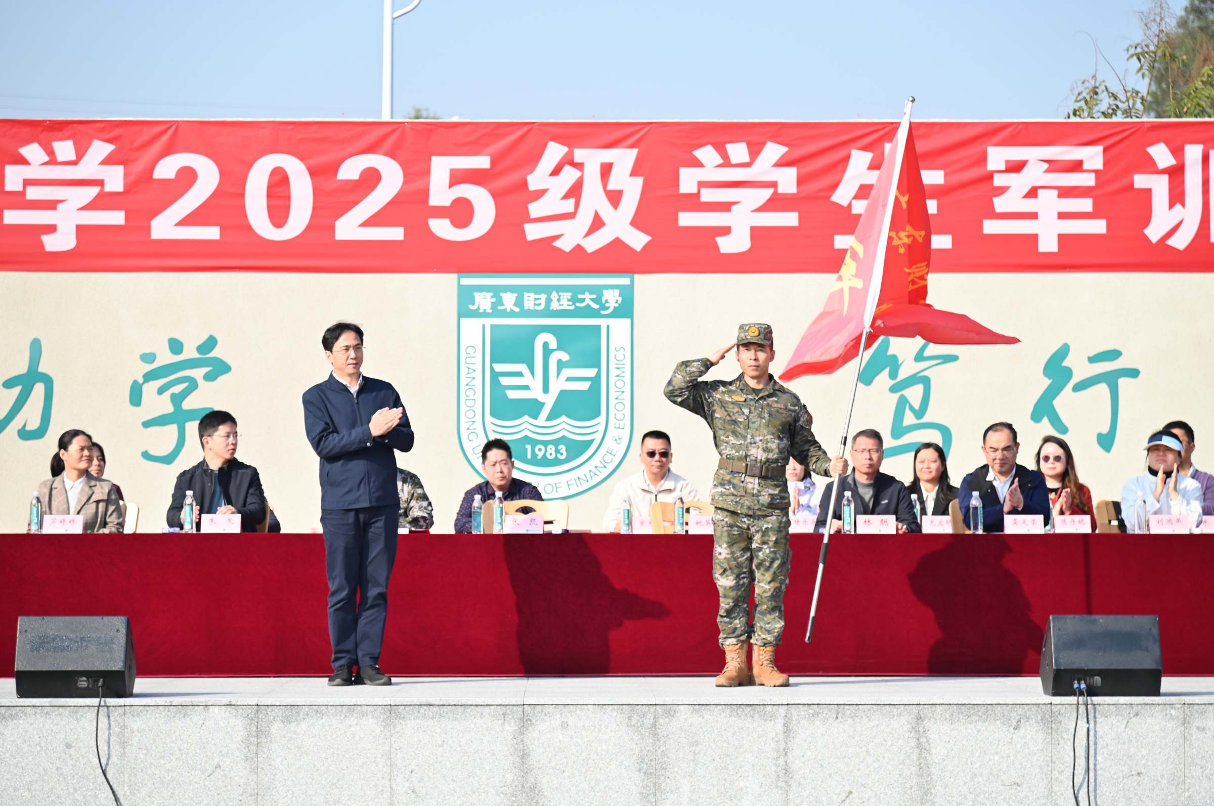 国歌声起,全场肃立,2025级学生军训动员大会正式拉开帷幕。张凯授予承训单位军训团团旗。张凯在军训动员讲话中指出,军训是大学“成人礼”与“精神远征”,能淬炼“自律、自强、爱国、担当”的品格,涵养迎难而上的硬作风。他对参训学子提出三点期望:以史为鉴,厚植家国情怀,让“为国家做事”成为青春底色;以军人标准严于律己,锤炼本领,在艰苦训练中磨砺意志;以团结聚力,共赴荣光,展现广财学子的昂扬风貌。同时,他嘱托教官科学施训、严管厚爱,教师做好保障,勉励新生“以青春赴迷彩之约”。