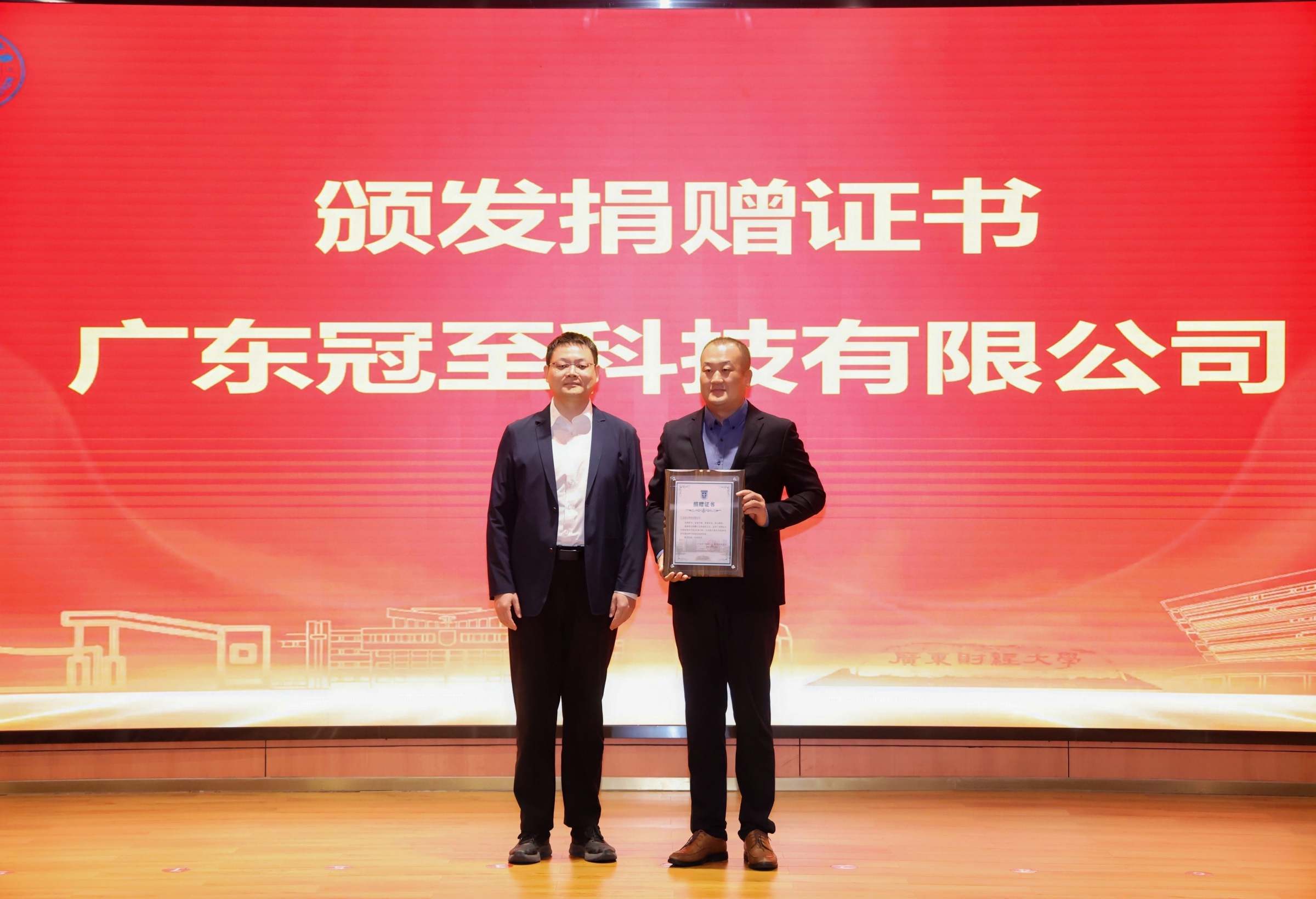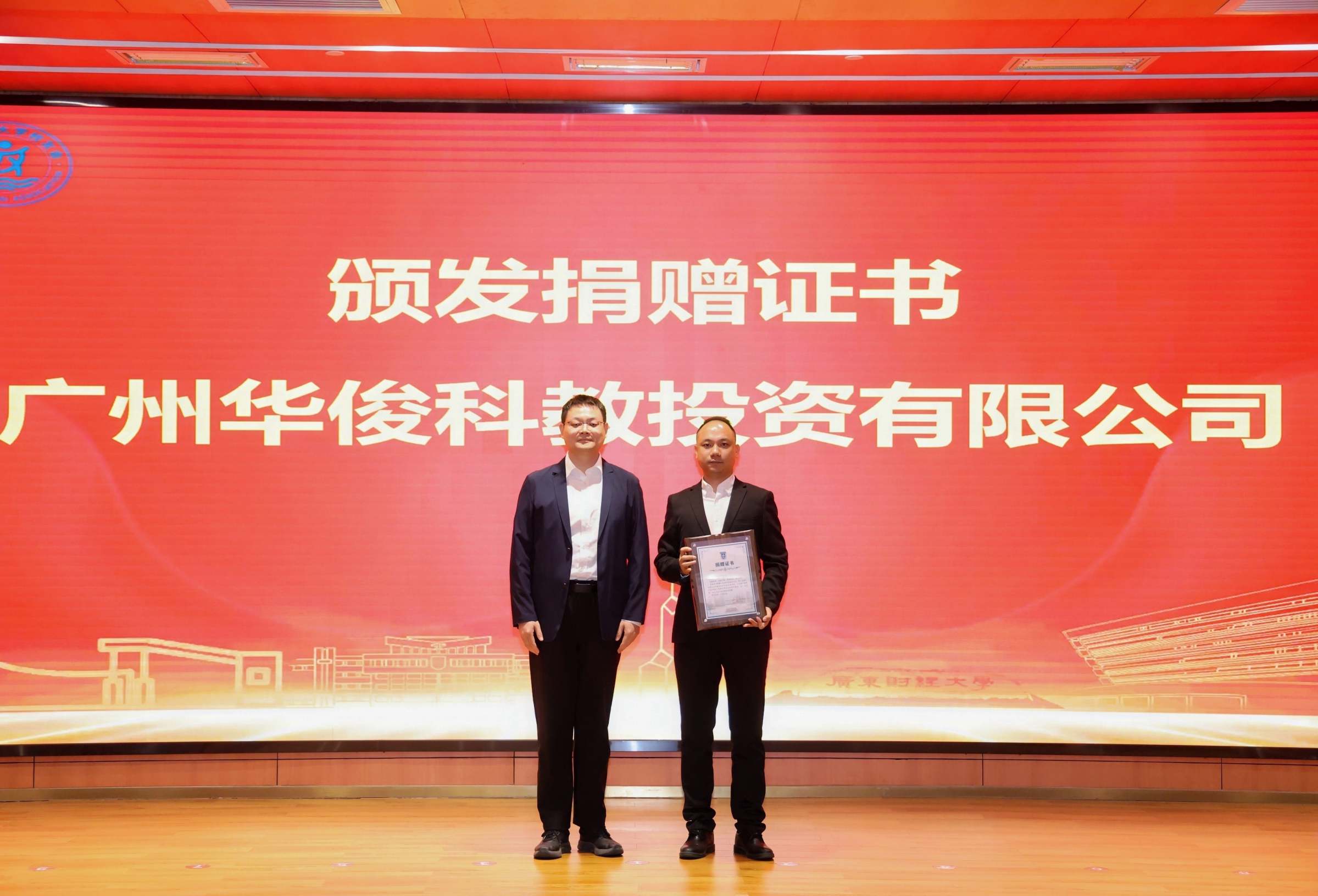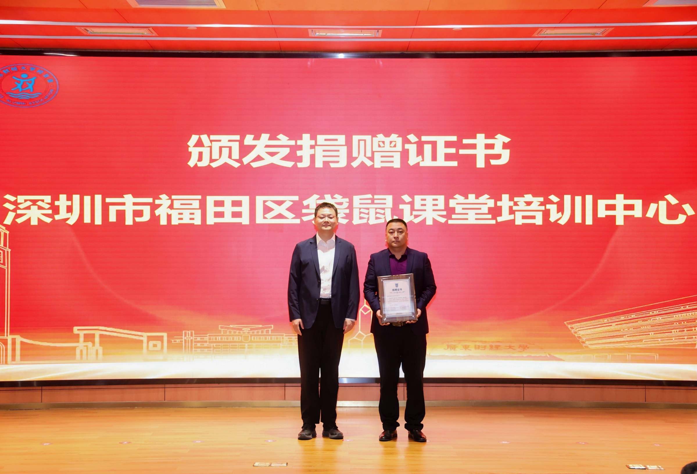 会上,学校为近期捐赠支持学校教育发展的三家爱心企业颁发捐赠证书。广州华俊科教投资有限公司捐赠350万元用于建设学校数字创新应用综合实验室,广东冠至科技有限公司捐赠20万元支持继续教育学院实验室建设,深圳市福田区袋鼠课堂培训中心捐赠20万元用于支持继续教育学院校友会工作。副校长雷宇为企业代表颁发证书,对企业的慷慨支持与社会责任感表示衷心感谢。
