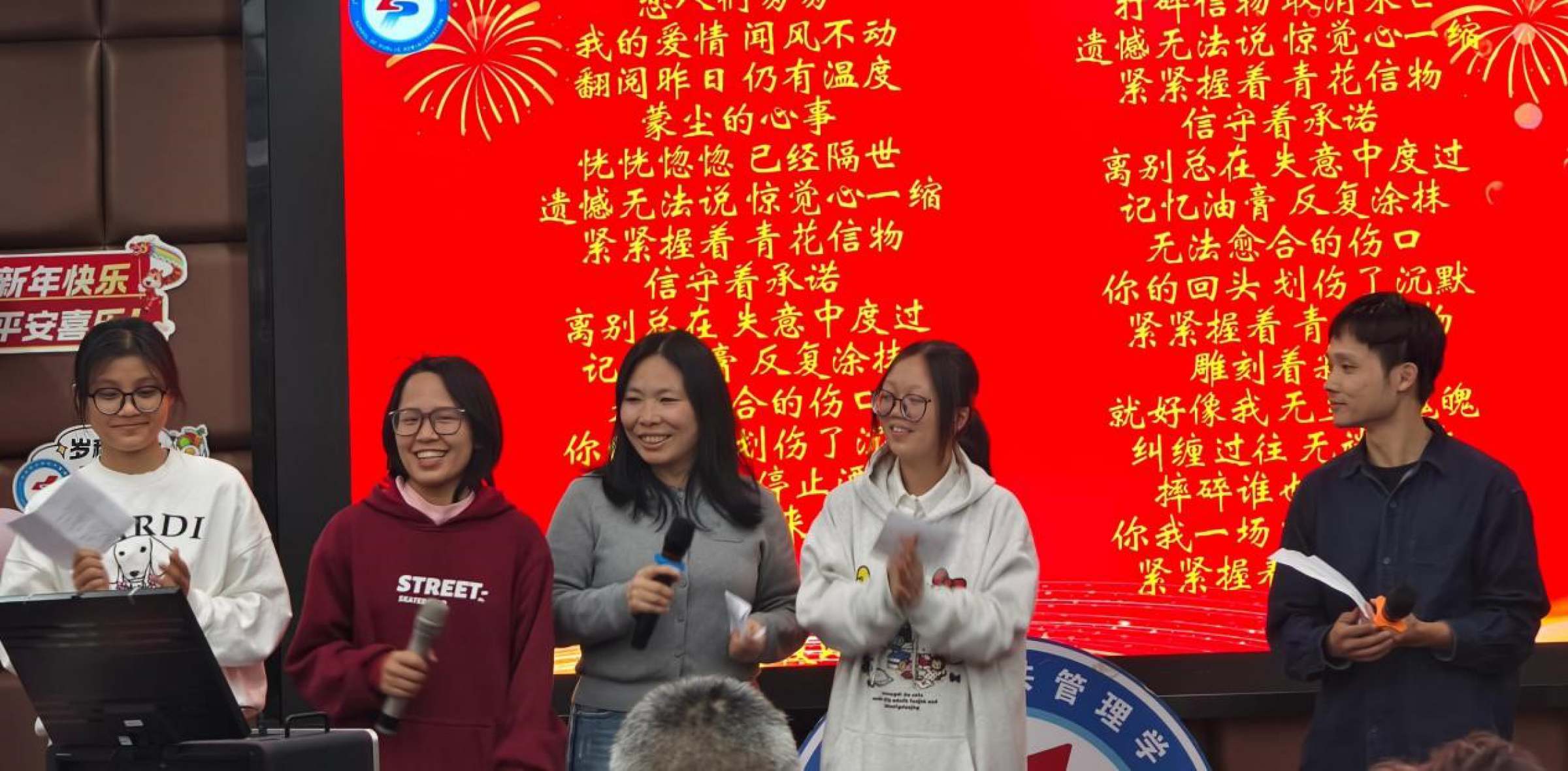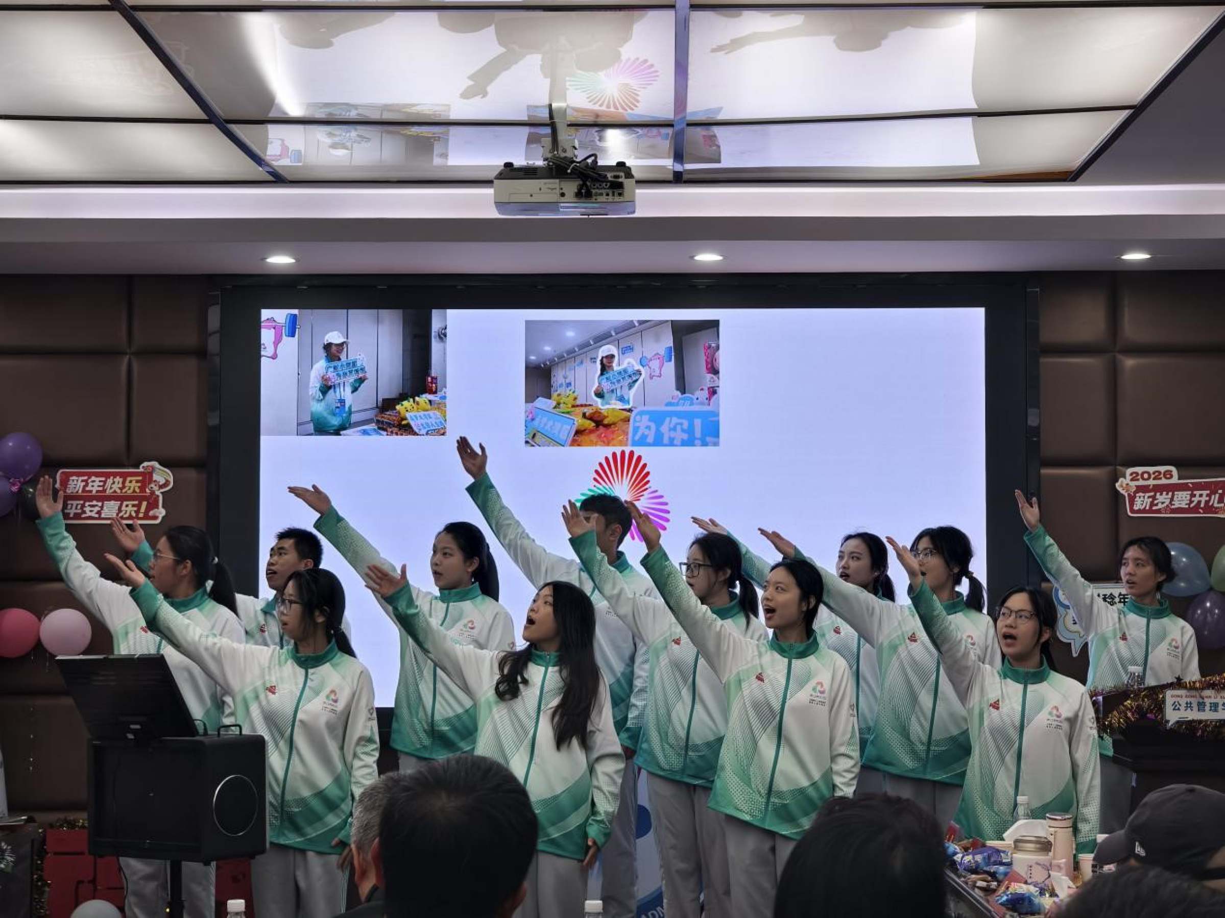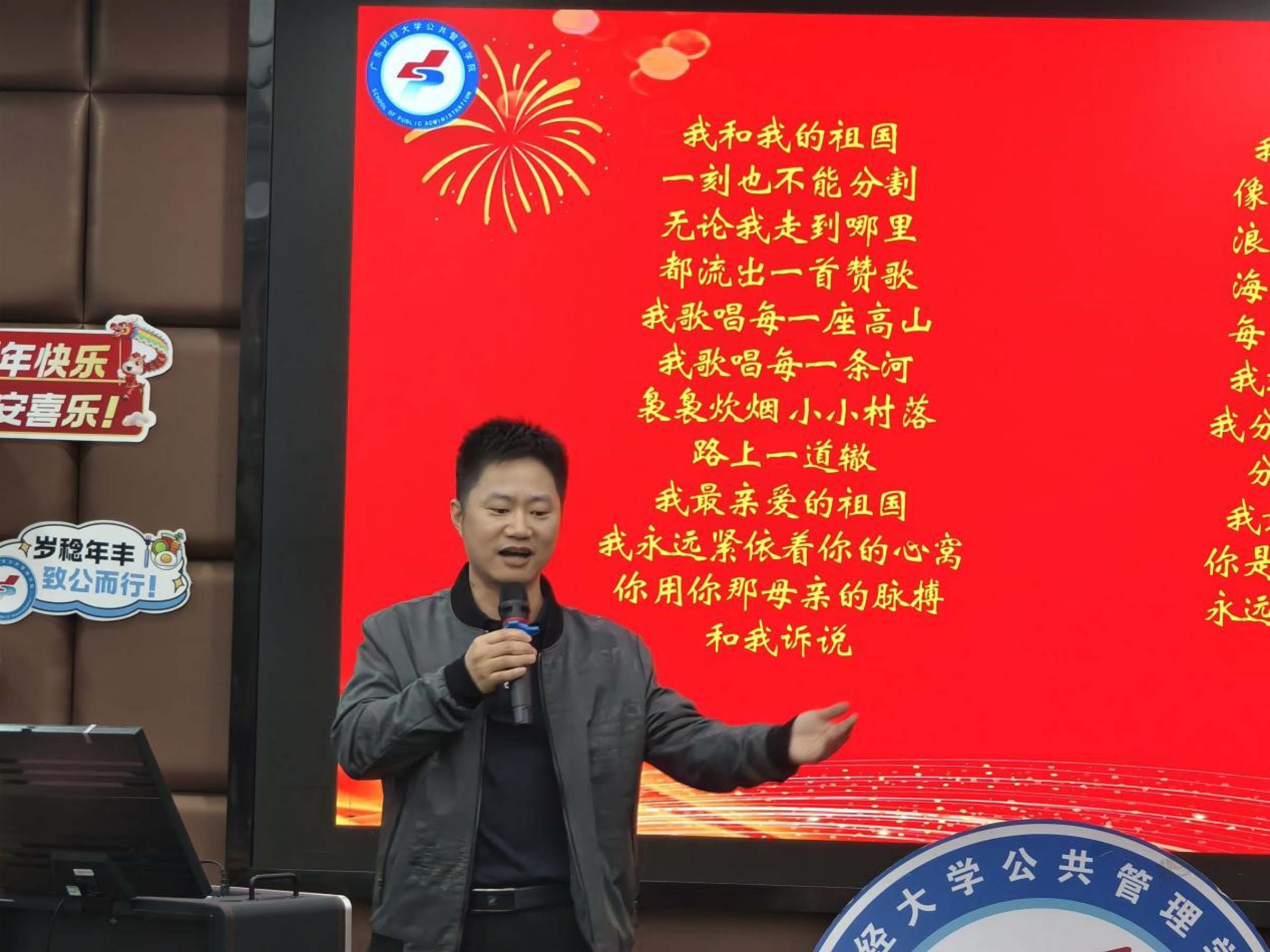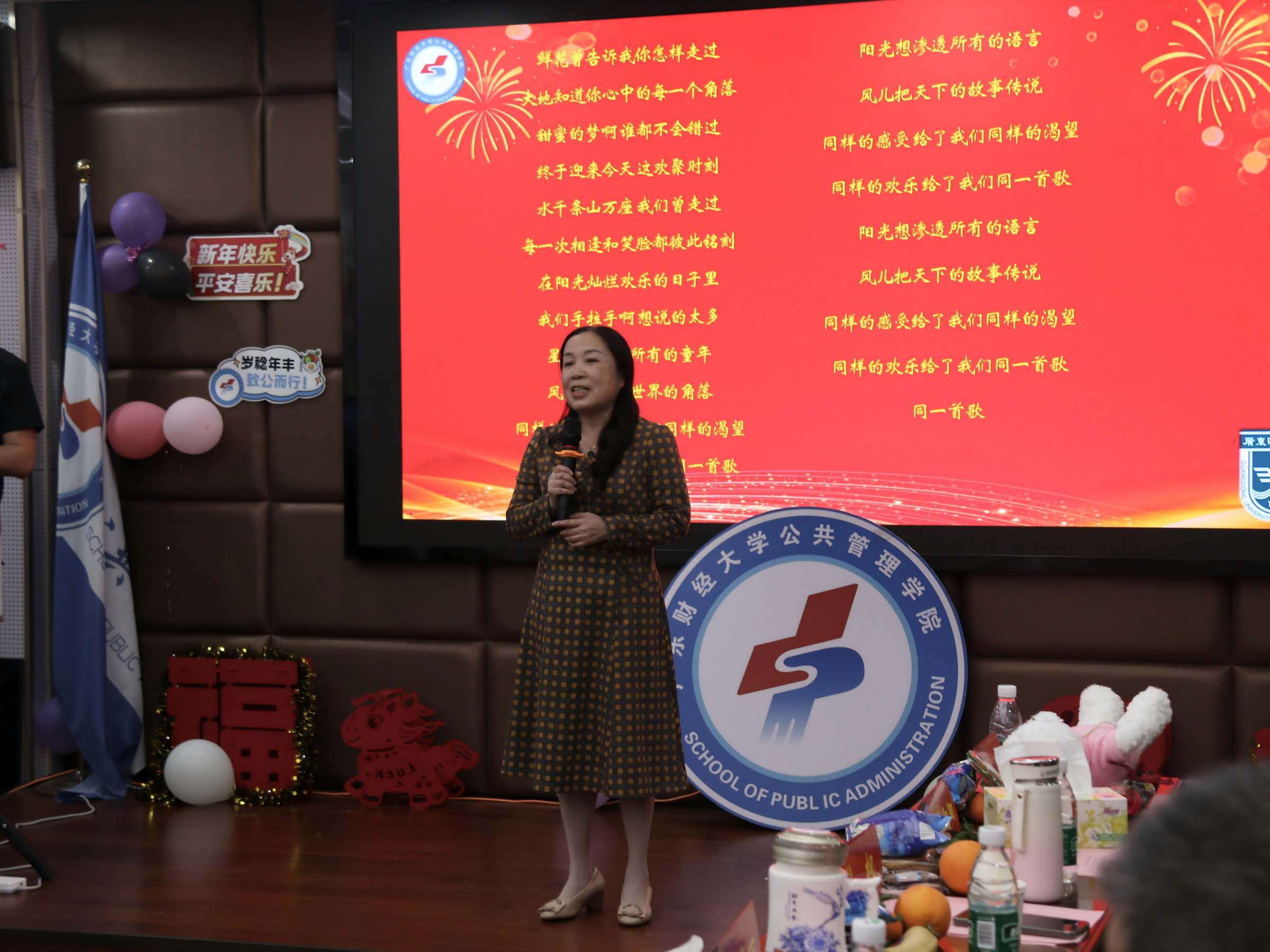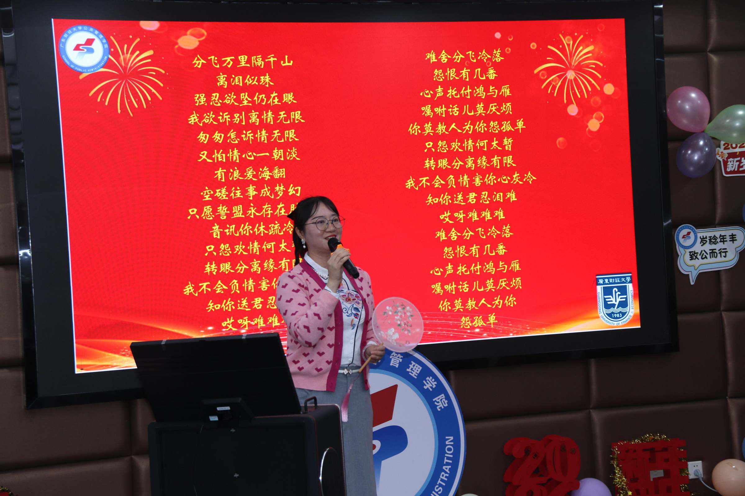 在联欢环节,聂华丽带来粤剧表演《分飞燕》,行政管理系教师进行集体朗诵《我爱科研》,余川老师演唱《我和我的祖国》,土地与房地产管理系教师合唱《明天会更好》。城市管理系、应用社会学系教师、MSW中心和MPA中心两个硕士点的教师代表,以及学院九三学社社员郑鸿铭老师分别进行了精彩表演。2023级的本科生代表们带来合唱和手舞表演《共赴山海》。轻松温馨的氛围,寄托了学院师生们对新年新气象的憧憬。