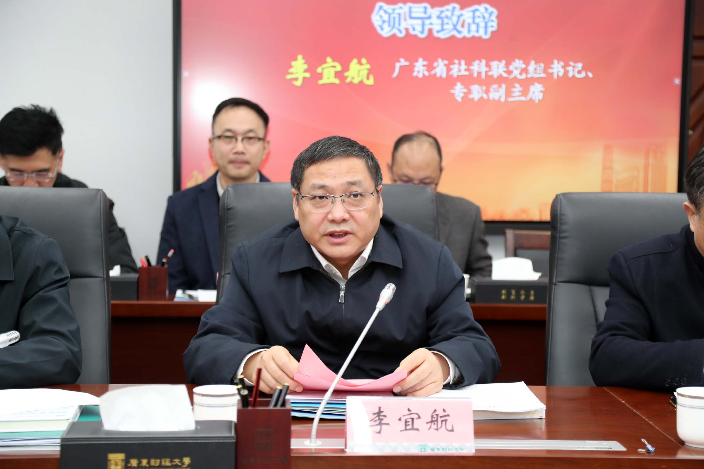 郑贤操代表主办单位致辞。他表示,《国家安全与发展研究》开创了“校政双向赋能”办刊新模式,是省社科联与高校协同推进学科建设的重要标志。我校作为华南地区唯一拥有国家安全学博士点的省属高校,将秉持“立足学术前沿、服务国家战略”的办刊宗旨,聚焦经济安全、金融强国等国家重大议题,突出粤港澳大湾区实践特色,致力于实现理论、实践与区域特色的三维融合,将《国家安全与发展研究》打造成为引领国家安全学研究的旗帜性期刊,为平安中国建设贡献智慧。