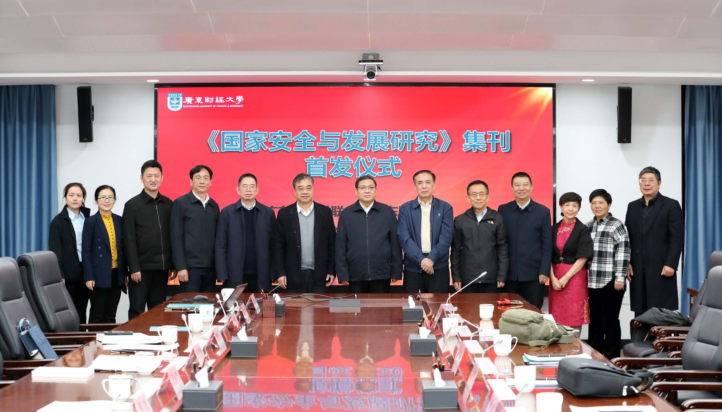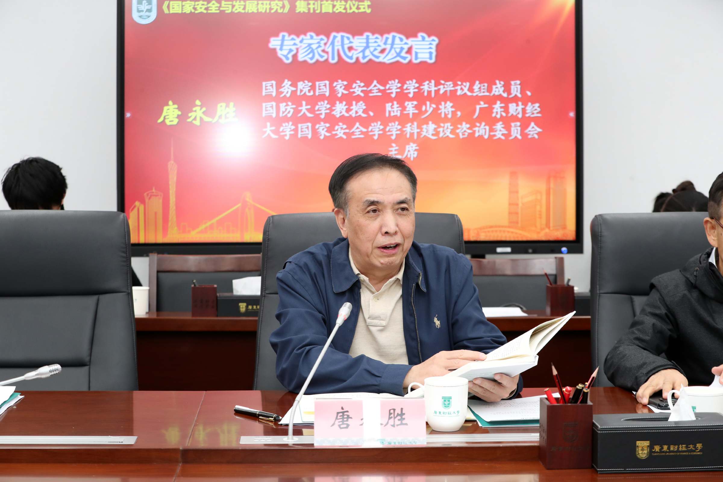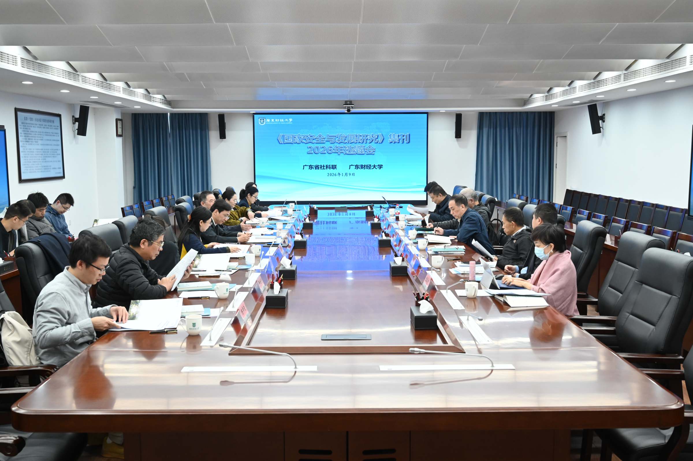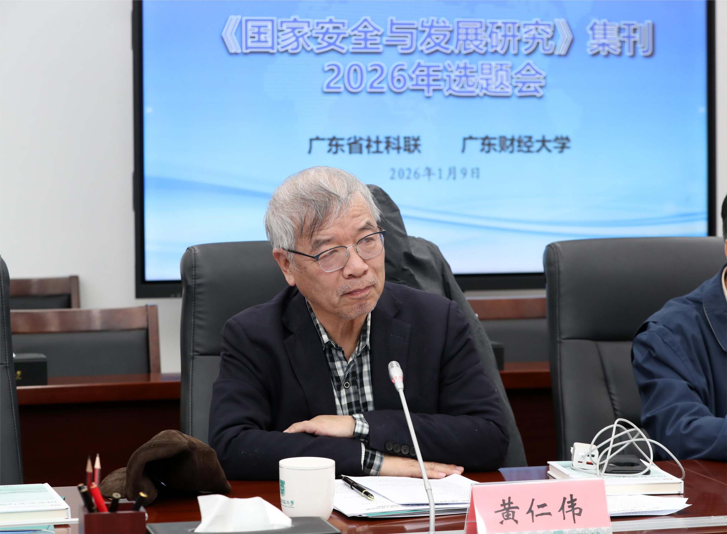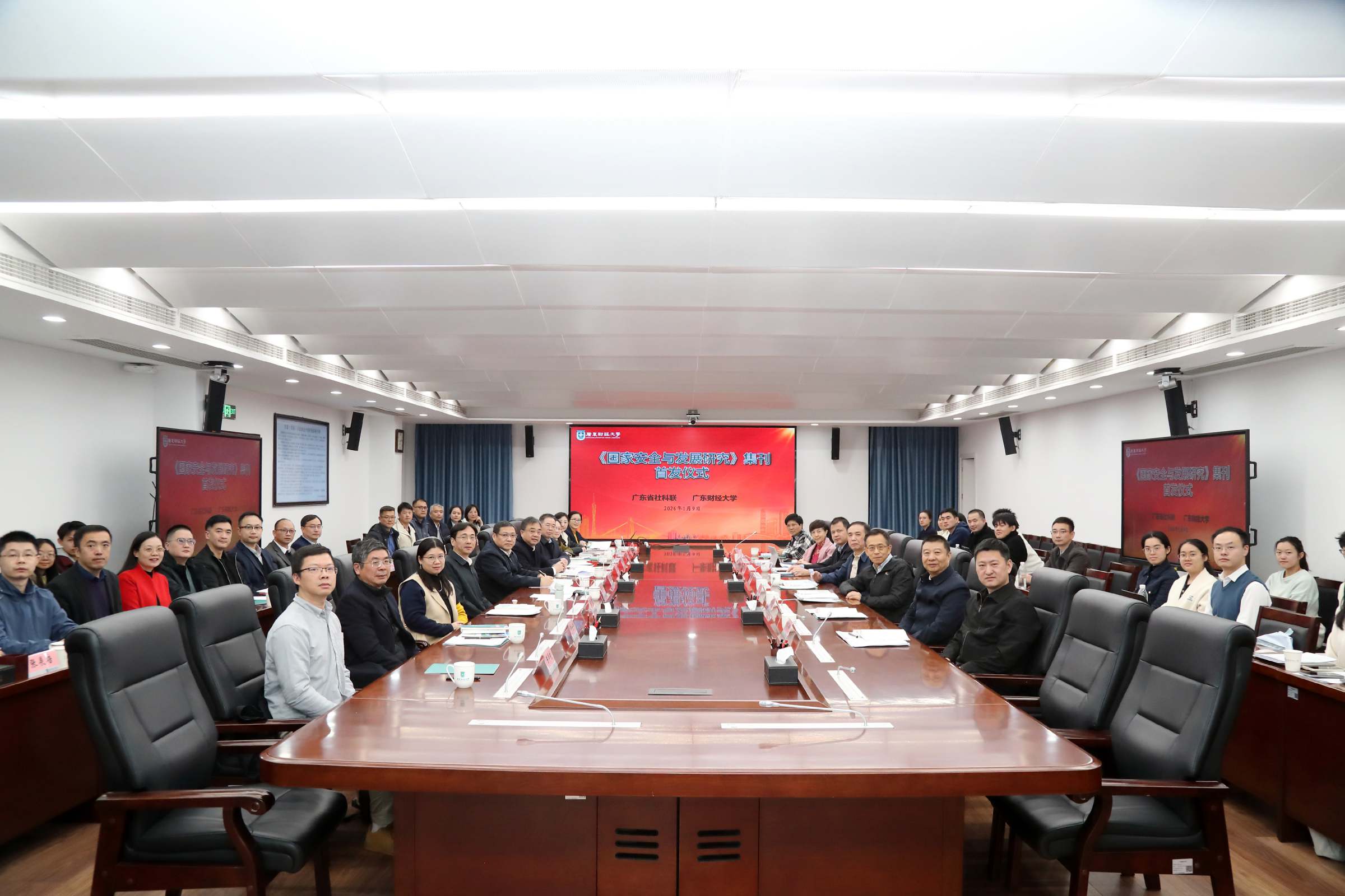 1月9日,由广东省社会科学界联合会和广东财经大学联合举办的《国家安全与发展研究》集刊首发仪式暨2026年选题会在学校同德楼第一会议室举办。广东省社会科学界联合会党组书记、专职副主席李宜航,国务院国家安全学学科评议组成员、国防大学教授、陆军少将唐永胜,国务院国家安全学学科评议组成员、中国人民大学国家安全交叉学科平台首席专家黄大慧,复旦大学“一带一路”及全球治理研究院常务副院长黄仁伟,国际关系学院研究生处处长杨华锋,国际关系学院二级教授李文良,《国家安全研究》主编张焱宇,《新安全》杂志社副总编辑李林宝,广东人民出版社历史文化分社社长梁茵等专家学者出席会议。我校党委书记、国家安全与发展研究院院长郑贤操出席会议并致辞,副校长张凯主持首发仪式,国家安全学学术委员会主任邹新月主持选题会。《国家安全与发展研究》集刊编委会校内成员,学校相关职能部门负责人、国家安全学导师代表、国家安全与发展研究院全体师生参加会议。
