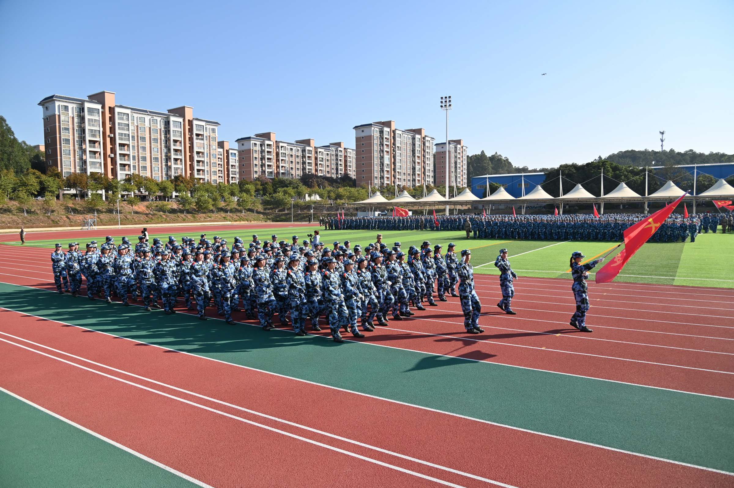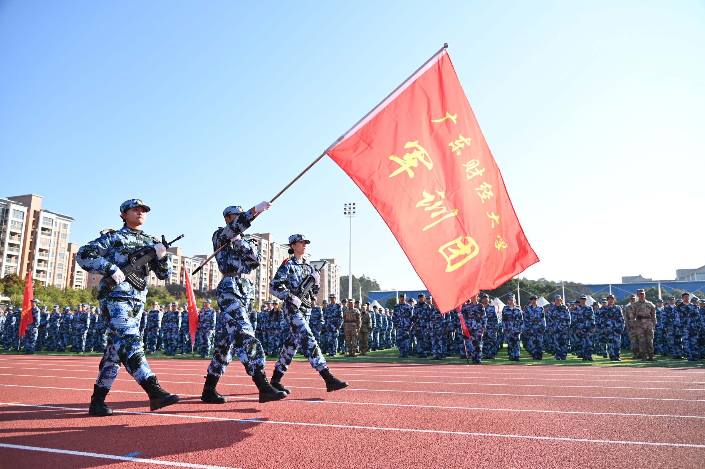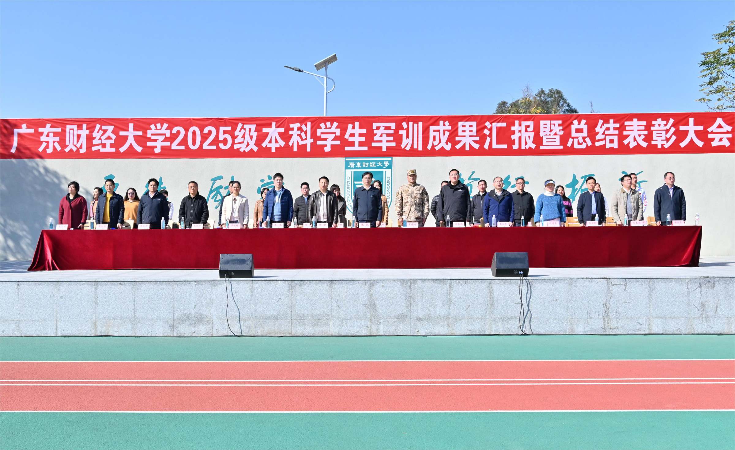 1月9日上午,2025级本科学生军训成果汇报暨总结表彰大会在佛山校区田径运动场举行。学校副校长张凯,武警广东总队佛山支队副支队长翟福国,承训单位代表及学校相关部门负责人、各学院学生工作书记、新生辅导员等出席大会。大会由武装部部长钟智主持。
