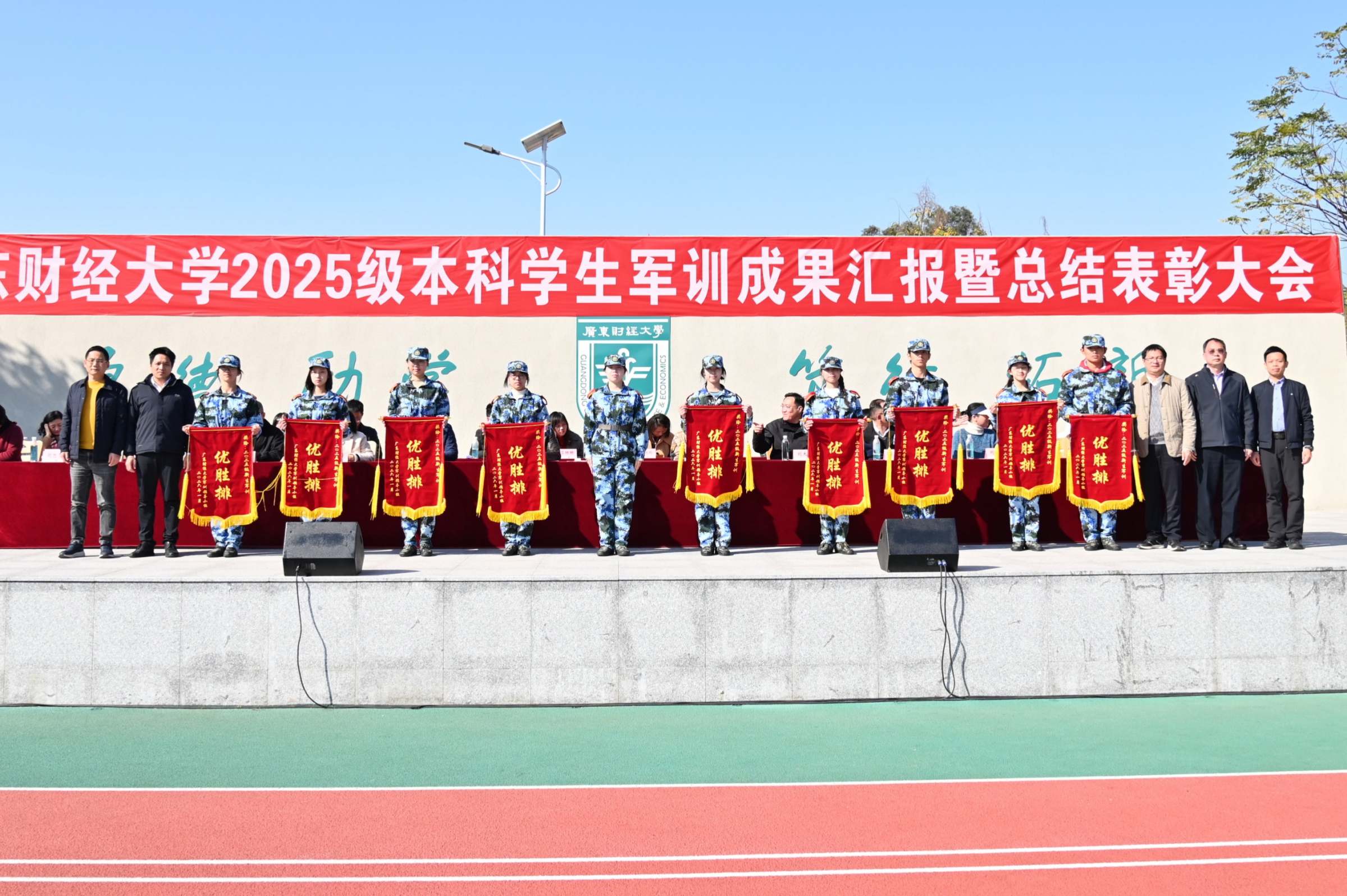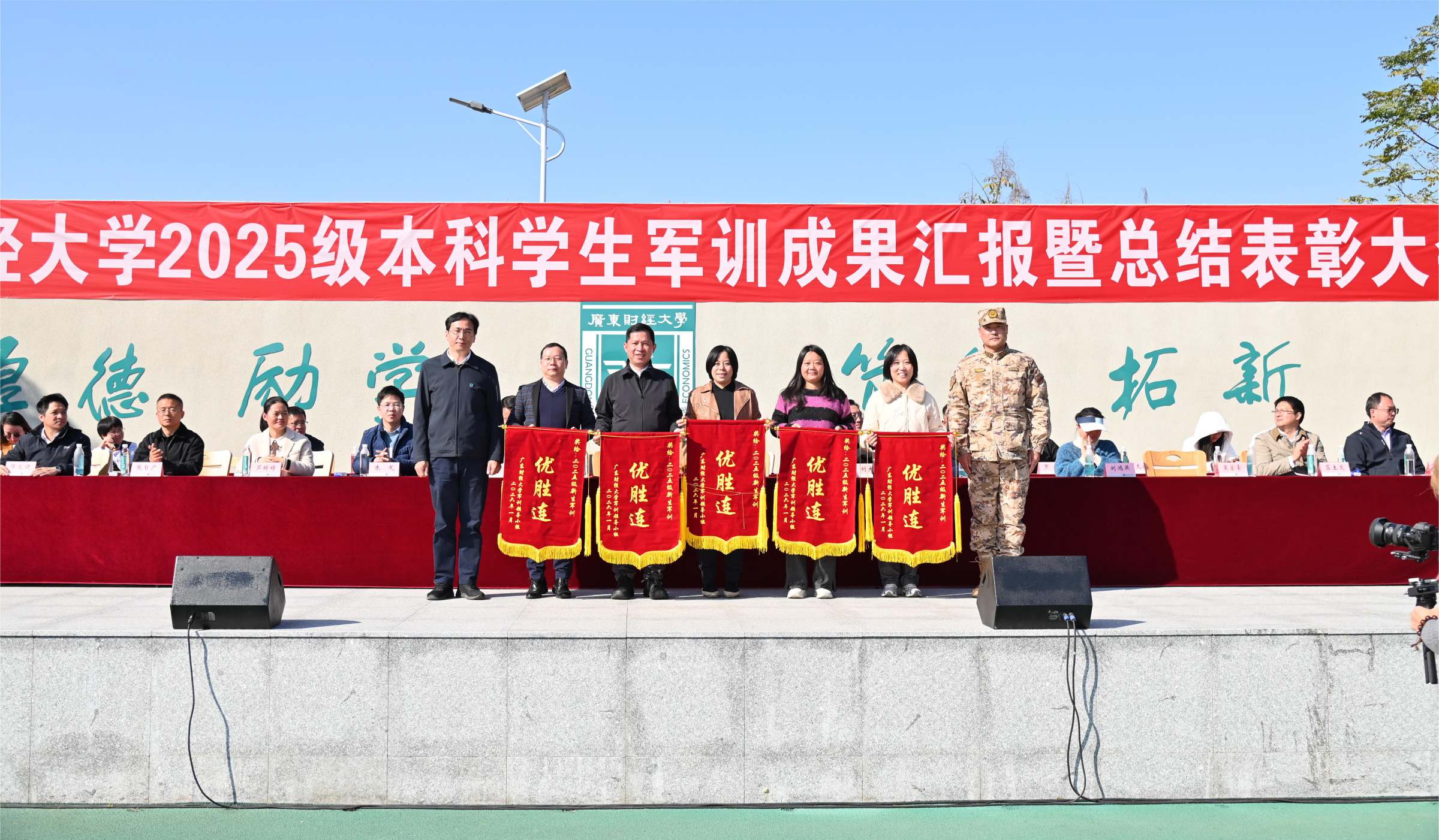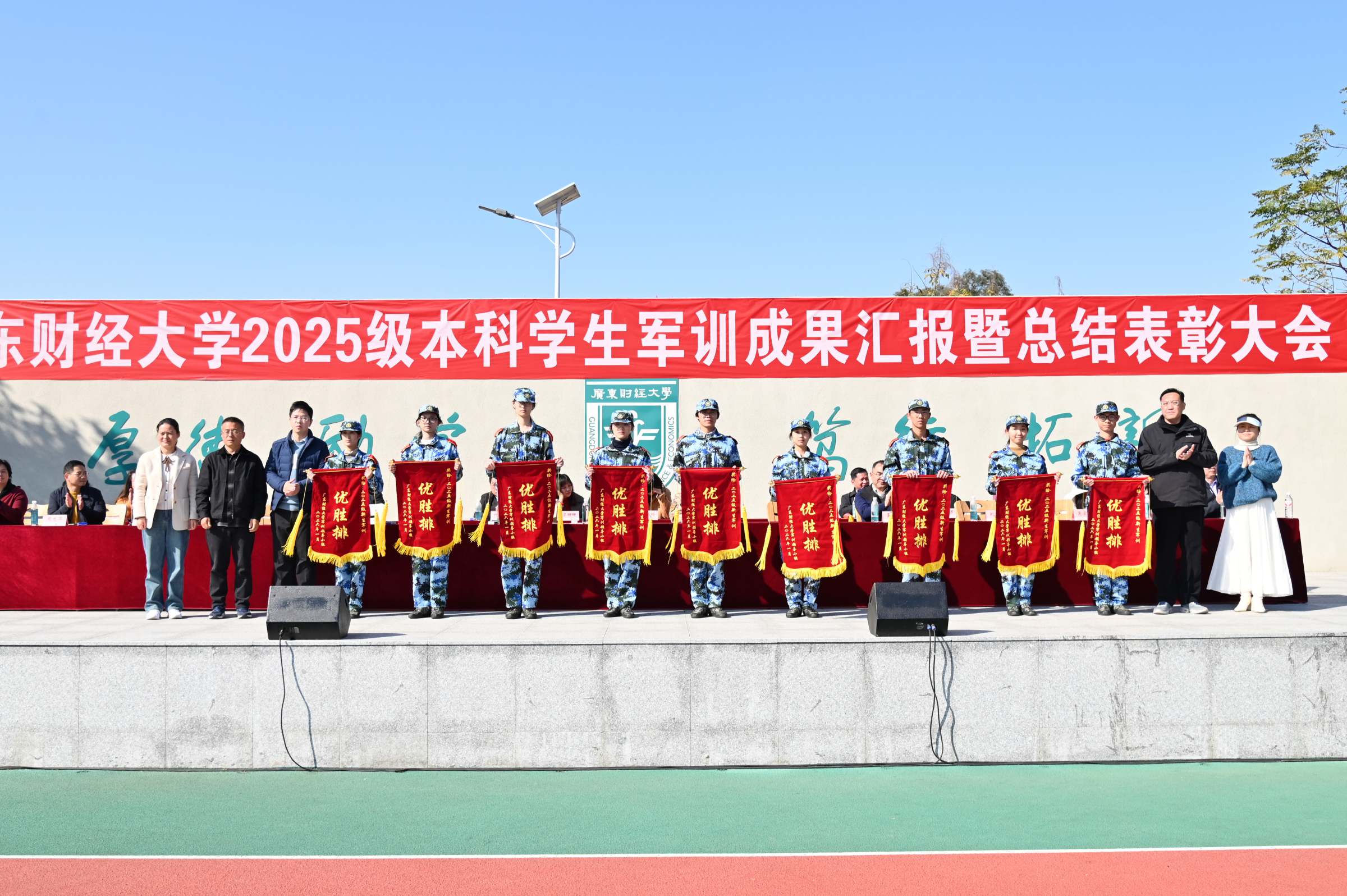会上宣读了《广东财经大学2025级学生军训嘉奖令》。会计学院、人力资源学院、地理与环境经济学院、大数据与人工智能学院、文化旅游学院5个学院获得了“优胜连”称号,一营一连二排(会计学2班)等18个排获得了“优胜排”称号,茹毅等784名同学获得了“军训先进个人”称号。