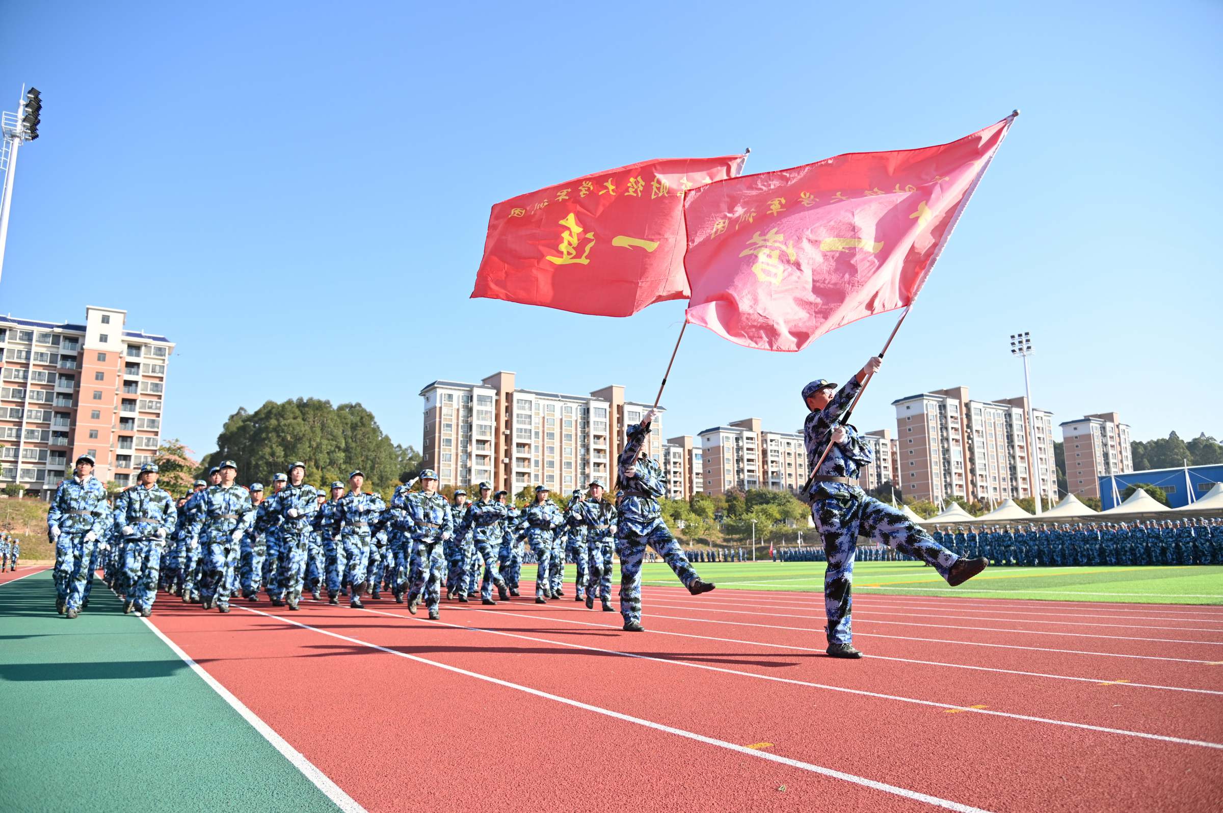 在分列式及军训成果汇报中,同学们身着迷彩、队列齐整、精神抖擞,以昂扬饱满的状态接受检阅。他们动作整齐划一、口号嘹亮如雷、步伐铿锵有力,充分彰显了在军训中淬炼出的扎实功底与昂扬风貌,交出了一份亮眼的成长答卷。