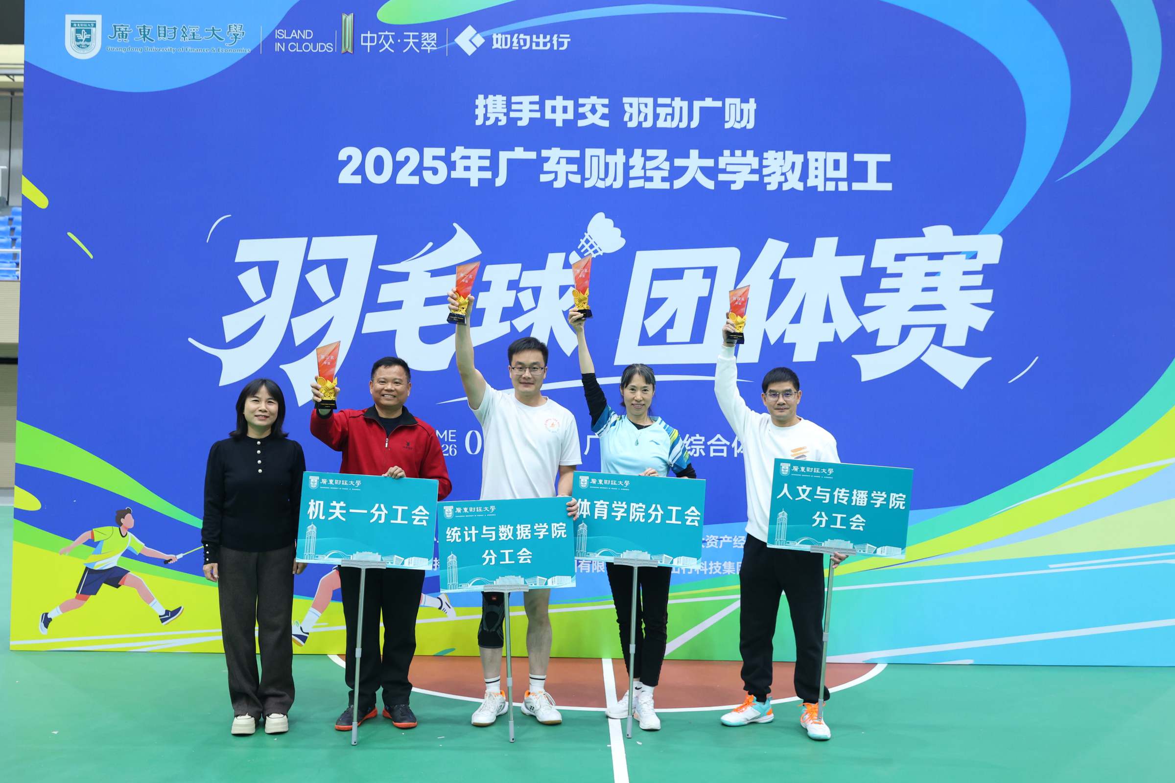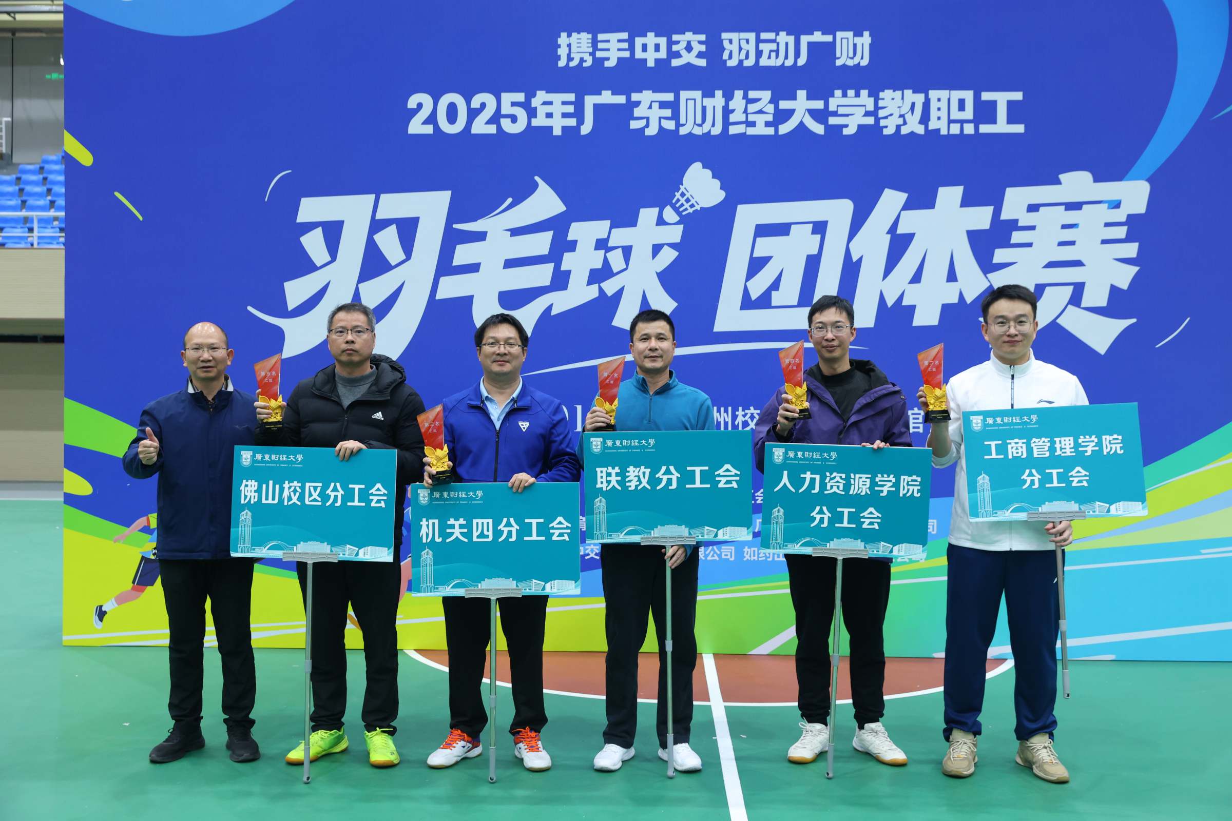 经过一整天紧张激烈的角逐,统计与数据科学学院分工会、体育学院分工会、机关一分工会、人文与传播学院分工会分别获得甲组第一至四名,财政税务学院分工会、图书馆分工会、大数据与人工智能学院分工会、公共管理学院分工会并列甲组第五名。联教分工会、工商管理学院分工会、机关四分工会、人力资源学院分工会分别获得乙组第一至四名,金融学院分工会、网络信息与教育技术中心分工会、机关三分工会、佛山校区分工会并列乙组第五名。校工会常务主席陈红丽、专职副主席王健分别为两组获奖队伍颁奖。