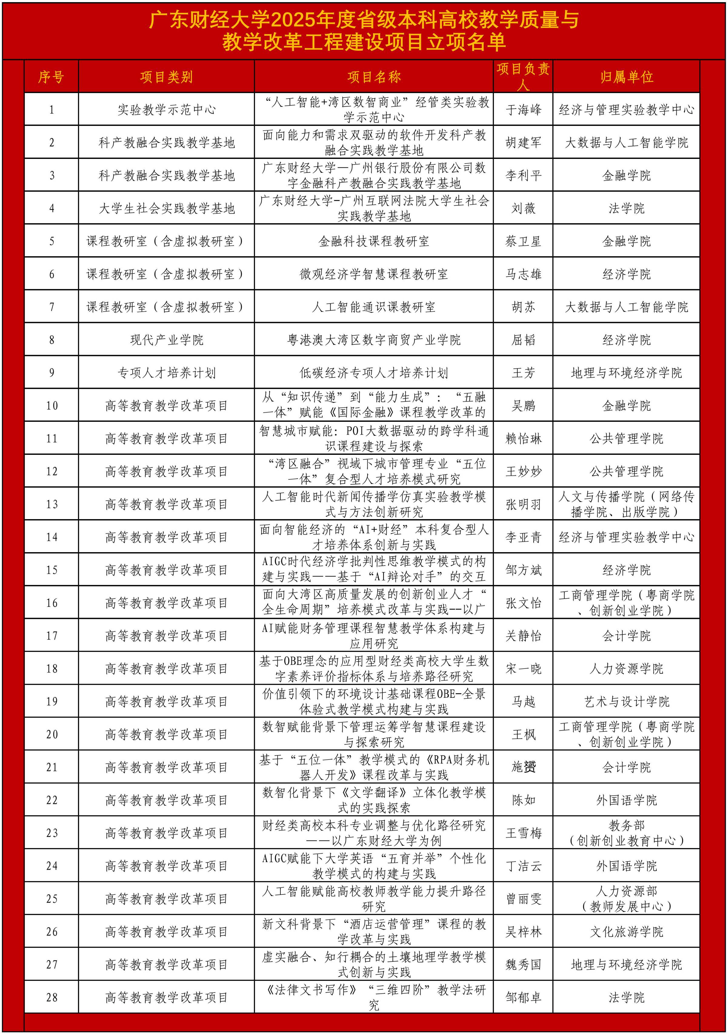 此次立项项目聚焦“AI+财经”复合型人才培养、数智化课程教学改革等前沿方向,集中展现了学校在教育教学创新领域的深厚积累与前瞻布局。项目的成功获批,不仅是对学校教学改革成效的高度认可,更为学校深化教育教学改革、提升人才培养质量注入了强劲动力。