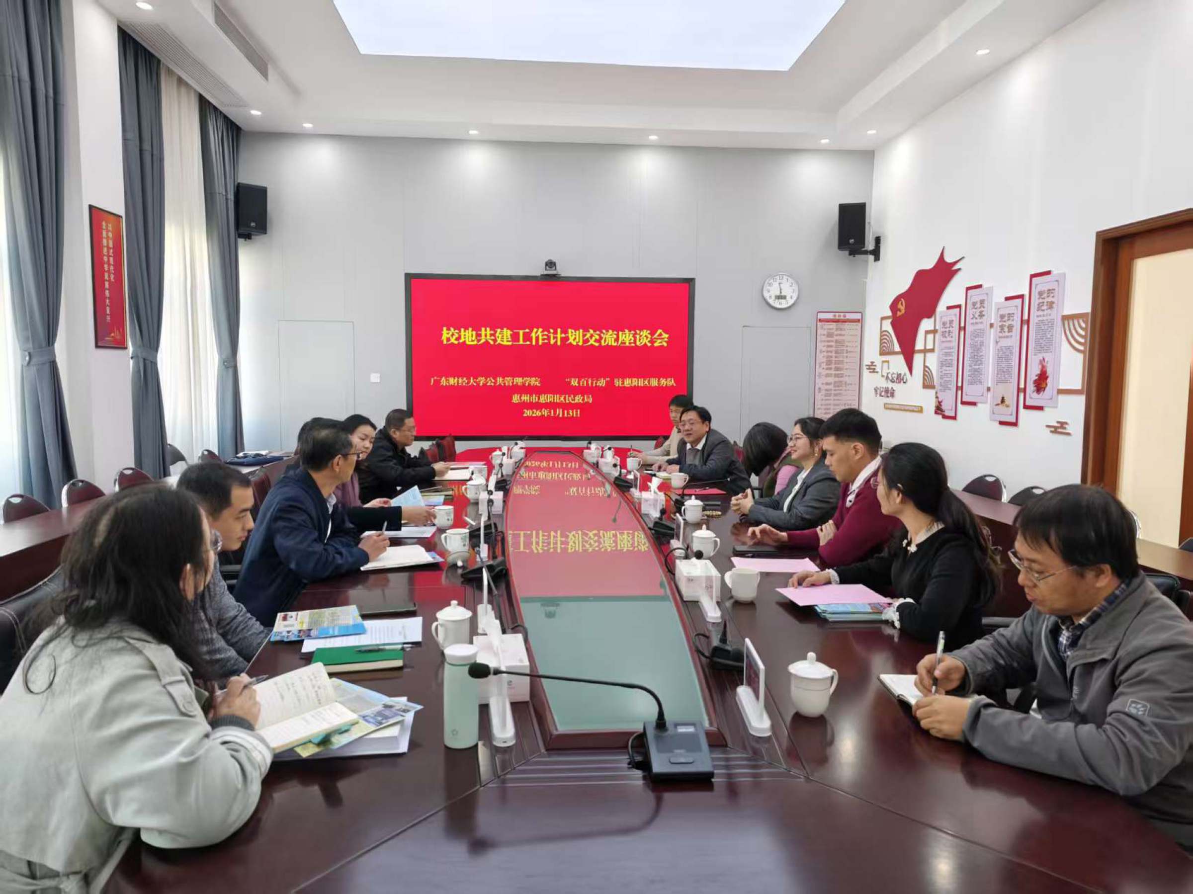同时,学院团队还与惠阳区民政局座谈交流。民政局党组书记赖志伟,局长胡文,“双百行动”驻惠阳区服务队队长周瑾等参会。双方就基层社会治理现代化、社区服务体系创新、社会组织培育与发展、公共服务优化等议题交换意见,并重点围绕社会工作专业人才队伍建设与毕业生就业工作展开交流。