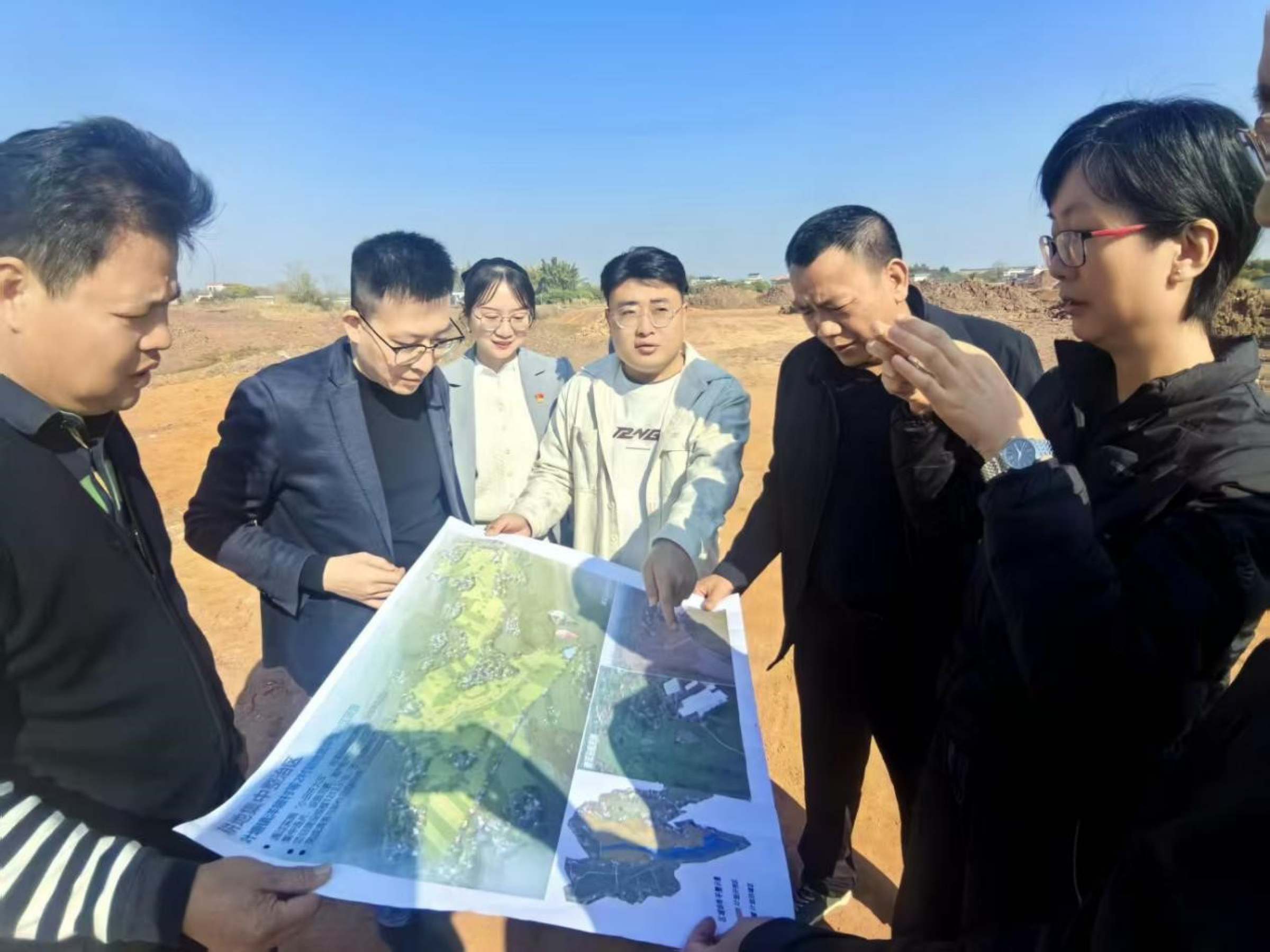 随后,支部党员在“双百行动”驻兴宁服务队队长、兴宁市委办副主任周琪锋的陪同下,先后前往叶塘镇全域土地综合整治项目北塘洋陂农用地现场点、鸽子养殖示范基地、磐安围历史文化聚落区调研,详细了解当地耕地集中整治、产业导入、古村落活化等项目的进展与成效。调研结束后,支部党员与兴宁市委副书记麦东阳、叶塘镇党委书记万耀明、镇长罗学宏等座谈交流,就叶塘镇全域土地综合整治项目的推进情况、存在挑战及合作方向进行了务实高效的研讨,为后续精准对接校地资源奠定基础。