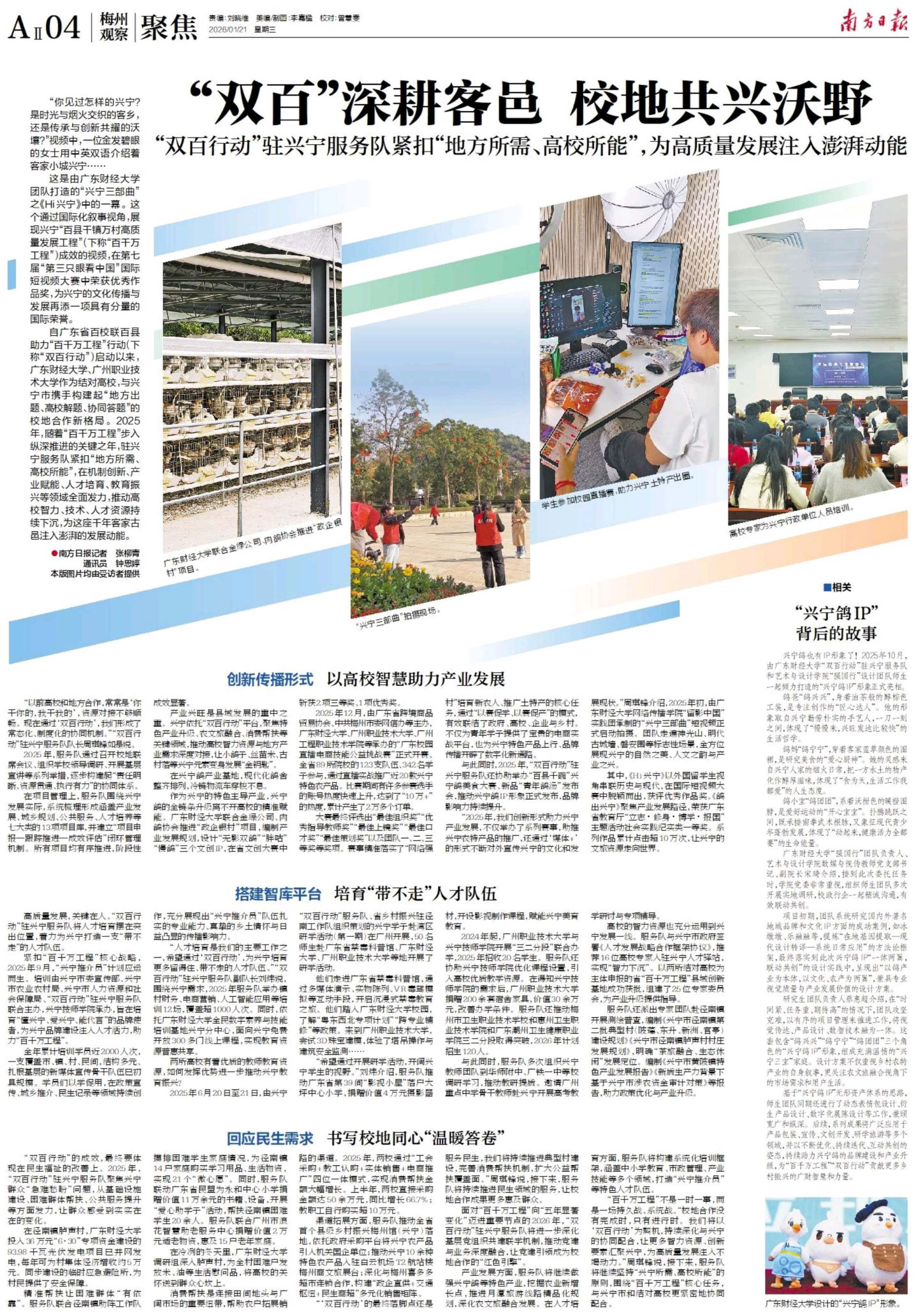 “以前高校和地方合作,常常是‘你干你的,我干我的’,资源对接不够顺畅。现在通过‘双百行动’,我们形成了常态化、制度化的协同机制。”“双百行动”驻兴宁服务队队长周琪锋如是说。