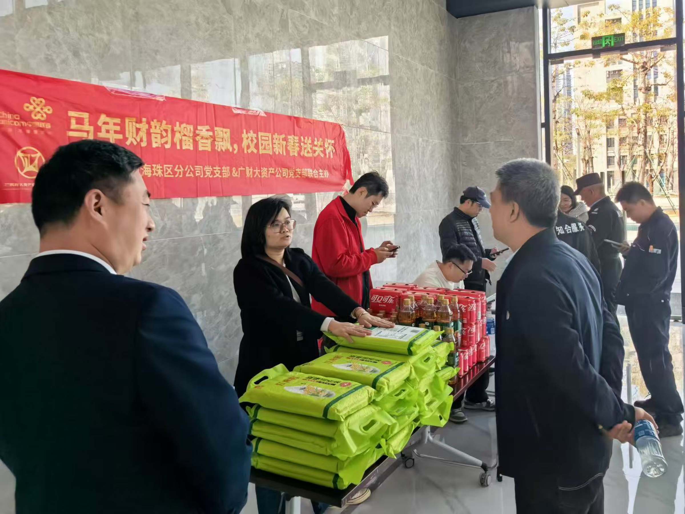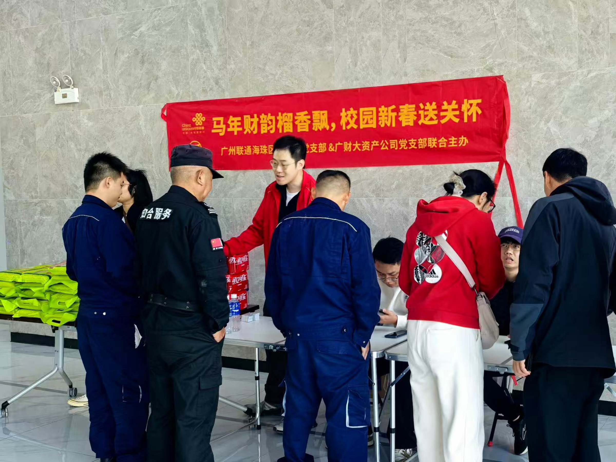 2月2日,广东财大资产经营有限公司党支部与广州联通海珠区分公司党支部在产教大楼A座大堂联合开展“马年财韵榴香飘,校园新春送关怀”主题党日活动,向校园后勤、安保、保洁等一线职工送上新春祝福与暖心关怀。