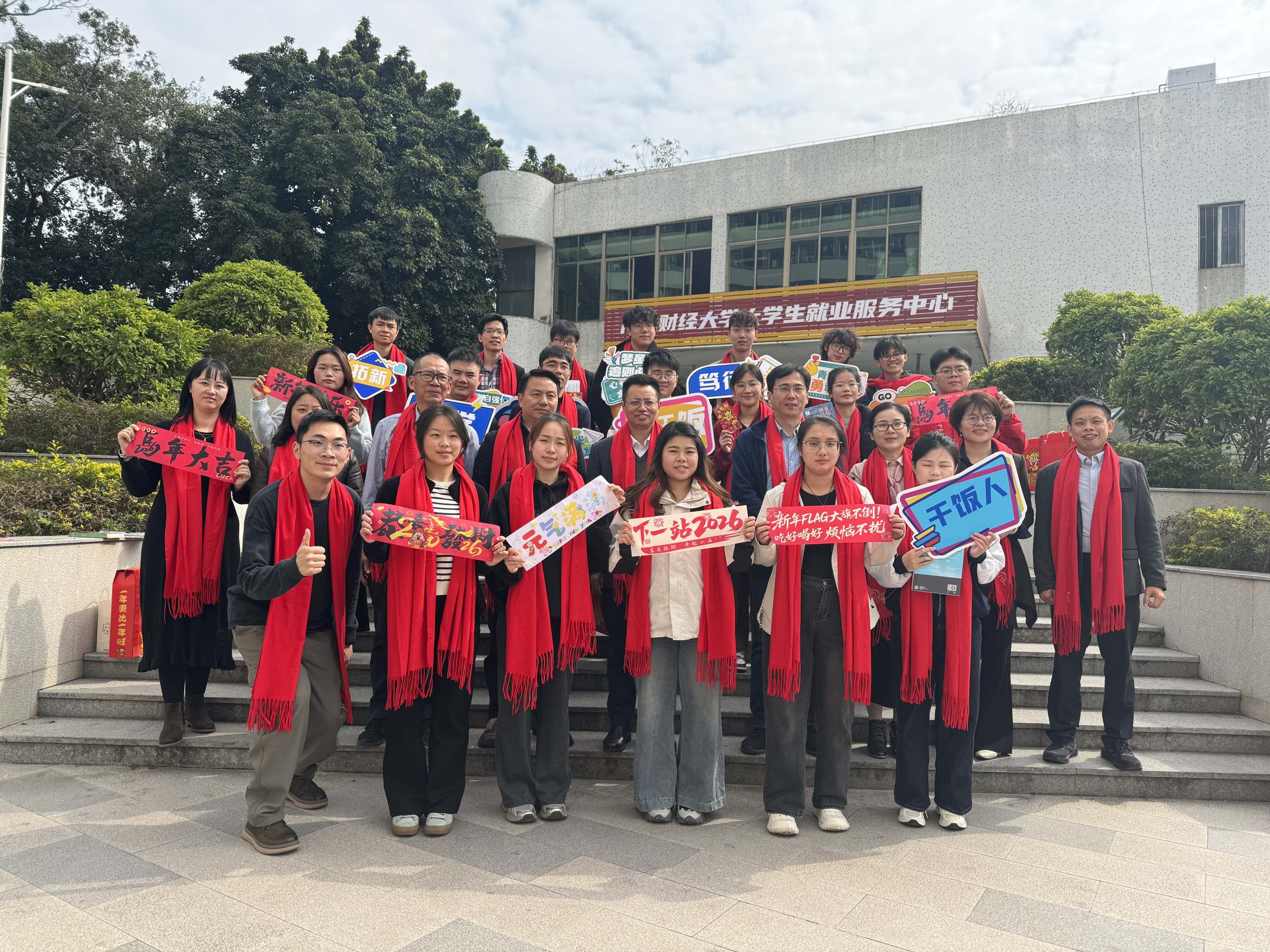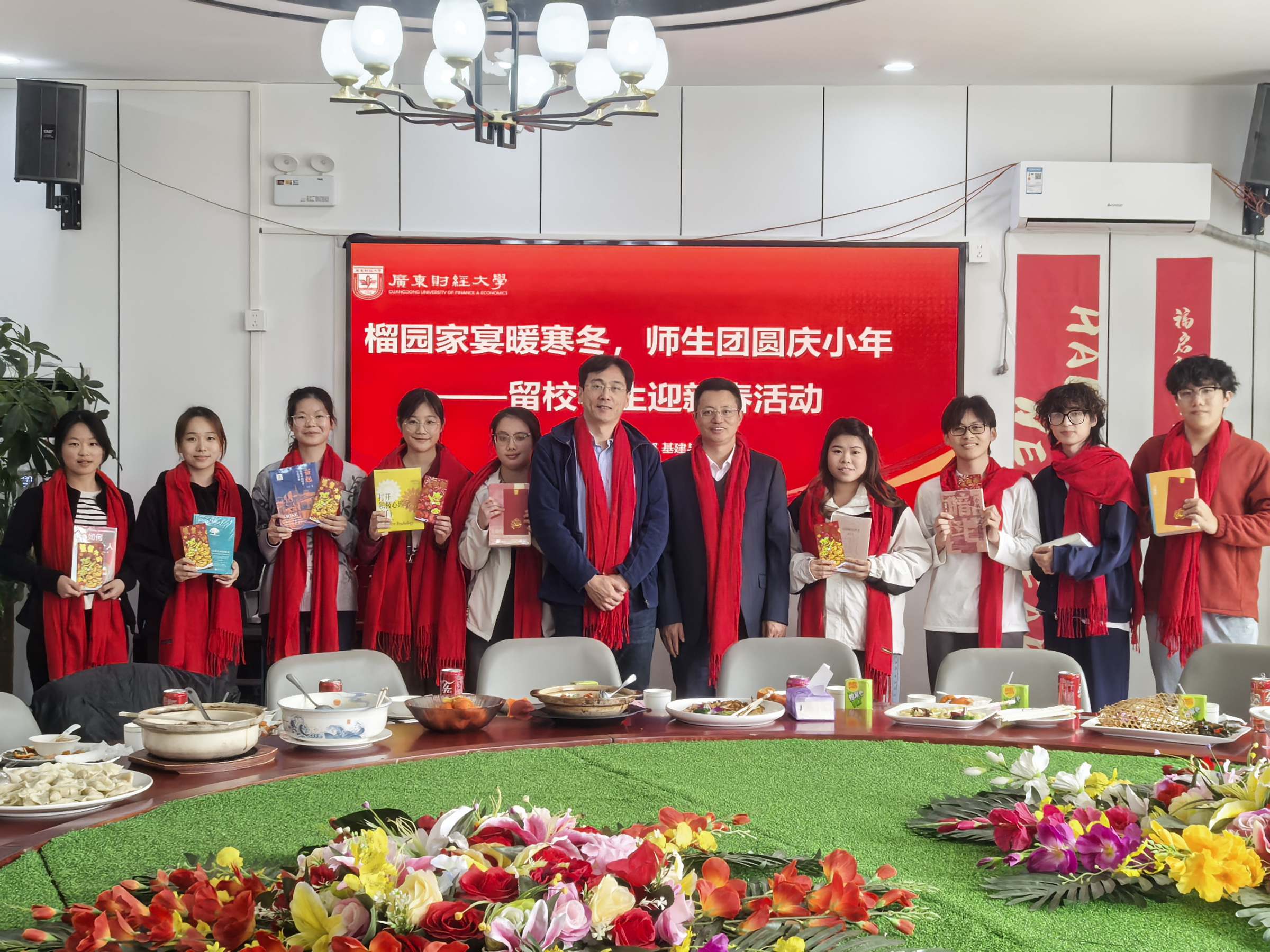 活动期间,童士清、张凯为留校学生派发了新年红包、书籍和学校文创产品等慰问品。师生还相互佩戴红围巾、互道祝福,寓意新的一年龙马精神、红红火火。