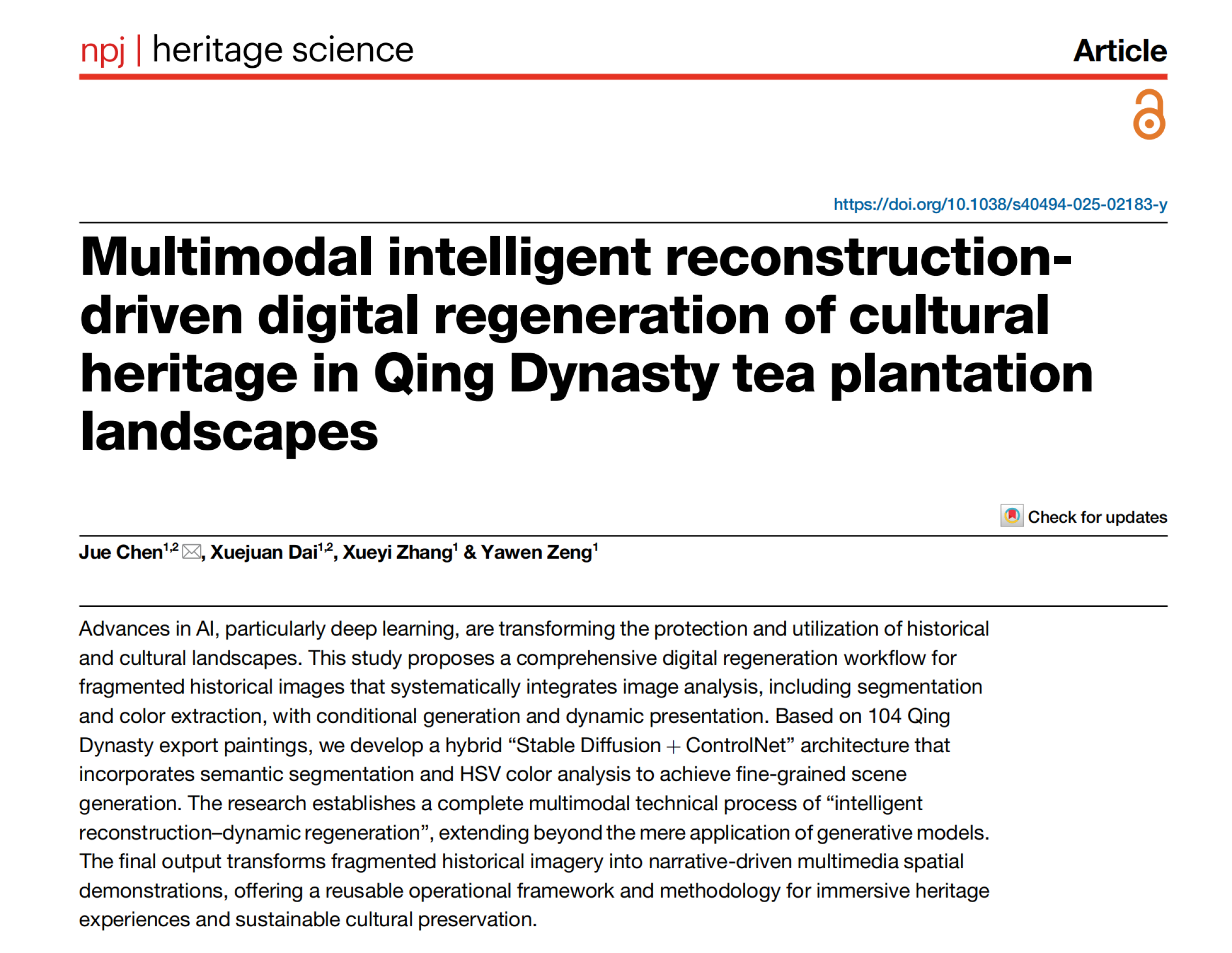 近日,我校艺术与设计学院王少斌教授领衔的“粤商文化遗产数字化团队”在人工智能与文化遗产融合研究方面取得新进展。团队研究成果《Multimodal intelligent reconstruction-driven digital regeneration of cultural heritage in Qing Dynasty tea plantation landscapes》于近日发表于Nature旗下国际文化遗产领域权威期刊《npj Heritage Science》。