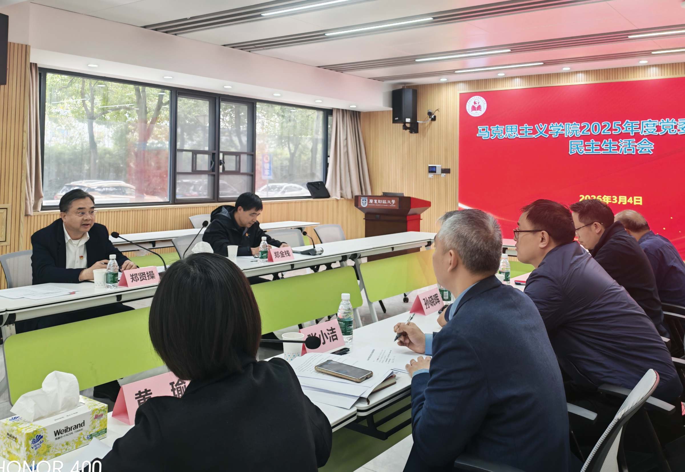 郑贤操结合马克思主义学院未来改革发展,就扎实做好民主生活会后半篇文章提出四点希望和要求。一是不断加强理论学习,进一步提高政治站位。在理论学习上要高标准、严要求、学在前、做示范,不断用党的创新理论武装头脑,更好落实立德树人根本任务。二是扎实开展树立和践行正确政绩观学习教育,力争取得扎实成效。要深刻认识开展树立和践行正确政绩观学习教育在纵深推进全面从严治党、推动“十五五”开好局起好步、端正党员干部作风等方面的重大意义,以高度的政治自觉抓好贯彻落实。三是细致抓好问题整改,确保取得扎实成效。要深入学习贯彻习近平总书记关于思政课建设的重要指示精神,加强课堂管理,提升课堂吸引力;深化《习近平新时代中国特色社会主义思想概论》《走在前列的广东实践》教学改革,用生动案例调动学生学习积极性。进一步凝练方向,加强年轻教师培育,引导教师沉下心做学问,力争产出标志性成果。开展好理论阐释、宣传宣讲、决策咨询和“行走湾区”社会实践,讲活讲好党的创新理论。四是继续弘扬优良作风,不断夯实班子建设。要推动作风建设常态化长效化,落实作风建设政治责任,以优良作风凝心聚力、真抓实干,推动马克思主义学院高质量发展,为建设大湾区一流财经大学作出更大贡献。