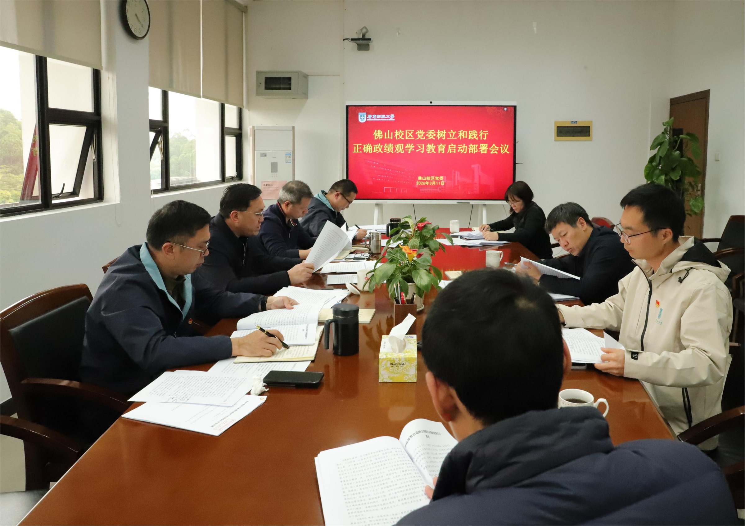 3月11日下午,佛山校区党委在厚德楼第二会议室召开2026年第2次佛山校区党委会会议,研究部署启动树立和践行正确政绩观学习教育工作。会议由佛山校区党委书记刘大鹏主持。佛山校区全体党委委员、各党支部书记及支部委员参加会议。