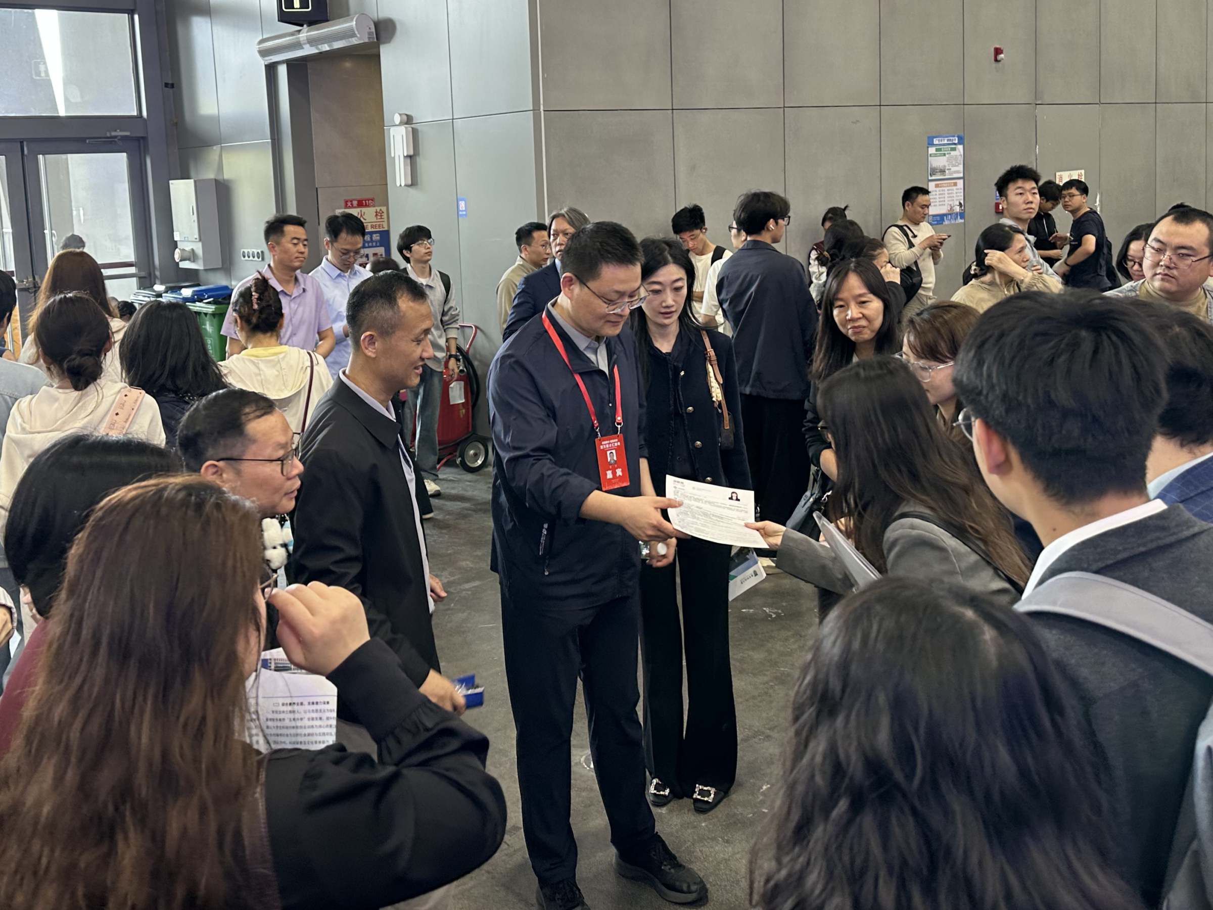 在招聘会现场,雷宇一行与参会的用人单位招聘人员进行交流,详细了解企业的岗位设置、人才需求和毕业生求职等情况,并与我校求职学子交谈,仔细询问学生简历投递情况和求职面试进展。学生就业指导中心和各学院在现场开展“访企拓岗”行动,派发2026届毕业生就业推荐材料,向用人单位推荐我校毕业生。