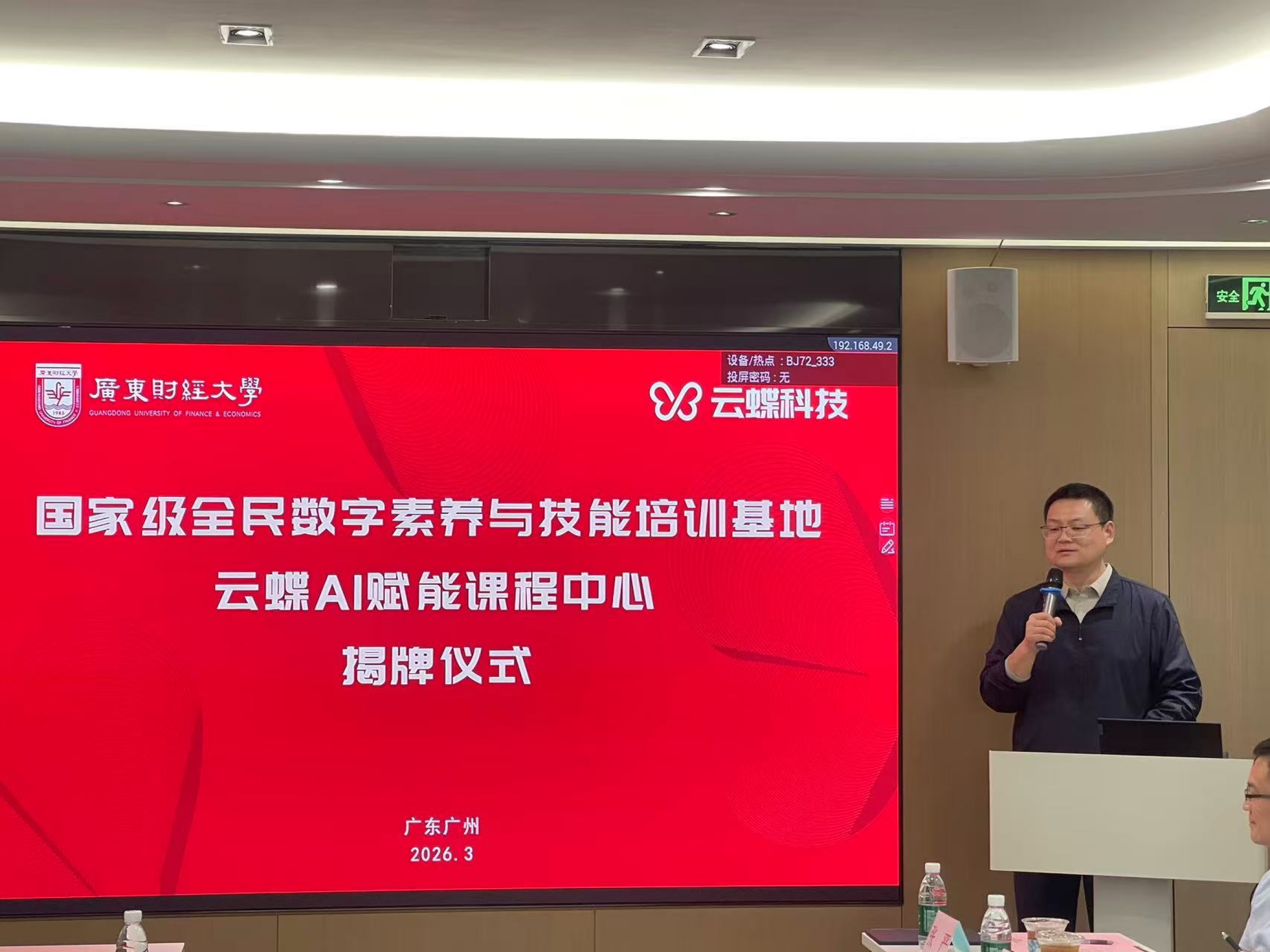 随后,国家级全民数字素养与技能培训基地云蝶AI赋能课程中心正式揭牌。该中心依托广东财经大学在继续教育、数字素养培训方面的学科积淀,以及云蝶科技在人工智能、大数据领域的技术优势,由校企双方联合打造,将为提升全民数字素养教育的适应力与创造力筑牢根基。