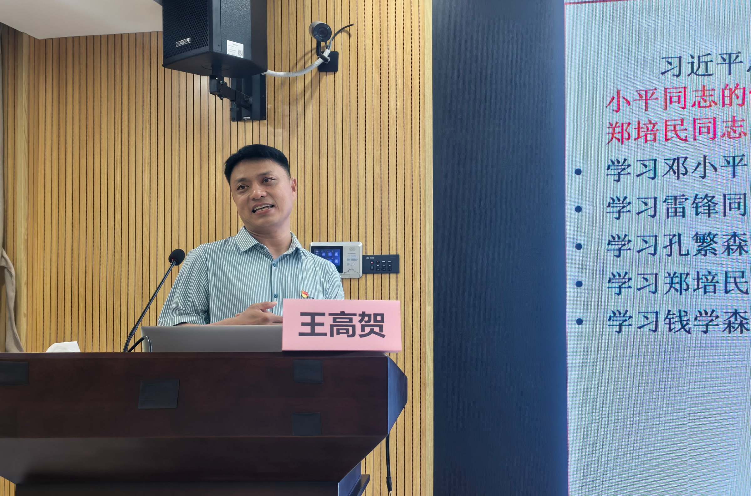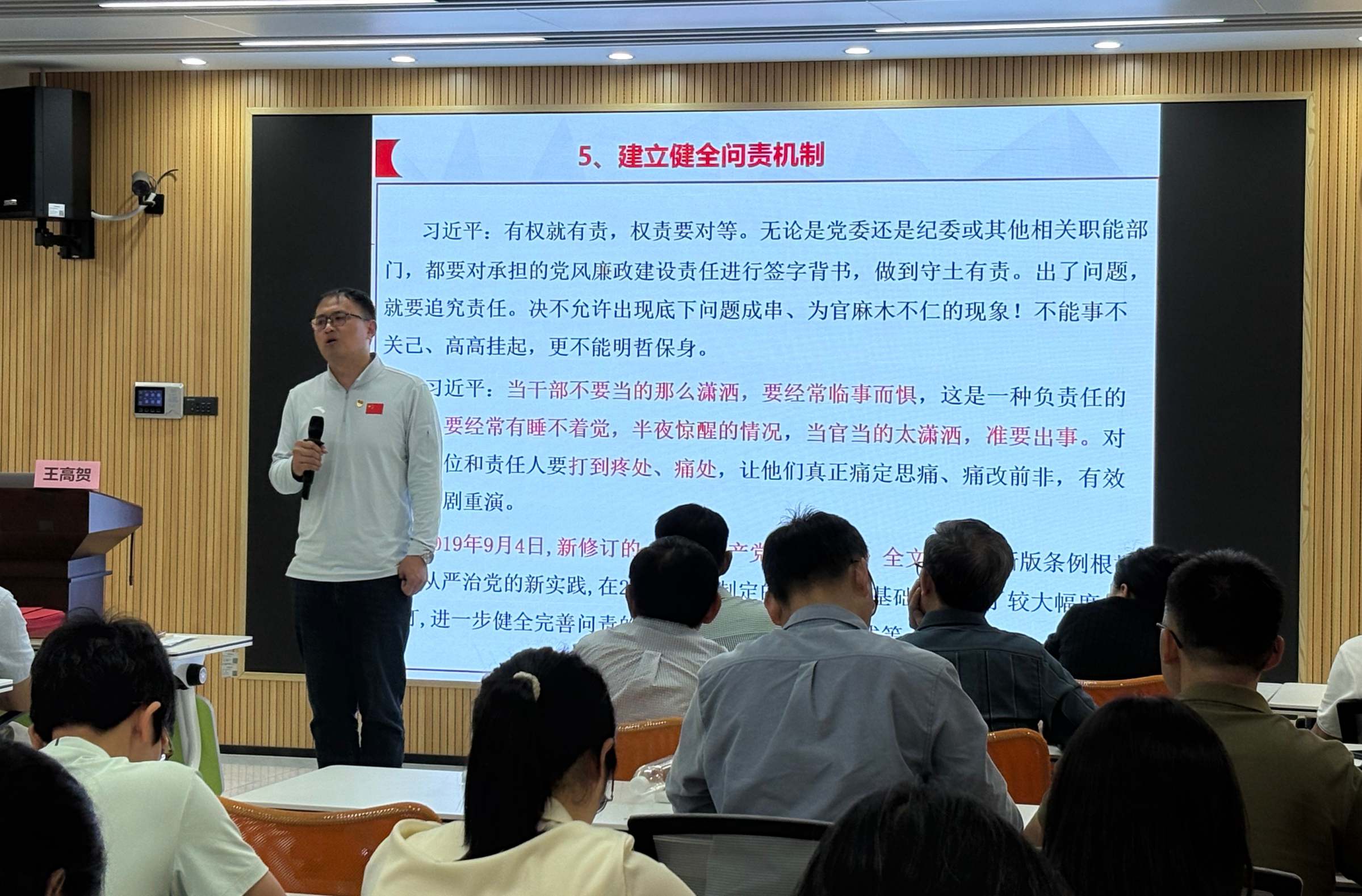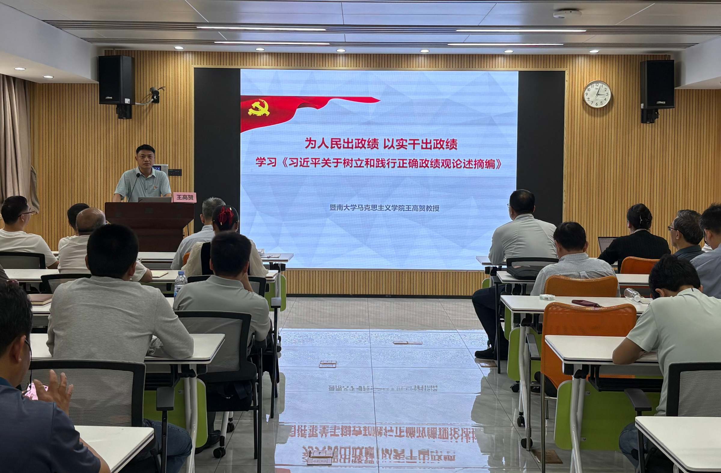 王高贺教授从“政绩为谁而树、树什么样的政绩、靠什么树政绩”三个维度,结合丰富的案例进行深刻阐释,为全体与会人员上了一堂生动的理论课。围绕“政绩为谁而树”,他强调信仰是政绩观的根本,党员需坚守对党忠诚的初心,做好民生实事、攻坚难事、长远好事,以清白底色、群众福祉留下真正政绩。关于“树什么样的政绩”,他强调,党员干部要统筹好显绩与潜绩、眼前与长远等四大关系,既办好群众可感的实事,也做好利长远的铺垫,杜绝“新官不理旧账”现象,立足全局谋划发展。在“靠什么树政绩”方面,他强调,要以党性为根基,增强党性观念;以能力为支撑,提升执政本领;以制度为保障,完善考核评价体系。