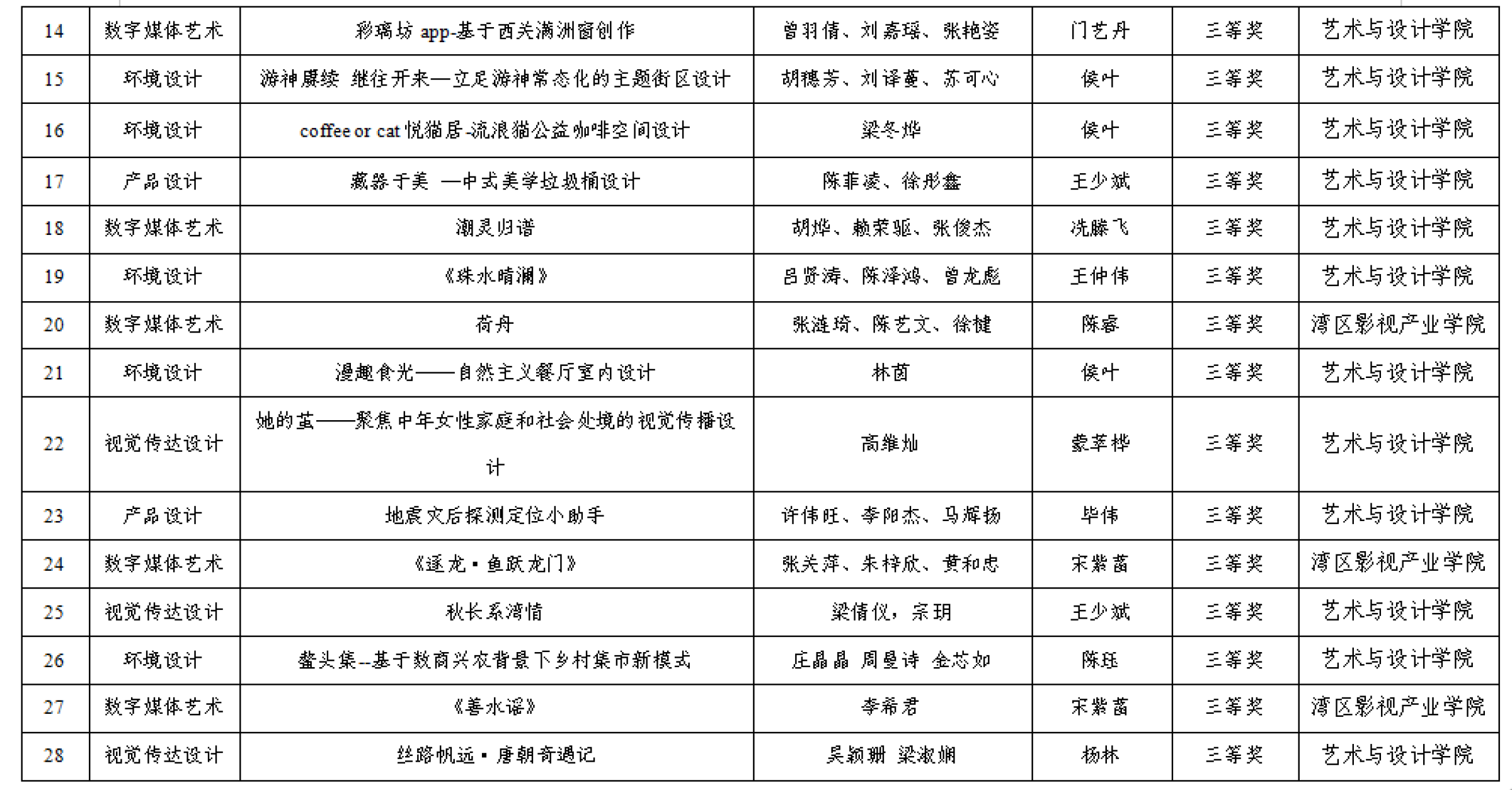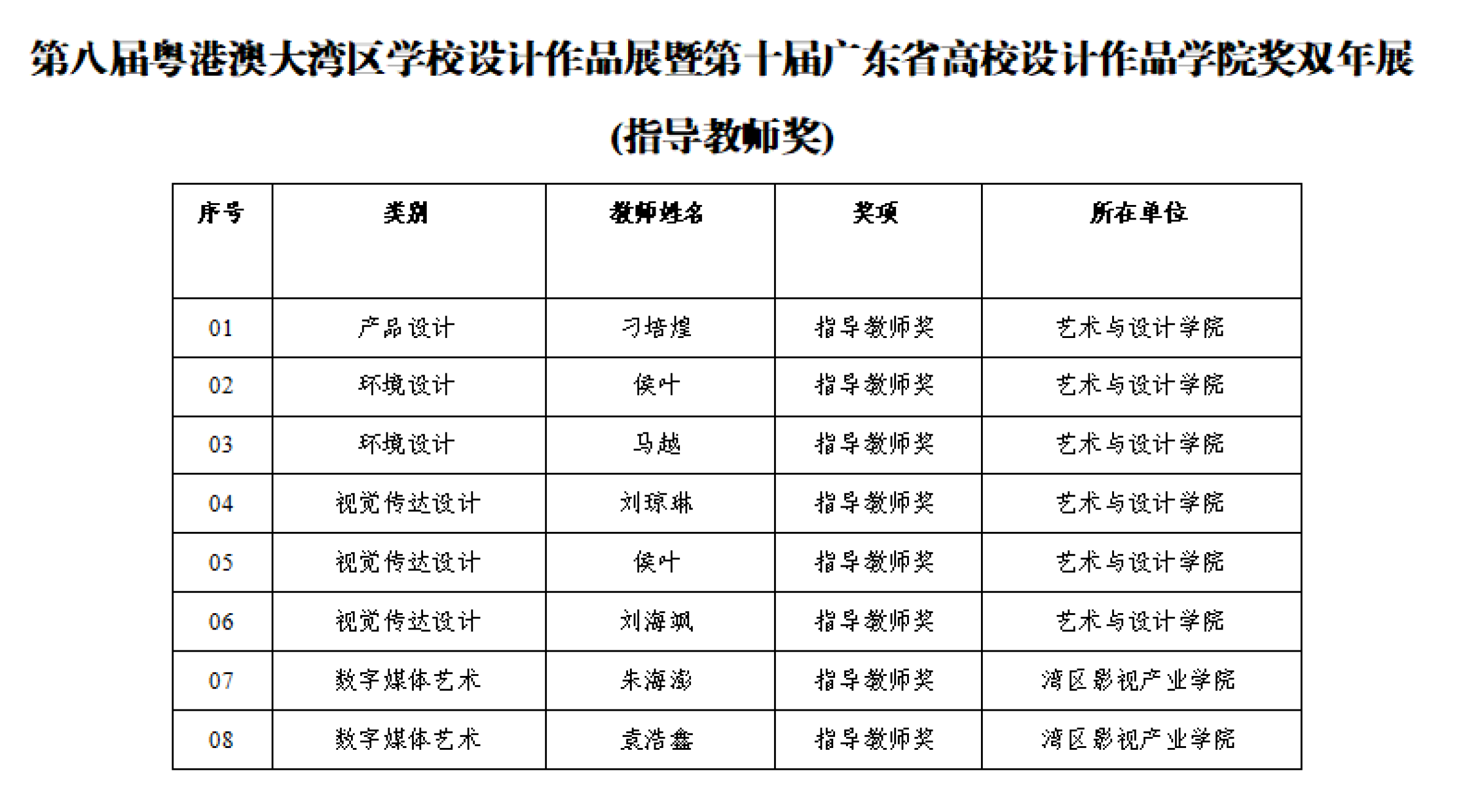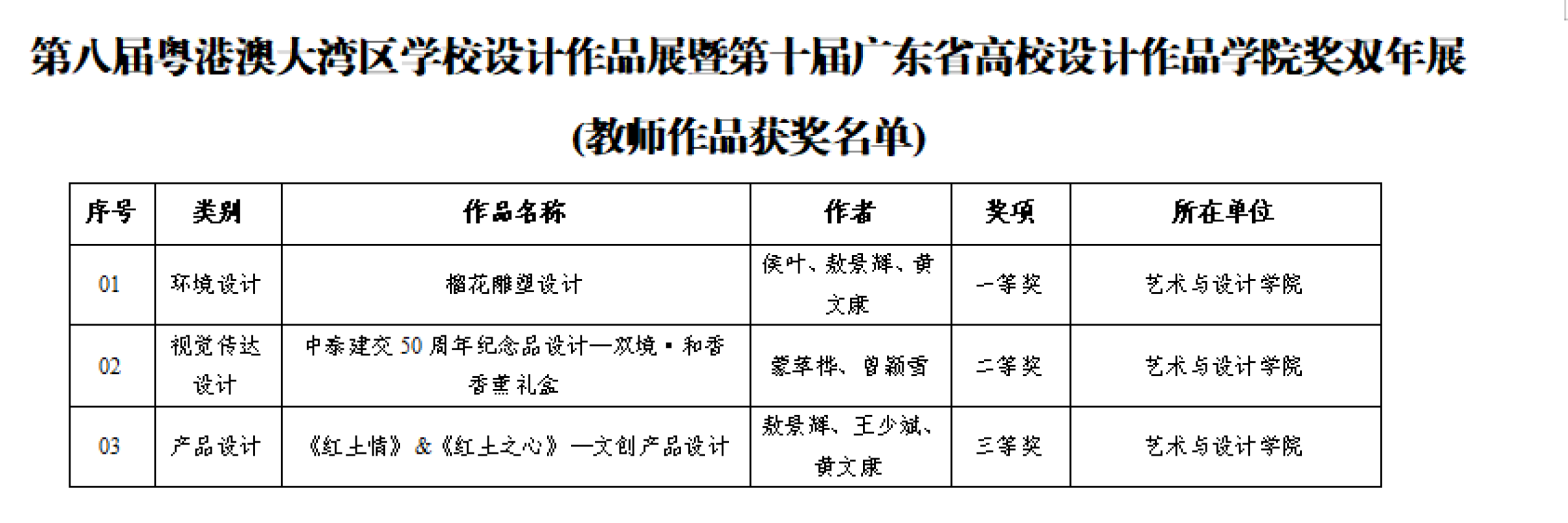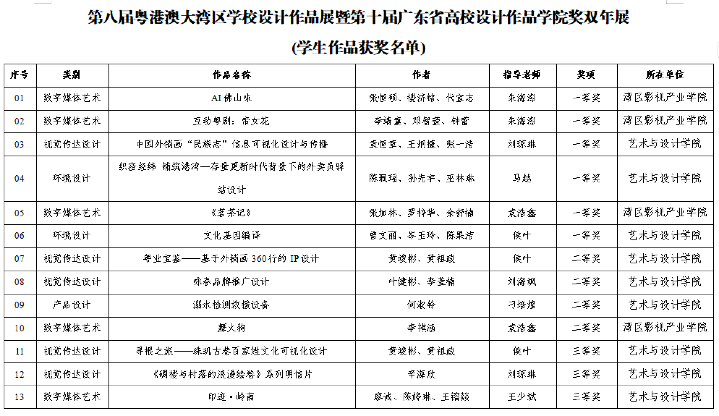 在第八届粤港澳大湾区学校设计作品展暨第十届广东省高校设计作品学院奖双年展中,我校师生在产品设计、环境设计、视觉传达设计、数字媒体艺术等多个类别中均有获奖。其中,教师组荣获一等奖1项、二等奖1项、三等奖1项;学生组荣获一等奖6项、二等奖4项、三等奖18项。